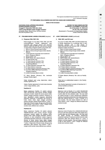 01020304050607 Consolidated Financial Statements Laporan Keaungan Konsolidasian PT Pertamina Hulu Energi 799The original consolidated financial statement included hereinare in Indonesian language.PT PERTAMINA HULU ENERGI DAN ENTITAS ANAK/AND SUBSIDIARIESDaftar 5/135 ScheduleCATATAN ATAS LAPORAN KEUANGANKONSOLIDASIAN (lanjutan)Tanggal 31 Desember 2024 dan untukTahun yang Berakhir pada Tanggal Tersebut(Disajikan dalam Ribuan Dolar Amerika Serikat,Kecuali Dinyatakan Lain)NOTES TO THE CONSOLIDATEDFINANCIAL STATEMENT (continued)As of December 31, 2024 andfor the Year Then Ended(Expressed in Thousands of United States Dollars,Unless Otherwise Stated)27. PINJAMAN BANK JANGKA PANJANG (lanjutan) 27. LONG TERM BANK LOANS (continued)3. Pinjaman PHE, PEP, PHI 3. PHE, PEP, and PHI LoanPada tanggal 10 Juni 2022, PHE, PEP, dan PHImenandatangani Facility Agreement atascorporate loan dengan skema joint borrowersebesar AS$2.500.000.000 (nilai penuh) dengan13 (tiga belas) Original Lenders yang terdiri dari:1. Bank of China (Hong Kong) Limited;2. Bank of China (Hong Kong) Limited JakartaBranch;3. Credit Agricole Corporate and Investment Bank, Singapore Branch;4. Mizuho Bank, Ltd;5. MUFG Bank, Ltd, Jakarta Branch;6. PT Bank BTPN Tbk;7. PT Bank Mandiri (Persero) Tbk;8. PT Bank Mandiri (Persero) Tbk, Hong Kong Branch;9. PT Bank Maybank Indonesia Tbk;10. PT Bank Mizuho Indonesia;11. PT Bank Negara Indonesia (Persero) Tbk.;12. Sumitomo Mitsui Banking Corporation, Singapore Branch;13. United Overseas Bank Limited.On June 10, 2022, PHE, PEP, and PHI entered intoa Facility Agreement of a corporate loan in jointborrower scheme with a total facility ofUS$2,500,000,000 (full amount) with 13 (thirteen)Original Lenders as follows:1. Bank of China (Hong Kong) Limited;2. Bank of China (Hong Kong) Limited Jakarta Branch;3. Credit Agricole Corporate and Investment Bank, Singapore Branch;4. Mizuho Bank, Ltd;5. MUFG Bank, Ltd, Jakarta Branch;6. PT Bank BTPN Tbk;7. PT Bank Mandiri (Persero) Tbk;8. PT Bank Mandiri (Persero) Tbk, Hong Kong Branch;9. PT Bank Maybank Indonesia Tbk;10. PT Bank Mizuho Indonesia;11. PT Bank Negara Indonesia (Persero) Tbk.;12. Sumitomo Mitsui Banking Corporation, Singapore Branch;13.United Overseas Bank Limited.PT Bank Mandiri (Persero) Tbk. bertindaksebagai Facility Agent.Tidak terdapat aset yang dijaminkan dalamFacility Agreement ini.PT Bank Mandiri (Persero) Tbk. acts as FacilityAgent.There are no collateralized assets in this FacilityAgreement.Dalam Facility Agreement ini terdiri atas tranchesuntuk 3 (tiga) fasilitas, yaitu:This Facility Agreement consists of tranches for 3(three) facilities as follows:Fasilitas A1 Facility A1Batas maksimum Fasilitas A1 adalah sebesarAS$1.700.000.000 (nilai penuh) dengan tanggalpelunasan terakhir adalah 60 (enam puluh) bulansetelah tanggal penarikan pertama. Pinjaman iniakan dibayarkan melalui angsuran (amortizedpayment) sebanyak 9 (sembilan) kali dimulai dibulan kedua belas sejak tanggal penarikanpertama dengan Interest Period selama 1 (satu), 3(tiga) atau 6 (enam) bulan. Bunga yang dikenakanyaitu sebesar Term SOFR + CAS + margin untuksumber dana offshore dan onshore.Maximum limit of Facility A1 is US$1,700,000,000(full amount) with final repayment date of 60 (sixty)months after the first utilisation date. The loan shallbe repaid through 9 (nine) semiannual instalmentstarting 12 (twelve) months from the initial drawdowndate with Interest Period of 1 (one), 3 (three), or 6(six) months. The loan bears interest at a rate ofTerm SOFR + CAS + margin for offshore lender andonshore lender.Fasilitas A2 Facility A2Batas maksimum Fasilitas A2 adalah sebesarAS$400.000.000 (nilai penuh) dengan tanggalpelunasan terakhir adalah 84 (delapan puluhempat) bulan sejak tanggal penarikan pertama.Pinjaman ini akan dibayarkan melalui angsuran(amortized payment) sebanyak 13 (tiga belas) kalidimulai di bulan kedua belas sejak tanggalpenarikan pertama dengan Interest Period selama1 (satu), 3 (tiga) atau 6 (enam) bulan. Bunga yangdikenakan yaitu sebesar Term SOFR + CAS +margin untuk sumber dana offshore dan onshore.Maximum limit of Facility A2 is US$400,000,000 (fullamount) with final repayment date of 84 (eighty-four)months after the first utilisation date. The loan shallbe repaid through 13 (thirteen) semiannualinstalment starting 12 (twelve) months from the initialdrawdown date with Interest Period of 1 (one), 3(three), or 6 (six) months. The loan bears interest ata rate of Term SOFR + CAS + margin for offshorelender and onshore lender.