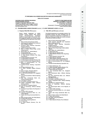 01020304050607 Consolidated Financial Statements Laporan Keaungan Konsolidasian PT Pertamina Hulu Energi 801The original consolidated financial statement included hereinare in Indonesian language.PT PERTAMINA HULU ENERGI DAN ENTITAS ANAK/AND SUBSIDIARIESDaftar 5/137 ScheduleCATATAN ATAS LAPORAN KEUANGANKONSOLIDASIAN (lanjutan)Tanggal 31 Desember 2024 dan untukTahun yang Berakhir pada Tanggal Tersebut(Disajikan dalam Ribuan Dolar Amerika Serikat,Kecuali Dinyatakan Lain)NOTES TO THE CONSOLIDATEDFINANCIAL STATEMENT (continued)As of December 31, 2024 andfor the Year Then Ended(Expressed in Thousands of United States Dollars,Unless Otherwise Stated)27. PINJAMAN BANK JANGKA PANJANG (lanjutan) 27.LONG TERM BANK LOANS (continued)3. Pinjaman PHE, PEP, PHI (lanjutan) 3. PHE, PEP, and PHI Loan (continued)Skema Facility Agreement ini adalahsindikasi. Proses sindikasi telah selesaidengan ditandatanganinya SyndicationAgreement pada tanggal 14 September 2022.Per tanggal 28 Februari 2023, jumlah Lendersmenjadi sebanyak 36 (tiga puluh enam) bank,yaitu:1. Bank of China (Hong Kong) Limited;2. Credit Agricole Corporate and InvestmentBank, Singapore Branch;3. Sumitomo Mitsui Banking CorporationSingapore Branch;4. United Overseas Bank Limited;5. Bank of China (Hong Kong) LimitedJakarta Branch;6. MUFG Bank, Ltd., Jakarta Branch;7. PT Bank BTPN Tbk;8. PT Bank Mandiri (Persero) Tbk;9. PT Bank Mandiri (Persero) Tbk, HongKong Branch;10. PT Bank Maybank Indonesia, Tbk;11. PT Bank Mizuho Indonesia;12. PT Bank Negara Indonesia (Persero) Tbk;13. Bank of China Limited, Singapore Branch;14. Bank of Communications Co., Ltd,Singapore Branch;15. Oversea-Chinese Banking CorporationLtd;16. PT Bank KB Bukopin, Tbk;17. PT Bank Tabungan Negara (Persero)Tbk;18. Bank of Taiwan, Singapore Branch;19. PT Bank KEB Hana Indonesia;20. E. Sun Commercial Bank, Ltd., SingaporeBranch;21. First Commercial Bank, Offshore BankingBranch;22. Hua Nan Commercial Bank, Ltd.,Offshore Banking Branch;23. Land Bank of Taiwan;24. Far Eastern International Bank, Ltd.;25. Taiwan Cooperative Bank, OffshoreBanking Branch;26. Arab Bank plc, Singapore Branch;27. Bank of Kaohsiung, Offshore BankingBranch;28. The Export-Import Bank of the Republic ofChina;29. PT Bank ICBC Indonesia;30. Taichung Commercial Bank Co., Ltd.Labuan Branch;31. Taiwan Shin Kong Commercial Bank Co.,Ltd.;32. Bank of China Limited, Abu Dhabi Branch;33. PT Bank SBI Indonesia;34. UCO Bank, Hong Kong Branch;35. PT Bank DKI;36. PT Bank Mandiri (Persero) Tbk, DiliBranchThis Facility Agreement is in syndication scheme. Thesyndication process has been completed with thesigning of Syndication Agreement on September 14,2022. As of February 28, 2023, the Lenders consistedof 36 (thirty six) banks as follows:1. Bank of China (Hong Kong) Limited;2. Credit Agricole Corporate and InvestmentBank, Singapore Branch;3. Sumitomo Mitsui Banking CorporationSingapore Branch;4. United Overseas Bank Limited;5. Bank of China (Hong Kong) Limited JakartaBranch;6. MUFG Bank, Ltd., Jakarta Branch;7. PT Bank BTPN Tbk;8. PT Bank Mandiri (Persero) Tbk;9. PT Bank Mandiri (Persero) Tbk, Hong KongBranch;10. PT Bank Maybank Indonesia, Tbk;11. PT Bank Mizuho Indonesia;12. PT Bank Negara Indonesia (Persero) Tbk;13. Bank of China Limited, Singapore Branch;14. Bank of Communications Co., Ltd, SingaporeBranch;15. Oversea-Chinese Banking Corporation Ltd;16. PT Bank KB Bukopin, Tbk;17. PT Bank Tabungan Negara (Persero) Tbk;18. Bank of Taiwan, Singapore Branch;19. PT Bank KEB Hana Indonesia;20. E. Sun Commercial Bank, Ltd., SingaporeBranch;21. First Commercial Bank, Offshore BankingBranch;22. Hua Nan Commercial Bank, Ltd., OffshoreBanking Branch;23. Land Bank of Taiwan;24. Far Eastern International Bank, Ltd.;25. Taiwan Cooperative Bank, Offshore BankingBranch;26. Arab Bank plc, Singapore Branch;27. Bank of Kaohsiung, Offshore BankingBranch;28. The Export-Import Bank of the Republic ofChina;29. PT Bank ICBC Indonesia;30. Taichung Commercial Bank Co., Ltd. LabuanBranch;31. Taiwan Shin Kong Commercial Bank Co.,Ltd.;32. Bank of China Limited, Abu Dhabi Branch;33. PT Bank SBI Indonesia;34. UCO Bank, Hong Kong Branch;35. PT Bank DKI;36. PT Bank Mandiri (Persero) Tbk, Dili Branch