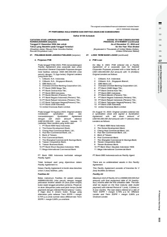 01020304050607 Consolidated Financial Statements Laporan Keaungan Konsolidasian PT Pertamina Hulu Energi 803The original consolidated financial statement included hereinare in Indonesian language.PT PERTAMINA HULU ENERGI DAN ENTITAS ANAK/AND SUBSIDIARIESDaftar 5/139 ScheduleCATATAN ATAS LAPORAN KEUANGANKONSOLIDASIAN (lanjutan)Tanggal 31 Desember 2024 dan untukTahun yang Berakhir pada Tanggal Tersebut(Disajikan dalam Ribuan Dolar Amerika Serikat,Kecuali Dinyatakan Lain)NOTES TO THE CONSOLIDATEDFINANCIAL STATEMENT (continued)As of December 31, 2024 andfor the Year Then Ended(Expressed in Thousands of United States Dollars,Unless Otherwise Stated)27. PINJAMAN BANK JANGKA PANJANG (lanjutan) 27. LONG TERM BANK LOANS (continued)4. Pinjaman PHE 4. PHE LoanPada tanggal 9 Mei 2023, PHE menandatanganiFacility Agreement atas corporate loan untukkebutuhan General Corporate Purposes dengantotal fasilitas sebesar AS$1.500.000.000 (nilaipenuh) dengan 13 (tiga belas) Original Lendersyang terdiri dari:1. Citibank, N.A. Indonesia;2. Citibank, N.A., Singapore Branch;3. DBS Bank Ltd.;4. Oversea-Chinese Banking Corporation Ltd.;5. PT Bank CIMB Niaga Tbk.;6. PT Bank Central Asia Tbk.;7. PT Bank DBS Indonesia;8. PT Banki Mandiri (Persero) Tbk.;9. PT Bank Negara Indonesia (Persero) Tbk.;10. PT Bank Rakyat Indonesia (Persero) Tbk.;11. PT Bank Tabungan Negara(Persero) Tbk.;12. PT Bank UOB Indonesia;13. United Overseas Bank Limited.Pada tanggal 10 Agustus 2023, Original Lendersmelakukan syndication close danmenandatangani Syndication Agreementdengan sell down amount sebesarAS$150.000.000 (nilai penuh) kepada 11(sebelas) New Lenders yang terdiri dari:1. PT Bank KEB Hana Indonesia;2. The Korea Development Bank;3. Chang Hwa Commercial Bank, Ltd.;4. Hua Nan Commercial Bank, Ltd.;5. Bank of Taiwan;6. First Commercial Bank;7. The Shanghai Commercial & Savings Bank;8. Taiwan Cooperative Bank;9. Taiwan Business Bank;10. PT Bank Woori Saudara Indonesia 1906;11.Mega International Commercial BankOn May 9, 2023, PHE entered into a FacilityAgreement of a corporate loan for GeneralCorporate Purposes proceed with a total facility ofUS$1,500,000,000 (full amount) with 13 (thirteen)Original Lenders as follows:1. Citibank, N.A. Indonesia;2. Citibank, N.A., Singapore Branch;3. DBS Bank Ltd.;4. Oversea-Chinese Banking Corporation Ltd.;5. PT Bank CIMB Niaga Tbk.;6. PT Bank Central Asia Tbk.;7. PT Bank DBS Indonesia;8. PT Bank Mandiri (Persero) Tbk.;9. PT Bank Negara Indonesia (Persero) Tbk.;10. PT Bank Rakyat Indonesia (Persero) Tbk.;11. PT Bank Tabungan Negara(Persero) Tbk.;12. PT Bank UOB Indonesia;13. United Overseas Bank Limited.On August 10, 2023, Original Lenders entered intoa syndication close and signed a SyndicationAgreement with sell down amount ofUS$150,000,000 (full amount) with 11 (eleven) NewLenders as follows:1. PT Bank KEB Hana Indonesia;2. The Korea Development Bank;3. Chang Hwa Commercial Bank, Ltd.;4. Hua Nan Commercial Bank, Ltd.;5. Bank of Taiwan;6. First Commercial Bank;7. The Shanghai Commercial & Savings Bank;8. Taiwan Cooperative Bank;9. Taiwan Business Bank;10. PT Bank Woori Saudara Indonesia 1906;11. Mega International Commercial BankPT Bank DBS Indonesia bertindak sebagaiFacility Agent.Tidak terdapat aset yang dijaminkan dalamFacility Agreement ini.PT Bank DBS Indonesia acts as Facility Agent.There are no collateralized assets in this FacilityAgreement.Dalam Facility Agreement ini terdiri atas tranchesuntuk 2 (dua) fasilitas, yaitu:This Facility Agreement consists of tranches for 2(two) facilities as follows:Fasilitas A2 Facility A2Batas maksimum Fasilitas A2 adalah sebesarAS$980.000.000 (nilai penuh) dengan tanggalpelunasan terakhir adalah 24 (dua puluh empat)bulan sejak tanggal penarikan pertama. Pinjamanini akan dibayarkan pada saat jatuh tempo (bulletpayment) dengan Interest Period selama 1 (satu),3 (tiga) atau 6 (enam) bulan. Bunga yangdikenakan yaitu sebesar Term SOFR + margin0,75% p.a untuk sumber dana offshore dan TermSOFR + margin 0,85% p.a onshore.Maximum limit of Facility A2 is US$980,000,000 (fullamount) with final repayment date of 24 (twentyfour) months after the first utilisation date. The loanshall be repaid on the final maturity date (bulletpayment) with Interest Period of 1 (one), 3 (three) or6 (six) months. The loan bears interest at a rate ofTerm SOFR + margin 0,75% p.a for OffshoreLender and Term SOFR + margin 0,85% p.aOnshore Lender.