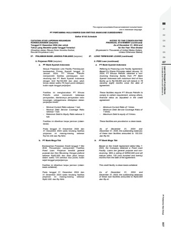 01020304050607 Consolidated Financial Statements Laporan Keaungan Konsolidasian PT Pertamina Hulu Energi 807The original consolidated financial statement included hereinare in Indonesian language.PT PERTAMINA HULU ENERGI DAN ENTITAS ANAK/AND SUBSIDIARIESDaftar 5/143 ScheduleCATATAN ATAS LAPORAN KEUANGANKONSOLIDASIAN (lanjutan)Tanggal 31 Desember 2024 dan untukTahun yang Berakhir pada Tanggal Tersebut(Disajikan dalam Ribuan Dolar Amerika Serikat,Kecuali Dinyatakan Lain)NOTES TO THE CONSOLIDATEDFINANCIAL STATEMENT (continued)As of December 31, 2024 andfor the Year Then Ended(Expressed in Thousands of United States Dollars,Unless Otherwise Stated)27. PINJAMAN BANK JANGKA PANJANG (lanjutan) 27. LONG TERM BANK LOANS (continued)5. Pinjaman PDSI (lanjutan) 5. PDSI Loan (continued)a. PT Bank Syariah Indonesia a. PT Bank Syariah IndonesiaSesuai Perjanjian Line Facility Pembiayaanberdasarkan Prinsip Syariah tanggal 10Januari 2024, PT Elnusa Petrofinmemperoleh fasilitas pembiayaan nonrevolving dari PT Bank Syariah Indonesiadengan limit Rp155.000 dan akan jatuhtempo dalam waktu 78 (tujuh puluh delapan)bulan sejak tanggal perjanjian.Refering to Financing Line Facility Agreement.Based On Sharia Principles dated January 10,2024, PT Elnusa Petrofin obtained a nonrevolving financing facility from PT BankSyariah Indonesia with maximum limit of thusfacility up to Rp155,000 and will mature in 78(seventy eight) months since the date ofagreement.Fasilitas ini mengharuskan PT ElnusaPetrofin untuk memenuhi beberapapersyaratan, diantaranya persyaratan rasiokeuangan sebagaimana ditetapkan dalamperjanjian kredit:These facilities require PT Elnusa Petrofin tocomply to certain requirement, among others,financial ratios as stipulated in the creditagreement:- Minimal Current Ratio sebesar 1 kali.- Minimal Debt Service Coverage Ratiosebesar 1 kali.- Maksimal Debt to Equity Ratio sebesar 3kali.- Minimum Current Ratio of 1 times.- Minimum Debt Service Coverage Ratio of1 times.- Maximum Debt to equity of 3 times.Fasilitas ini diberikan tanpa jaminan (cleanbasis).These facilities are provided on a clean-basis.Pada tanggal 31 Desember 2024 dan31 Desember 2023 saldo terutang fasilitaspinjaman ini masing-masing sebesarRp132.233 dan Rp Nihil.As of December 31, 2024 andDecember 31, 2023, the outstanding balancesof these loan facilities amounted to 132.233dan Rp Nil.b. PT Bank Mega Tbk b. PT Bank Mega TbkBerdasarkan Perjanjian Kredit tanggal 7 Mei2024 Perusahaan memperoleh FasilitasFixed Loan. Pinjaman bersifat generalpurpose dan Non Revolving. Dengan plafondsebesar Rp52.500 dan akan jatuh tempodalam waktu 120 (seratus dua puluh) bulansejak tanggal perjanjiannya.Fasilitas ini diberikan tanpa jaminan (cleanbasis collateral).Pada tanggal 31 Desember 2024 dan31 Desember 2023 saldo terutang fasilitaspinjaman ini masing-masing sebesarRp52.500 dan Rp Nihil.Based on the Credit Agreement dated May 7,2024, the Company obtained a Fixed LoanFacility. Loans are general purpose and nonrevolving. With a ceiling of IDR52,500 and willmature within 120 (one hundred and twenty)months from the date of the agreement.This credit facility is clean-basis collateral.As of December 31, 2024 andDecember 31, 2023, the outstanding balancesof these loan facilities amounted to Rp52,500dan Rp nil.