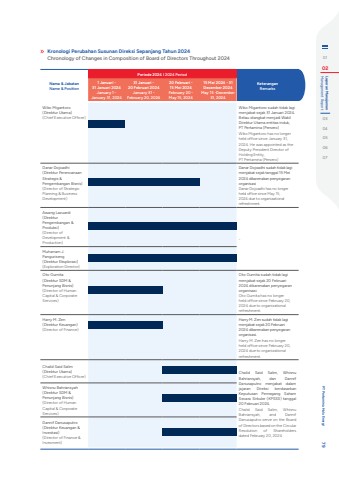 Kronologi Perubahan Susunan Direksi Sepanjang Tahun 2024Chronology of Changes in Composition of Board of Directors Throughout 2024Nama & JabatanName & PositionPeriode 2024 I 2024 PeriodKeteranganRemarks1 Januari - 31 Januari 2024January 1 - January 31, 202431 Januari - 20 Februari 2024January 31 - February 20, 202420 Februari - 15 Mei 2024February 20 - May 15, 2024 15 Mei 2024 - 31 Desember 2024May 15 -December 31, 2024Wiko Migantoro (Direktur Utama)(Chief Executive Officer)Wiko Migantoro sudah tidak lagi menjabat sejak 31 Januari 2024. Beliau diangkat menjadi Wakil Direktur Utama entitas induk, PT Pertamina (Persero)Wiko Migantoro has no longer held office since January 31, 2024. He was appointed as the Deputy President Director of Holding Entity, PT Pertamina (Persero)Danar Dojoadhi (Direktur Perencanaan Strategis & Pengembangan Bisnis)(Director of Strategic Planning & Business Development)Danar Dojoadhi sudah tidak lagi menjabat sejak tanggal 15 Mei 2024 dikarenakan penyegaran organisasiDanar Dojoadhi has no longer held office since May 15, 2024 due to organizational refreshment.Awang Lazuardi (Direktur Pengembangan & Produksi)(Director of Development & Production) -Muharram J. Panguriseng (Direktur Eksplorasi)(Exploration Director)Oto Gurnita (Direktur SDM & Penunjang Bisnis)(Director of Human Capital & Corporate Services)Oto Gurnita sudah tidak lagi menjabat sejak 20 Februari 2024 dikarenakan penyegaran organisasi. Oto Gurnita has no longer held office since February 20, 2024 due to organizational refreshment.Harry M. Zen (Direktur Keuangan)(Director of Finance)Harry M. Zen sudah tidak lagi menjabat sejak 20 Februari 2024 dikarenakan penyegaran organisasi.Harry M. Zen has no longer held office since February 20, 2024 due to organizational refreshment.Chalid Said Salim(Direktur Utama)(Chief Executive Officer)Chalid Said Salim, Whisnu Bahriansyah, dan Dannif Danusaputro menjabat dalam jajaran Direksi berdasarkan Keputusan Pemegang Saham Secara Sirkuler (KPSSS) tanggal 20 Februari 2024.Chalid Said Salim, Whisnu Bahriansyah, and Dannif Danusaputro serve on the Board of Directors based on the Circular Resolution of Shareholders dated February 20, 2024.Whisnu Bahriansyah(Direktur SDM & Penunjang Bisnis)(Director of Human Capital & Corporate Services)Dannif Danusaputro(Direktur Keuangan & Investasi)(Director of Finance & Invesment)0102 Management Report Laporan Manajemen0304050607Laporan Tahunan %u2022 Annual Report 78PT Pertamina Hulu Energi 79