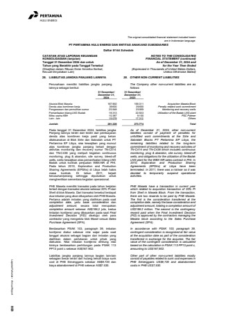 Laporan Tahunan %u2022 Annual Report 808HULU ENERGIThe original consolidated financial statement included hereinare in Indonesian language.PT PERTAMINA HULU ENERGI DAN ENTITAS ANAK/AND SUBSIDIARIESDaftar 5/144 ScheduleCATATAN ATAS LAPORAN KEUANGANKONSOLIDASIAN (lanjutan)Tanggal 31 Desember 2024 dan untukTahun yang Berakhir pada Tanggal Tersebut(Disajikan dalam Ribuan Dolar Amerika Serikat,Kecuali Dinyatakan Lain)NOTES TO THE CONSOLIDATEDFINANCIAL STATEMENT (continued)As of December 31, 2024 andfor the Year Then Ended(Expressed in Thousands of United States Dollars,Unless Otherwise Stated)28. LIABILITAS JANGKA PANJANG LAINNYA 28. OTHER NON-CURRENT LIABILITIESPerusahaan memiliki liabilitas jangka panjanglainnya sebagai berikut:The Company other non-current liabilities are asfollows: 31 Desember/ 31 Desember/December 31, December 31,2024 2023Akuisisi Blok Masela 167.902 159.311 Acquisition Masela BlockDenda atas komitmen kerja 39.600 39.600 Penalty related work commitmentPengawasan dan pemulihan sumur 25.948 25.959 Monitoring and recovery wellsPemanfaatan kilang LNG Badak 18.313 22.503 Utilization of the Badak LNG plantMitra usaha KBH 10.387 9.100 PSC PartnerLain - lain 19.078 17.312 OthersJumlah 281.228 273.774 TotalPada tanggal 31 Desember 2024, liabilitas jangkaPanjang lainnya terdiri dari terdiri dari pembayarandenda atas komitmen kerja pasti yang belumdilaksanakan di Blok Sirte dan Sabratah untuk PTPertamina EP Libya, sisa kewajiban yang munculatas komitmen jangka panjang terkait denganaktivitas monitoring dan recovery sumur TN-C414dan TN-C436 yang meliputi kegiatan continuousmonitoring, plug & abandon, site survey, bleed-offwells, serta kewajiban atas pemanfaatan kilang LNGBadak untuk kontrak penjualan WBX-NR di PHI.Pada tahun 2010, Exploration and ProductionSharing Agreements (EPSAs) di Libya telah habismasa kontrak. Di tahun 2011, terjadikerusuhan/perang sehingga diputuskan untukmenghentikan sementara kegiatan operasional.As of December 31, 2024, other non-currentliabilities consist of payment of penalties forunfulfilled work commitments at the Sirte andSabratah Blocks PT Pertamina EP Libya, theremaining liabilities related to the long-termcommitment of monitoring and recovery activities ofTN-C414 and TN-C436 which includes continuousmonitoring, plug & abandon, site survey, bleed-offwells, and obligations for the utilization of the BadakLNG plant for the WBX-NR sales contract in PHI. In2010, Exploration and Production SharingAgreements (EPSAs) at Libya have beenterminated. In 2011, there was a riot/war so it wasdecided to temporarily suspend operationalactivities.PHE Masela memiliki transaksi pada tahun berjalanterkait dengan transaksi akuisisi sebesar 20% PI dariShell di blok Masela. Dari transaksi tersebut terdapatdua imbalan yang akan dibayarkan oleh PHE Masela.Pertama adalah imbalan yang dialihkan pada saatcompletion date, yaitu base consideration danadjustment amount, secara total merupakancompletion amount sebesar AS$186,2 juta, keduaImbalan kontijensi yang dibayarkan pada saat FinalInvestment Decision (FID) disetujui oleh paracontractor yang mengelola blok Masel sesuai SalesPurchase Agreement (SPA).PHE Masela have a transaction in current yearwhich related to acquisiton transaction of 20% PIfrom Shell in Masela Block. From the transaction,there are two rewards to be paid by PHE Masela.The first is the consideration transferred at thecompletion date, namely the base consideration andadjustment amount, totaling a completion amount ofUS$186.2 million. The second is the contingencyreward paid when the Final Investment Decision(FID) is approved by the contractors managing theMasela block according to the Sales PurchaseAgreement (SPA).Berdasarkan PSAK 103, paragraph 39, imbalankontijensi diakui sebesar nilai wajar pada saattanggal akuisisi sebagai bagian dari imbalan yangdialihkan dalam pertukaran untuk pihak yangdiakuisisi. Nilai imbalan kontijensi dihitung nilaikininya berdasarkan perhitungan pada PSAK 113PP13 point c sebesar AS$167.902.In accordance with PSAK 103, paragraph 39,contingent consideration is recognized at fair valueat the acquisition date as part of the considerationtransferred in exchange for the acquiree. The fairvalue of the contingent consideration is calculatedbased on the calculation in PSAK 113 PP13 point c,amounting to US$167,902.Liabilitas jangka panjang lainnya bagian lain-lainsebagian besar terdiri dari hutang terkait biaya sunkcost di PHE Simenggaris sebesar AS$9.720 danbiaya abandonment di PHE sebesar AS$7.530.Other part of other non-current liabilities mostlyconsist of payables related to sunk cost expenses inPHE Simenggaris US$9,720 and abandonmentcosts in PHE US$7,530.