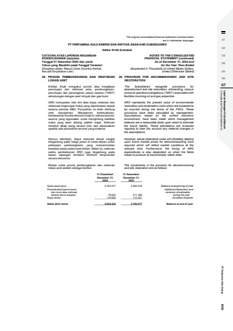 01020304050607 Consolidated Financial Statements Laporan Keaungan Konsolidasian PT Pertamina Hulu Energi 809The original consolidated financial statement included hereinare in Indonesian language.PT PERTAMINA HULU ENERGI DAN ENTITAS ANAK/AND SUBSIDIARIESDaftar 5/145 ScheduleCATATAN ATAS LAPORAN KEUANGANKONSOLIDASIAN (lanjutan)Tanggal 31 Desember 2024 dan untukTahun yang Berakhir pada Tanggal Tersebut(Disajikan dalam Ribuan Dolar Amerika Serikat,Kecuali Dinyatakan Lain)NOTES TO THE CONSOLIDATEDFINANCIAL STATEMENT (continued)As of December 31, 2024 andfor the Year Then Ended(Expressed in Thousands of United States Dollars,Unless Otherwise Stated)29. PROVISI PEMBONGKARAN DAN RESTORASILOKASI ASET29. PROVISION FOR DECOMMISIONING AND SITERESTORATIONEntitas Anak mengakui provisi atas kewajibanpenutupan dan restorasi area, pembongkaran,penutupan dan penanganan pasca operasi (%u201cARO%u201d)sehubungan dengan aset minyak dan gas bumi.The Subsidiaries recognize provisions forabandonment and site restoration, dismantling, closureand post operations obligations (%u201cARO%u201d) associated withfacilities involving oil and gas properties.ARO merupakan nilai kini atas biaya restorasi danreklamasi lingkungan hidup yang diperkirakan terjadiselama periode KBH. Penyisihan ini telah dihitungoleh manajemen. Manajemen berkeyakinan,berdasarkan kondisi ekonomi saat ini, bahwa asumsiasumsi yang digunakan untuk menghitung liabilitasmasa yang akan datang adalah wajar. Estimasitersebut dikaji ulang secara rutin dan disesuaikanapabila ada perubahan asumsi yang material.ARO represents the present value of environmentalrestoration and reclamation costs which are expected tobe incurred during the terms of the PSCs. Theseprovisions have been calculated by management.Assumptions, based on the current economicenvironment, have been made which managementbelieves are a reasonable basis upon which to estimatethe future liability. These estimations are reviewedregularly to take into account any material changes inthe assumptions.Namun demikian, biaya restorasi aktual sangatbergantung pada harga pasar di masa depan untukpekerjaan pembongkaran yang mencerminkankeadaan pasar pada masa terkait. Selain itu, estimasiwaktu pembebanan ARO juga tergantung padakapan lapangan tersebut berhenti berproduksisecara ekonomis.However, actual restoration costs will ultimately dependupon future market prices for decommissioning workrequired which will reflect market conditions at therelevant time. Furthermore, the timing of AROexpenditures is also dependent on when the fieldscease to produce at economically viable rates.Mutasi untuk provisi pembongkaran dan restorasilokasi aset adalah sebagai berikut:The movements in the provision for decommisioningand site restoration are as follows: 31 Desember/ 31 Desember/December 31, December 31,2024 2023Saldo awal tahun 3.784.917 3.460.330 Balance at beginning of yearPenambahan/(penurunan) Additions/(deduction) and dan revisi atas estimasi revisions of estimates selama tahun berjalan 78.620 211.366 during the yearBiaya akresi 119.925 113.221 Accretion expenseSaldo akhir tahun 3.826.222 3.784.917 Balance at end of year