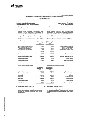 Laporan Tahunan %u2022 Annual Report 810HULU ENERGIThe original consolidated financial statement included hereinare in Indonesian language.PT PERTAMINA HULU ENERGI DAN ENTITAS ANAK/AND SUBSIDIARIESDaftar 5/146 ScheduleCATATAN ATAS LAPORAN KEUANGANKONSOLIDASIAN (lanjutan)Tanggal 31 Desember 2024 dan untukTahun yang Berakhir pada Tanggal Tersebut(Disajikan dalam Ribuan Dolar Amerika Serikat,Kecuali Dinyatakan Lain)NOTES TO THE CONSOLIDATEDFINANCIAL STATEMENT (continued)As of December 31, 2024 andfor the Year Then Ended(Expressed in Thousands of United States Dollars,Unless Otherwise Stated)30. LIABILITAS SEWA 30. LIABILITIES LEASELiabilitas sewa merupakan pembayaran sewaminimum Grup di masa yang akan datang daritransaksi-transaksi yang berkaitan dengan hak atastanah, bangunan, tanki, instalasi pipa dan peralatanlainnya, kapal terbang, kapal laut dan HBM bergerak.Lease liabilities represent future minimum leasepayments of the Group from transactions relating toland rights, buildings, tank, pipeline installations andother equipment, airplanes, ships and moveableassets.Pembayaran sewa minimum masa akan datangsebagai berikut:Payments for future minimum leases are as follows: 31 Desember/ 31 Desember/December 31, December 31,2024 2023Jatuh tempo kurang dari satu tahun 61.542 93.649 Maturity is less than one yearJatuh tempo lebih dari satu tahun Maturity is more than one dan kurang dari lima tahun 57.200 89.009 and less than five yearsJatuh tempo lebih dari lima tahun 393 1.627 Maturity is more than five yearsJumlah 119.135 184.285 TotalDikurangi bunga (6.209) (11.096) Deduct by interestJumlah setelah dikurangi bunga 112.926 173.189 Total after deduct by interestBagian jangka pendek 50.575 87.223 Current portionBagian jangka panjang 62.351 85.966 Non-current portionLaporan arus kas konsolidasian menyajikan saldoberikut berkaitan dengan sewa:The consolidated statements of cash flows show thefollowing amounts related to leases: 31 Desember/ 31 Desember/December 31, December 31,2024 2023Saldo awal 173.189 307.690 Beginning balance(Penurunan)/penambahan 82.334 86.111 (Deduction)/additionsBeban bunga 7.354 9.901 Interest expensePembayaran (146.158) (233.136) PaymentsSelisih kurs (3.793) 2.623 Foreign exchangeSaldo akhir 112.926 173.189 Ending balanceBagian jangka pendek 50.575 87.223 Current portionBagian jangka panjang 62.351 85.966 Non-current portion31. TAMBAHAN MODAL DISETOR 31. ADDITIONAL PAID-IN CAPITALTambahan modal disetor merupakan perbedaanantara jumlah imbalan yang dialihkan dan jumlahtercatat dari transaksi kombinasi bisnis entitassepengendali.Additional paid-in capital represent the difference betweenthe purchase consideration and the carrying value frombusiness combination transaction of entities under commoncontrol.