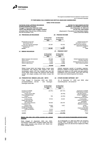 Laporan Tahunan %u2022 Annual Report 814HULU ENERGIThe original consolidated financial statement included hereinare in Indonesian language.PT PERTAMINA HULU ENERGI DAN ENTITAS ANAK/AND SUBSIDIARIESDaftar 5/150 ScheduleCATATAN ATAS LAPORAN KEUANGANKONSOLIDASIAN (lanjutan)Tanggal 31 Desember 2024 dan untukTahun yang Berakhir pada Tanggal Tersebut(Disajikan dalam Ribuan Dolar Amerika Serikat,Kecuali Dinyatakan Lain)NOTES TO THE CONSOLIDATEDFINANCIAL STATEMENT (continued)As of December 31, 2024 andfor the Year Then Ended(Expressed in Thousands of United States Dollars,Unless Otherwise Stated)40. PENGHASILAN KEUANGAN 40. FINANCE INCOME 31 Desember/ 31 Desember/December 31, December 31,2024 2023Penghasilan bunga dari Interest income from penempatan kas di placement of cash in bank dan deposito berjangka 251.561 140.234 banks and time depositsPenyesuaian atas porsi Adjustment of hedging lindung nilai - 173 portionJumlah 251.561 140.407 Total41. BEBAN KEUANGAN 41. FINANCE COST 31 Desember/ 31 Desember/December 31, December 31,2024 2023Beban keuangan dari pinjaman 297.328 311.684 Interest expense from loansBeban akresi 119.925 113.221 Accretion expenseBeban bunga dari sewa 17.225 19.987 Interest expense from leasesBeban bunga lainnya 19.428 14.393 Other interest expensesJumlah 453.906 459.285 TotalBeban bunga terdiri dari beban akresi, bunga sewapembiayaan atas Barang Milik Negara dan sewapembiayaan pabrik LPG dan instalasi pipa gas daripihak ketiga, beban bunga dari pinjaman bank jangkapendek dan jangka panjang serta beban bunga darisewa.Interest expenses consist of accretion expense,interest in relation to finance leases of State-OwnedAssets and leases of LPG plants and gas pipelineinstallations from third parties, short term and longterm loans and interest expense from leases.42. PENDAPATAN / BEBAN LAIN-LAIN %u2013 NETO 42. OTHER INCOME/ EXPENSE - NETPada tanggal 31 Desember 2024 dan 2023,pendapatan/beban lain-lain - neto keuangankeuangan terdiri dari:As of December 31, 2024 and 2023, otherincome/expense - net consist of: 31 Desember/ 31 Desember/December 31, December 31,2024 2023Kontribusi ke BUMD (52.791) (307.737) Contribution to BUMDKoreksi bagi hasil Profit sharing correction dengan partner KBH - (55.790) with PSC partners%u2019Biaya penanggulangan Incident management Insiden 708 (34.762) expensePenurunan nilai dan Impairment and correction koreksi piutang 57.813 45.450 of receivablesBagian atas laba neto Share in net profit of entitas asosiasi associates dan ventura bersama 162.620 250.278 and joint venturePendapatan atas Revenue on penalty penalti vendor 72.502 8.027 vendorPengembalian pajak (268) - Tax returnKeuntungan Penjualan Profits from the sale Anak perusahaaan 34.242 - of subsidiariesLain-lain 40.614 (18.219) OthersJumlah 315.440 (112.753) TotalBagian atas laba neto entitas asosiasi dan venturabersamaPada tanggal 31 Desember 2024 dan 2023,Perusahaan melalui M&P mengakui bagian atas labaneto entitas asosiasi yang berasal dari Seplat danPRDL sebagai berikut:Share in net income of associates and joint ventureAs of December 31, 2024 and 2023, the Companythrough M&P recognized share in net income ofassociates which are derived from Seplat and PRDLas follows: