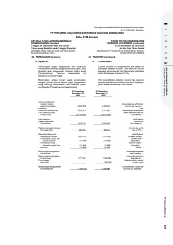 01020304050607 Consolidated Financial Statements Laporan Keaungan Konsolidasian PT Pertamina Hulu Energi 817The original consolidated financial statement included hereinare in Indonesian language.PT PERTAMINA HULU ENERGI DAN ENTITAS ANAK/AND SUBSIDIARIESDaftar 5/153 ScheduleCATATAN ATAS LAPORAN KEUANGANKONSOLIDASIAN (lanjutan)Tanggal 31 Desember 2024 dan untukTahun yang Berakhir pada Tanggal Tersebut(Disajikan dalam Ribuan Dolar Amerika Serikat,Kecuali Dinyatakan Lain)NOTES TO THE CONSOLIDATEDFINANCIAL STATEMENT (continued)As of December 31, 2024 andfor the Year Then Ended(Expressed in Thousands of United States Dollars,Unless Otherwise Stated)43. PERPAJAKAN (lanjutan) 43. TAXATION (continued)d. Pajak kini d. Current taxesPerhitungan pajak penghasilan kini dilakukanberdasarkan estimasi penghasilan kena pajak. Nilaitersebut akan disesuaikan kembali ketika SuratPemberitahuan Tahunan disampaikan keDirektorat Jenderal Pajak.Current income tax computations are based onestimated taxable income. The amounts will beadjusted when Annual Tax Refund are submittedto the Directorate General of Tax.Rekonsiliasi antara beban pajak penghasilandengan jumlah teoritis beban pajak penghasilanyang dihitung berdasarkan laba sebelum pajakpenghasilan Perusahaan sebagai berikut:The reconciliation between income tax expenseand the theoretical tax amount on the Company%u2019sprofit before income tax is as follows: 31 Desember/ 31 Desember/December 31, December 31,2024 2023Laba konsolidasian sebelum beban Consolidated profit before pajak penghasilan 4.892.574 4.492.029 income tax expenseDitambah: Add:Eliminasi konsolidasian 1.831.672 3.157.862 Consolidation eliminationsLaba sebelum pajak Profit before income tax- Entitas Anak (5.104.449) (4.624.418) Subsidiaries -Laba sebelum Profit before pajak penghasilan income tax- Perusahaan 1.619.797 3.025.473 the Company -Pajak penghasilan dengan Income tax at the tarif pajak 22% 356.355 665.604 rate of 22%Ditambah/(dikurangi): Add/(deduct):- Pendapatan dividen (409.211) (710.276) Dividend income -- Keuntungan usaha dari Income from - entitas asosiasi (11.849) (10.884) associates- Pendapatan yang Income subject - dikenakan pajak final (11.960) (5.538) to final tax- Lain-lain 76.665 61.094 Others -Beban pajak penghasilan Income tax expense- Perusahaan - - the Company -Beban pajak penghasilan Income tax expense- Entitas Anak 1.771.541 1.862.504 Subsidiaries -Penyesuaian Adjustments in respect tahun lalu - (96.013) of prior yearsBeban pajak penghasilan Consolidated corporate konsolidasian 1.771.541 1.766.491 income tax expense
