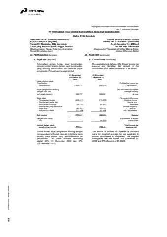 Laporan Tahunan %u2022 Annual Report 818HULU ENERGIThe original consolidated financial statement included hereinare in Indonesian language.PT PERTAMINA HULU ENERGI DAN ENTITAS ANAK/AND SUBSIDIARIESDaftar 5/154 ScheduleCATATAN ATAS LAPORAN KEUANGANKONSOLIDASIAN (lanjutan)Tanggal 31 Desember 2024 dan untukTahun yang Berakhir pada Tanggal Tersebut(Disajikan dalam Ribuan Dolar Amerika Serikat,Kecuali Dinyatakan Lain)NOTES TO THE CONSOLIDATEDFINANCIAL STATEMENT (continued)As of December 31, 2024 andfor the Year Then Ended(Expressed in Thousands of United States Dollars,Unless Otherwise Stated)43. PERPAJAKAN (lanjutan) 43. TAXATION (continued)d. Pajak kini (lanjutan) d. Current taxes (continued)Rekonsiliasi antara beban pajak penghasilandengan jumlah teoretis beban pajak penghasilanyang dihitung berdasarkan laba sebelum pajakpenghasilan Perusahaan sebagai berikut:The reconciliations between the Group%u2019 income taxexpense and teoretical tax amount in theconsolidated profit before income tax is as follows: 31 Desember/ 31 Desember/December 31, December 31,2024 2023Laba sebelum pajak Penghasilan - Profit before income tax konsolidasian 4.892.574 4.492.029 - consolidatedPajak penghasilan dihitung Tax calculated at weighted dengan rata- rata average statutory tarif pajak statutory 1.663.757 1.663.801 tax rateBeda tetap: Permanent differences:- Pendapatan dividen (409.211) (710.276) Dividend income -- Keuntungan usaha dari Income from - Perusahaan Asosiasi (35.776) (55.061) Associates- Pendapatan yang dikenakan Income subject to - Pajak final (61.467) (33.578) final tax- Penyesuaian KBH 614.238 997.618 PSC adjustments -Sub jumlah 1.771.541 1.862.504 SubtotalPenyesuaian tahun Adjustments in respect lalu - (96.013) of prior yearsJumlah beban pajak Total income tax penghasilan, bersih 1.771.541 1.766.491 expense, netJumlah beban pajak penghasilan dihitung denganmenggunakan tarif pajak rata-rata tertimbang yangberlaku untuk entitas yang dikonsolidasikan keperusahaan. Tarif pajak rata-rata tertimbangadalah 38% (31 Desember 2024) dan 37%(31 Desember 2023).The amount of income tax expense is calculatedusing the weighted average tax rate applicable toentities consolidated to companies. The weightedaverage tax rate was adalah 38% (December 31,2024) and 37% (December 31, 2023).