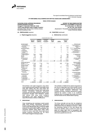 Laporan Tahunan %u2022 Annual Report 820HULU ENERGIThe original consolidated financial statement included hereinare in Indonesian language.PT PERTAMINA HULU ENERGI DAN ENTITAS ANAK/AND SUBSIDIARIESDaftar 5/156 ScheduleCATATAN ATAS LAPORAN KEUANGANKONSOLIDASIAN (lanjutan)Tanggal 31 Desember 2024 dan untukTahun yang Berakhir pada Tanggal Tersebut(Disajikan dalam Ribuan Dolar Amerika Serikat,Kecuali Dinyatakan Lain)NOTES TO THE CONSOLIDATEDFINANCIAL STATEMENT (continued)As of December 31, 2024 andfor the Year Then Ended(Expressed in Thousands of United States Dollars,Unless Otherwise Stated)43. PERPAJAKAN (lanjutan) 43. TAXATION (continued)e. Pajak tangguhan (lanjutan) e. Deferred tax (continued)31 Desember/December 31, 2023 Dibebankan Efek perubahan Dibebankan Saldo awal/ pada laba rugi/ tarif pajak/ pada OCI/ Saldo akhir/ Beginning Charged to Effect of change Charged Koreksi/ Ending Balance Profit or Loss in tax rate to OCI Correction BalanceAset pajak tangguhan Deferred tax assetsProvisi pembongkaran Provision for decomissioning dan restorasi lokasi aset 70.051 11.063 - - (5) 81.109 and site restorationLiabilitas imbalan Employee benefit kerja karyawan 8.588 1.059 - 496 752 10.895 liabilitiesProvisi bonus dan insentif 3.120 858 - - 90 4.068 Provision for bonus and incentivesProvisi penurunan nilai aset Provision for decline keuangan 2.706 (314) - - 29 2.421 in financial assets valueProvisi penurunan Provision for decline nilai persediaan 1.272 (16) - - 65 1.321 in value of inventoriesProvisi penurunan nilai Provision for declining in aset tetap 227 - - - 2 229 the value of fixed assetRugi fiskal yang dapat dibawa ke masa depan 52.939 (36.652) - - - 16.287 Tax loss carried forwardPendapatan tangguhan 6.904 (4.020) - - - 2.884 Deferred revenueAset tetap 8.363 (773) - - 799 8.389 Fixed assetsSewa aset 61 (291) - - 8 (222) Asset rentalLain-lain 1.156 1.101 - - (795) 1.462 OtherAset minyak dan bumi (58.123) 44.721 - - (126) (13.528) Oil and gas propertiesAset pajak tangguhan Unrecognized deferred yang tidak diakui (47.357) 26.730 - - 575 (20.052) tax assetsJumlah 49.907 43.466 - 496 1.394 95.263 TotalKewajiban pajak tangguhan Deferred tax liabilitiesAset minyak dan bumi (3.185.093) (32.190) 12.507 - 4.550 (3.200.226) Oil and gas propertiesAset tetap 400 313 32 - (519) 226 Fixed assetsExcess fair value over NBV (8.576) 816 - - - (7.760) Excess fair value over NBVPersediaan non-kapital (19.712) (1.031) - - - (20.743) Non-capital inventoryPendapatan tangguhan 9.045 (9.006) - - - 39 Deferred revenueSewa aset 56.099 (2.634) (32 ) - (297) 53.136 Asset rentalPenggunaan material Material used kontraktor lama 32.269 (15.251) - - - 17.018 - old contractorsPiutang usaha 30.606 (12.997) - - - 17.609 Trade receivablesProvisi pembongkaran Provision for decomissioning dan restorasi lokasi aset 407.774 13.920 (592 ) - (112) 420.990 and site restorationLiabilitas imbalan kerja karyawan 20.190 15 (195) 2.733 (86) 22.657 Employee benefits liabilitiesProvision for bonusesProvisi bonus dan insentif 3.739 2.877 - - - 6.616 and incentivesProvisi penurunan nilai Provision for decline aset keuangan 7.751 (1.517) - - - 6.234 in financial asset valueProvisi penurunan Provision for decline nilai persediaan 2.485 (452) - - - 2.033 in value of inventoriesAset pajak tangguhan Unrecognized deferred yang tidak diakui (461) - - - - (461) tax assetsRugi fiskal yang dapat dibawa ke masa depan 63.918 (4.372) - - - 59.546 Tax loss carry forwardLain-lain 6.387 (8.328) - (644) 297 (2.288) OtherJumlah (2.573.179) (69.837) 11.720 2.089 3.833 (2.625.374) TotalPemanfaatan aset pajak tangguhan yang diakuiGrup tergantung pada kelebihan laba pajak masayang akan datang atas laba yang timbul daripemulihan perbedaan temporer kena pajak yangtersedia. Perusahaan melakukan penyisihanpenilaian atas aset pajak tangguhan tertentu untukkompensasi kerugian telah ditetapkan apabilatidak adanya bukti yang cukup mengenaikemungkinan aset pajak tangguhan tersebutdapat dimanfaatkan sebelum kadaluwarsa.The utilisation of deferred tax assets recognized bythe Group is dependent upon future taxable incomein excess of income resulting from the reversal ofexisting taxable temporary differences. TheCompany provides a valuation allowance for certaindeferred tax assets if there is an insufficientevidence that it is probable that certain tax lossescarried forward will be utilised before expiring.f. Administrasi f. AdministrationGrup menghitung dan membayar sendiri jumlahpajak yang terutang. Berdasarkan perubahanterakhir Undang-Undang Pajak Penghasilan yangmulai berlaku efektif sejak tanggal 1 Januari 2008,Direktorat Jenderal Pajak dapat menetapkan danmengubah liabilitas pajak dalam batas waktu5 tahun (10 tahun untuk KBH Gross Split sesuaidengan Peraturan Pemerintah No. 53 Tahun2017) sejak tanggal terutangnya pajak.The Group calculate and pay their tax obligationsseparately. Based on the most recent amendmentsof the Income Tax Law effective on January 1, 2008,the Directorate General of Tax may decide andamend tax liabilities within a period of 5 years (10years for Gross Split PSC in accordance withGovernment Regulation no. 53 Year 2017) from thedate taxes payable become due.
