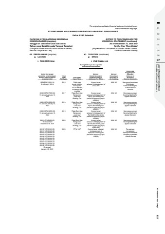01020304050607 Consolidated Financial Statements Laporan Keaungan Konsolidasian PT Pertamina Hulu Energi 821The original consolidated financial statement included hereinare in Indonesian language.PT PERTAMINA HULU ENERGI DAN ENTITAS ANAK/AND SUBSIDIARIESDaftar 5/157 ScheduleCATATAN ATAS LAPORAN KEUANGANKONSOLIDASIAN (lanjutan)Tanggal 31 Desember 2024 dan untukTahun yang Berakhir pada Tanggal Tersebut(Disajikan dalam Ribuan Dolar Amerika Serikat,Kecuali Dinyatakan Lain)NOTES TO THE CONSOLIDATEDFINANCIAL STATEMENT (continued)As of December 31, 2024 andfor the Year Then Ended(Expressed in Thousands of United States Dollars,Unless Otherwise Stated)43. PERPAJAKAN (lanjutan) 43. TAXATION (continued)g. Lain-lain g. Othersi. PHE ONWJ Ltd. i. PHE ONWJ Ltd.Kurang/lebih bayar atau rugi fiskalUnderpayment/Overpayment__________or fiscal loss__________Nomor dan tanggalpenerbitan surat ketetapan/Number and issue date ofassesment letterTahunpajak/Fiscal yearJenis pajak/Type of taxesMenurutDirektorat JenderalPajak/According toIndonesian Tax OfficeMenurutPerusahaan/According tothe CompanyStatus padatanggal laporankeuangan/Status as ofthe date offinancial statements0004/204/10/081/142 Juli/July 2, 20142010 Pajak atasbunga, dividendan royalti/Tax on Interest,dividends androyaltiesKurang bayarsebesar/ Underpayment ofUS$7,585Nihil/ Nil Menunggu keputusanPeninjauanKembali/Waiting forJudicial ReviewDecision00001//276/17/081/2213 Januari/January 13,20222017 Pajak Bumi danBangunan/Land andBuilding TaxKurang bayarsebesar/ Underpayment ofRp12,753 million (nilaipenuh/full amount) (equiv.US$818)Nihil/ Nil Menunggu putusanBanding/Waiting forAppeal Decision00001//276/18/081/2213 Januari/January 13,20222018 Pajak Bumi danBangunan/Land andBuilding TaxKurang bayarsebesar/ Underpayment ofRp13,262 million (nilaipenuh/full amount) (equiv.US$851)Nihil/ Nil Menunggu putusanBanding/Waiting forAppeal Decision00001//276/19/081/2213 Januari/January 13,20222019 Pajak Bumi danBangunan/Land andBuilding TaxKurang bayarsebesar/ Underpayment ofRp15,030 million ((nilaipenuh/full amount) (equiv.US$964)Nihil/ Nil Menunggu putusanBanding/Waiting forAppeal Decision00001/276/20/081/2115 Desember/December 15, 20212020 Pajak Bumi danBangunan/Land andBuilding TaxKurang bayarsebesar/ Underpayment ofRp134,090 million ((nilaipenuh/full amount) (equiv.US$8,600)Nihil/ Nil Menunggu putusanBanding/Waiting forAppeal Decision00010/187/20/081/2300011/187/20/081/2300012/187/20/081/2300013/187/20/081/2300014/187/20/081/2300015/187/20/081/2300016/187/20/081/2300017/187/20/081/2300018/187/20/081/2300019/187/20/081/2316 Januari/January 16, 20232020 PPN/ VAT Kurang bayar sebesar/Underpayment ofRp419.97 million (nilaipenuh/full amount) (Equiv.US$29)Nihil/ Nil PerusahaanmengajukanPeninjauan Kembali/Company submittedJudicial Review