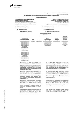 Laporan Tahunan %u2022 Annual Report 822HULU ENERGIThe original consolidated financial statement included hereinare in Indonesian language.PT PERTAMINA HULU ENERGI DAN ENTITAS ANAK/AND SUBSIDIARIESDaftar 5/158 ScheduleCATATAN ATAS LAPORAN KEUANGANKONSOLIDASIAN (lanjutan)Tanggal 31 Desember 2024 dan untukTahun yang Berakhir pada Tanggal Tersebut(Disajikan dalam Ribuan Dolar Amerika Serikat,Kecuali Dinyatakan Lain)NOTES TO THE CONSOLIDATEDFINANCIAL STATEMENT (continued)As of December 31, 2024 andfor the Year Then Ended(Expressed in Thousands of United States Dollars,Unless Otherwise Stated)43. PERPAJAKAN (lanjutan) 43. TAXATION (continued)g. Lain-lain (lanjutan) g. Others (continued)i. PHE ONWJ Ltd. (lanjutan) i. PHE ONWJ Ltd. (continued)Kurang/lebih bayar atau rugi fiskalUnderpayment/Overpayment__________or fiscal loss__________Pada bulan Juli 2014, PHE ONWJ Ltd.menerima SKPKB atas PBDR untuk tahunpajak 2010 sebesar AS$7.585 yang sudahdibayar penuh pada tanggal 24 Juli 2014.Pada tanggal 10 September 2014, PHE ONWJLtd. mengajukan surat keberatan atas SKPKBtersebut ke kantor pajak.In July 2014, PHE ONWJ Ltd. received a taxassesment relating to PBDR in the amount ofUS$7,585 for the fiscal year 2010, which was fullypaid on July 24, 2014. On September 10, 2014,PHE ONWJ Ltd. filed an objection against theSKPKB for fiscal year 2010 to the tax office.Pada bulan September 2015, PHE ONWJ Ltd.menerima hasil keputusan penolakankeberatan dari kantor pajak untuk SKPKB atasPBDR untuk tahun 2010. Surat banding ataskeputusan tersebut telah diajukan olehPHE ONWJ Ltd. ke pengadilan pajak di bulanDesember 2015.In September 2015, PHE ONWJ Ltd. receiveda decision from the tax office rejecting its objectionagainst the SKPKB related to PBDR for the fiscalyear 2010. An appeal letter against such decisionwas submitted by PHE ONWJ Ltd. to the tax courtin December 2015.Pada tanggal 23 November 2017, pengadilanpajak menolak banding yang diajukan olehPHE ONWJ atas PBDR untuk tahun 2010.Berdasarkan hasil putusan tersebut, PHEONWJ mengajukan Peninjauan Kembali keMahkamah Agung pada tanggal 5 Februari2018.On November 23, 2017, the tax court rejected theappeal filed by PHE ONWJ related to PBDR for thefiscal year 2010. Based on the results of thedecision, PHE ONWJ submitted a Judicial Reviewto the Supreme Court on February 5, 2018.Sampai dengan tanggal laporan keuangan inidiselesaikan, manajemen masih menungguhasil keputusan Mahkamah Agung atasPeninjauan Kembali untuk tahun 2010.Until the date of the finalization of these financialstatements, management is still awaiting theresults of the Judicial Review for year 2010.Nomor dan tanggalpenerbitan surat ketetapan/Number and issue date ofassesment letterTahunpajak/Fiscal yearJenis pajak/Type of taxesMenurutDirektorat JenderalPajak/According toIndonesian Tax OfficeMenurutPerusahaan/According to theCompanyStatus padatanggal laporankeuangan/Status as ofthe date offinancialstatements00088/187/22/081/2300089/187/22/081/2300090/187/22/081/2300091/187/22/081/2300092/187/22/081/2328 November/November 28, 202300097/187/20/081/237 Desember/December 7, 202300099/187/20/081/2300100/187/20/081/2300101/187/20/081/238 Desember/December 8, 202300102/187/20/081/2300103/187/20/081/2311 Desember/December 11, 2023l2022 PPN/ VAT Kurang bayar sebesar/Underpayment ofRp161.05 million (nilaipenuh/full amount)(Equiv. US$10.3)Nihil/ Nil PerusahaanmengajukanGugatan/Company filedLawsuit