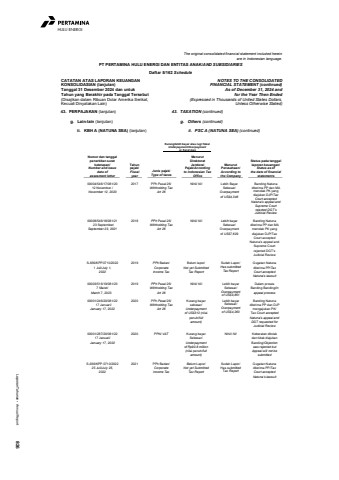 Laporan Tahunan %u2022 Annual Report 826HULU ENERGIThe original consolidated financial statement included hereinare in Indonesian language.PT PERTAMINA HULU ENERGI DAN ENTITAS ANAK/AND SUBSIDIARIESDaftar 5/162 ScheduleCATATAN ATAS LAPORAN KEUANGANKONSOLIDASIAN (lanjutan)Tanggal 31 Desember 2024 dan untukTahun yang Berakhir pada Tanggal Tersebut(Disajikan dalam Ribuan Dolar Amerika Serikat,Kecuali Dinyatakan Lain)NOTES TO THE CONSOLIDATEDFINANCIAL STATEMENT (continued)As of December 31, 2024 andfor the Year Then Ended(Expressed in Thousands of United States Dollars,Unless Otherwise Stated)43. PERPAJAKAN (lanjutan) 43. TAXATION (continued)g. Lain-lain (lanjutan) g. Others (continued)ii. KBH A (NATUNA SEA) (lanjutan) ii. PSC A (NATUNA SEA) (continued)Kurang/lebih bayar atau rugi fiskalUnderpayment/Overpayment__________or fiscal loss__________Nomor dan tanggalpenerbitan suratketetapan/Number and issuedate ofassesment letterTahunpajak/FiscalyearJenis pajak/Type of taxesMenurutDirektoratJenderalPajak/Accordingto Indonesian TaxOfficeMenurutPerusahaan/According tothe CompanyStatus pada tanggallaporan keuangan/Status as ofthe date of financialstatements00004/546/17/081/2012 November /November 12, 20202017 PPh Pasal 26/Withholding TaxArt 26Nihil/ Nil Lebih BayarSebesar/Overpaymentof US$4,346Banding Natunaditerima PP dan MAmenolak PK yangdiajukan DJP/TaxCourt acceptedNatuna%u2019s appeal andSupreme Courtrejected DGT%u2019sJudicial Review00008/546/18/081/2123 September/September 23, 20212018 PPh Pasal 26/Withholding TaxArt 26Nihil/ Nil Lebih bayarSebesar/Overpaymentof US$7,629Banding Natunaditerima PP dan MAmenolak PK yangdiajukan DJP/TaxCourt acceptedNatuna%u2019s appeal andSupreme Courtrejected DGT%u2019sJudicial ReviewS-839/KPP.0710/20221 Juli/July 1,20222019 PPh Badan/CorporateIncome TaxBelum lapor/Not yet SubmittedTax ReportSudah Lapor/Has submittedTax ReportGugatan Natunaditerima PP/TaxCourt acceptedNatuna%u2019s lawsuit00003/516/19/081/237 Maret/March 7, 20232019 PPh Pasal 26/Withholding TaxArt 26Nihil/ Nil Lebih bayarSebesar/Overpaymentof US$4,851Dalam prosesBanding Banding/Inappeal process00001/246/20/081/2217 Januari/January 17, 20222020 PPh Pasal 26/Withholding TaxArt 26Kurang bayarsebesar/Underpaymentof US$312 (nilaipenuh/fullamount)Lebih bayarSebesar/Overpaymentof US$4,263Banding Natunaditerima PP dan DJPmengajukan PK/Tax Court acceptedNatuna%u2019s appeal andDGT requested forJudicial Review00001/287/20/081/2217 Januari/January 17, 20222020 PPN/ VAT Kurang bayarSebesar/Underpaymentof Rp90.8 million(nilai penuh/fullamount)Nihil/ Nil Keberatan ditolakdan tidak diajukanBanding/Objectionwas rejected butAppeal will not besubmittedS-936/KPP.0710/202225 Juli/July 25,20222021 PPh Badan/CorporateIncome TaxBelum Lapor/Not yet SubmittedTax ReportSudah Lapor/Has submittedTax ReportGugatan Natunaditerima PP/TaxCourt acceptedNatuna%u2019s lawsuit