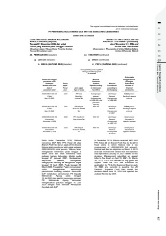 01020304050607 Consolidated Financial Statements Laporan Keaungan Konsolidasian PT Pertamina Hulu Energi 827The original consolidated financial statement included hereinare in Indonesian language.PT PERTAMINA HULU ENERGI DAN ENTITAS ANAK/AND SUBSIDIARIESDaftar 5/163 ScheduleCATATAN ATAS LAPORAN KEUANGANKONSOLIDASIAN (lanjutan)Tanggal 31 Desember 2024 dan untukTahun yang Berakhir pada Tanggal Tersebut(Disajikan dalam Ribuan Dolar Amerika Serikat,Kecuali Dinyatakan Lain)NOTES TO THE CONSOLIDATEDFINANCIAL STATEMENT (continued)As of December 31, 2024 andfor the Year Then Ended(Expressed in Thousands of United States Dollars,Unless Otherwise Stated)43. PERPAJAKAN (lanjutan) 43. TAXATION (continued)g. Lain-lain (lanjutan) g. Others (continued)ii. KBH A (NATUNA SEA) (lanjutan) ii. PSC A (NATUNA SEA) (continued)Kurang/lebih bayar atau rugi fiskalUnderpayment/Overpayment__________or fiscal loss__________Pada bulan Desember 2019, Natunamenerima SKP Nihil PPh Pasal 26 atasBranch Profit Tax tahun pajak 2015 dimanaNatuna telah membayar lebih pajak sebesarAS$2.682.639 (nilai penuh). Natuna telahmengajukan keberatan pada tanggal 2Maret 2019 dan telah menerima hasilputusan bahwa keberatan ditolak padatanggal 27 Januari 2021. Berdasarkankeputusan tersebut, manajemenmengajukan banding ke Pengadilan Pajaktanggal 19 April 2021. Pada tanggal 29Maret 2023, Pengadilan Pajak memutuskanuntuk mengabulkan seluruhnyapermohonan banding tersebut. KemudianDJP melakukan permohonan PK kepadaMahkamah Agung pada tanggal13 Juli 2023 dan saat ini menunggu putusanPK. Mahkamah Agung kemudianmengeluarkan putusan tanggal 14 Juni2024 dengan hasil menolak PeninjauanKembali oleh DJP.In December 2019, Natuna received SKP NihilPPh Article 26 on Branch Profit Tax for the 2015fiscal years in which Natuna has a taxoverpayment of US$2,682,639 (full amount).Natuna had filed an objection on March 2, 2019and had received the verdict that the objectionwas rejected on January 27, 2021. Based on thisdecision, Management submitted an appealletter to Tax Court on April 19, 2021. On March29, 2023, Tax Court decided to fully grant theAppeal. Then the DGT has submitted anapplication for PK to the Supreme Court on July13, 2023 and currently is awaiting the JRDecision. Supreme Court then issued thedecision dated June 14, 2024 that rejected theJudicial Review by DGT.Nomor dan tanggalpenerbitan suratketetapan/Number and issuedate ofassesment letterTahunpajak/FiscalyearJenis pajak/Type of taxesMenurutDirektoratJenderalPajak/Accordingto IndonesianTax OfficeMenurutPerusahaan/According tothe CompanyStatus padatanggal laporankeuangan/Status as ofthe date offinancialstatements00003/266/21/081/2315 Mei/May 15, 20232021 PPh GasBumi/GasIncome TaxKurang bayarsebesar/Underpaymentof US$8,620 (nilaipenuh/fullamount)Lebih bayarSebesar/Overpaymentof US$6,258Dalam prosesBanding/In appealprocess00023/536/21/081/2315 Mei/May 15, 20232021 PPh MinyakBumi/ Oil IncomeTaxNihil/ Nil Lebih bayarSebesar/Overpaymentof US$71Dalam prosesBanding/In appealprocess00004/566/22/081/244 November/November 4, 20242022 PPh Gas Bumi/Gas Income TaxNihil/ Nil Lebih bayarSebesar/Overpaymentof US$7,172Dalam prosesKeberatan/Inobjection process00004/536/22/081/244 November/November 4, 20242022 PPh MinyakBumi/ Oil IncomeTaxNihil/ Nil Lebih bayarSebesar/Overpaymentof US$74Dalam prosesKeberatan/Inobjection process