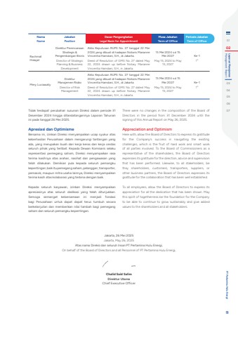 Tidak terdapat perubahan susunan Direksi dalam periode 31 Desember 2024 hingga ditandatanganinya Laporan Tahunan ini pada tanggal 26 Mei 2025.Apresiasi dan OptimismeBersama ini, izinkan Direksi menyampaikan ucap syukur atas keberhasilan Perusahaan dalam mengarungi tantangan yang ada, yang merupakan buah dari kerja keras dan kerja cerdas seluruh pihak yang terlibat. Kepada Dewan Komisaris selaku representasi pemegang saham, Direksi menyampaikan rasa terima kasihnya atas arahan, nasihat dan pengawasan yang telah dilakukan. Demikian pula kepada seluruh pemangku kepentingan, baik itu pemegang saham, pelanggan, transporter, pemasok, maupun mitra usaha lainnya, Direksi menyampaikan terima kasih atas kolaborasi yang terbina dengan baik.Kepada seluruh karyawan, izinkan Direksi menyampaikan apresiasinya atas seluruh dedikasi yang telah ditunjukkan. Semoga semangat kebersamaan ini menjadi fondasi bagi Perusahaan untuk dapat dapat terus tumbuh secara berkelanjutan dan memberikan nilai tambah bagi pemegang saham dan seluruh pemangku kepentingan.NamaNameJabatanPositionDasar PengangkatanLegal Basis for AppointmentMasa JabatanTerm of OfficePeriode JabatanTerm of OfficeRachmat HidajatDirektur Perencanaan Strategis & Pengembangan BisnisDirector of Strategic Planning & Business DevelopmentAkta Keputusan RUPS No. 27 tanggal 22 Mei 2024 yang dibuat di hadapan Notaris Marianne Vincentia Hamdani, S.H., di Jakarta.Deed of Resolution of GMS No. 27 dated May 22, 2024 drawn up before Notary Marianne Vincentia Hamdani, S.H., in Jakarta.15 Mei 2024 s.d 15 Mei 2027May 15, 2024 to May 15, 2027Ke-11stMery LuciawatyDirektur Manajemen RisikoDirector of Risk ManagementAkta Keputusan RUPS No. 27 tanggal 22 Mei 2024 yang dibuat di hadapan Notaris Marianne Vincentia Hamdani, S.H., di JakartaDeed of Resolution of GMS No. 27 dated May 22, 2024 drawn up before Notary Marianne Vincentia Hamdani, S.H., in Jakarta15 Mei 2024 s.d 15 Mei 2027May 15, 2024 to May 15, 2027Ke-11stJakarta, 26 Mei 2025Jakarta, May 26, 2025Atas nama Direksi dan seluruh Insan PT Pertamina Hulu Energi,On behalf of the Board of Directors and all Personnel of PT Pertamina Hulu Energi,Chalid Said SalimDirektur UtamaChief Executive OfficerThere were no changes in the composition of the Board of Directors in the period from 31 December 2024 until the signing of this Annual Report on May 26, 2025.Appreciation and OptimismHere with, allow the Board of Directors to express its gratitude for the Company's success in navigating the existing challenges, which is the fruit of hard work and smart work of all parties involved. To the Board of Commissioners as a representative of the shareholders, the Board of Directors expresses its gratitude for the direction, advice and supervision that has been performed. Likewise, to all stakeholders, be they shareholders, customers, transporters, suppliers, or other business partners, the Board of Directors expresses its gratitude for the collaboration that has been well established.To all employees, allow the Board of Directors to express its appreciation for all the dedication that has been shown. May this spirit of togetherness be the foundation for the Company to be able to continue to grow sustainably and give added values to the shareholders and all stakeholders.0102 Management Report Laporan Manajemen0304050607Laporan Tahunan %u2022 Annual Report 80PT Pertamina Hulu Energi 81