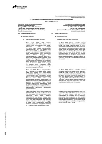 Laporan Tahunan %u2022 Annual Report 830HULU ENERGIThe original consolidated financial statement included hereinare in Indonesian language.PT PERTAMINA HULU ENERGI DAN ENTITAS ANAK/AND SUBSIDIARIESDaftar 5/166 ScheduleCATATAN ATAS LAPORAN KEUANGANKONSOLIDASIAN (lanjutan)Tanggal 31 Desember 2024 dan untukTahun yang Berakhir pada Tanggal Tersebut(Disajikan dalam Ribuan Dolar Amerika Serikat,Kecuali Dinyatakan Lain)NOTES TO THE CONSOLIDATEDFINANCIAL STATEMENT (continued)As of December 31, 2024 andfor the Year Then Ended(Expressed in Thousands of United States Dollars,Unless Otherwise Stated)43. PERPAJAKAN (lanjutan) 43. TAXATION (continued)g. Lain-lain (lanjutan) g. Others (continued)ii. KBH A (NATUNA SEA) (lanjutan) ii. PSC A (NATUNA SEA) (continued)Pada April 2020, BUT Natunamenyampaikan SPT PPh Badan untukTahun Pajak 2019 kepada KPP Migas.Kemudian pada tanggal14 Maret 2022, Natuna menyampaikanPembetulan ke-1 SPT PPh Badan untukTahun Pajak 2019 ke KPP Migas. padatanggal 1 Juli 2022, KPP Migas menerbitkanSurat Pemberitahuan yang menyatakanbahwa Natuna dianggap tidakmenyampaikan SPT Tahunan tahun 2019.Atas Surat Pemberitahuan tersebut, padatanggal 19 Agustus 2022, Natunamenyampaikan surat gugatan ke PengadilanPajak. Persidangan Gugatan telah selesaipada 14 Februari 2023. Pada tanggal15 Agustus 2023, Pengadilan Pajakmemutuskan untuk mengabulkan seluruhnyapermohonan gugatan tersebut.In April 2020, Natuna submitted AnnualCorporate Income Tax Report for the year 2019to the Tax Office. Then on March 14, 2022,Natuna then submitted Revised Annual IncomeTax Report to Tax Office. On July 1, 2022, TaxOffice issued a notification letter stating thatNatuna did not submit an Annual Income TaxReport for the year 2019. Based on thatnotification letter, on August 19, 2022 Natuna.filed a Lawsuit to the Tax Court. Hearing for thelawsuit was completed on February 14, 2023. OnAugust 15, 2023, Tax Court decided to fully grantthe Lawsuit.Pada April 2022, Natuna menyampaikanSPT Tahunan PPh Badan untuk TahunPajak 2021 kepada KPP. Pada tanggal25 Juli 2022, KPP Migas menerbitkan SuratPemberitahuan yang menyatakan bahwaNatuna dianggap tidak menyampaikan SPTTahunan tahun 2021. Atas suratpemberitahuan tersebut, pada tanggal 19Agustus 2022, Natuna menyampaikan suratgugatan ke Pengadilan Pajak. SidangGugatan terakhir telah dilaksanakan pada14 Februari 2023. Pada tanggal 15 Agustus2023, Pengadilan Pajak memutuskan untukmengabulkan seluruhnya permohonangugatan tersebut.In April 2022, Natuna submitted AnnualCorporate Income Tax Report for the year 2021to the Tax Office. On July 25, 2022, Tax Officeissued a notification letter stating that Natuna didnot submit an Annual Income Tax Report for theyear 2021. Based on that notification letter, onAugust 19, 2022 Natuna filed a Lawsuit to theTax Court. The last lawsuit hearing was held onFebruary 14, 2023. On August 15, 2023, TaxCourt decided to fully grant the Lawsuit.Pada bulan Maret 2023, Natuna menerimaSKP Nihil PPh Pasal 26 atas Branch ProfitTax tahun pajak 2019 dimana Natuna telahmembayar lebih pajak sebesarAS$4.850.746 (nilai penuh). Natuna telahmengajukan keberatan pada tanggal 5 Juni2023 dan telah menerima hasil putusanbahwa keberatan ditolak pada tanggal5 Maret 2024. Berdasarkan keputusantersebut, manajemen mengajukan bandingke Pengadilan Pajak tanggal 4 Juni 2024.In March 2023, Natuna received SKP Nihil PPhArticle 26 on Branch Profit Tax for the fiscal year2019 in which Natuna had paid a taxoverpayment of US$4,850,746 (full amount).Natuna had filed an objection on June 5, 2023and had received the verdict that the objectionwas rejected on March 5, 2024. Based on theverdict, Management submitted an appeal letterto Tax Court on June 4, 2024.