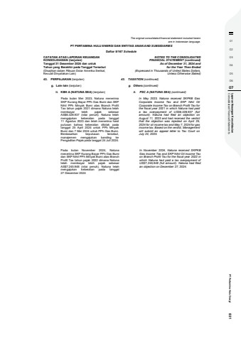 01020304050607 Consolidated Financial Statements Laporan Keaungan Konsolidasian PT Pertamina Hulu Energi 831The original consolidated financial statement included hereinare in Indonesian language.PT PERTAMINA HULU ENERGI DAN ENTITAS ANAK/AND SUBSIDIARIESDaftar 5/167 ScheduleCATATAN ATAS LAPORAN KEUANGANKONSOLIDASIAN (lanjutan)Tanggal 31 Desember 2024 dan untukTahun yang Berakhir pada Tanggal Tersebut(Disajikan dalam Ribuan Dolar Amerika Serikat,Kecuali Dinyatakan Lain)NOTES TO THE CONSOLIDATEDFINANCIAL STATEMENT (continued)As of December 31, 2024 andfor the Year Then Ended(Expressed in Thousands of United States Dollars,Unless Otherwise Stated)43. PERPAJAKAN (lanjutan) 43. TAXATION (continued)g. Lain-lain (lanjutan) g. Others (continued)ii. KBH A (NATUNA SEA) (lanjutan) ii. PSC A (NATUNA SEA) (continued)Pada bulan Mei 2023, Natuna menerimaSKP Kurang Bayar PPh Gas Bumi dan SKPNihil PPh Minyak Bumi atas Branch ProfitTax tahun pajak 2021 dimana Natuna telahmembayar lebih pajak sebesarAS$6.328.937 (nilai penuh). Natuna telahmengajukan keberatan pada tanggal11 Agustus 2023 dan telah menerima hasilputusan bahwa keberatan ditolak padatanggal 25 April 2024 untuk PPh MinyakBumi dan 7 Mei 2024 untuk PPh Gas Bumi.Berdasarkan keputusan tersebut,manajemen mengajukan banding kePengadilan Pajak pada tanggal 24 Juli 2024.In May 2023, Natuna received SKPKB GasCorporate Income Tax and SKP Nihil OilCorporate Income Tax on Branch Profit Tax forthe fiscal year 2021 in which Natuna had paida tax overpayment of US$6,328,937 (fullamount). Natuna had filed an objection onAugust 11, 2023 and had received the verdictthat the objection was rejected on April 25,2024 for oil income tax and May 7, 2024 for gasincome tax. Based on the verdict, Managementwill submit an appeal letter to Tax Court onJuly 24, 2024.Pada bulan November 2024, Natunamenerima SKP Kurang Bayar PPh Gas Bumidan SKP Nihil PPh Minyak Bumi atas BranchProfit Tax tahun pajak 2022 dimana Natunatelah membayar lebih pajak sebesarAS$7.245.948 (nilai penuh). Natuna telahmengajukan keberatan pada tanggal27 Desember 2024In November 2024, Natuna received SKPKBGas Income Tax and SKP Nihil Oil Income Taxon Branch Profit Tax for the fiscal year 2022 inwhich Natuna had paid a tax overpayment ofUS$7,245,948 (full amount). Natuna had filedan objection on December 27, 2024.