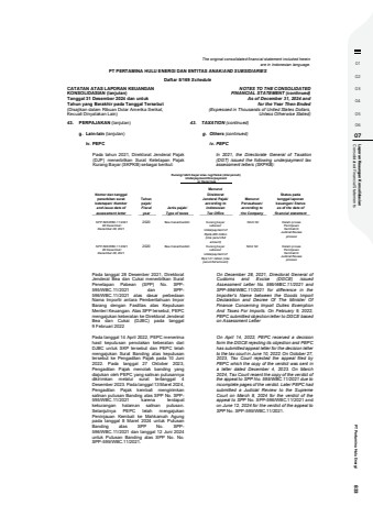 01020304050607 Consolidated Financial Statements Laporan Keaungan Konsolidasian PT Pertamina Hulu Energi 833The original consolidated financial statement included hereinare in Indonesian language.PT PERTAMINA HULU ENERGI DAN ENTITAS ANAK/AND SUBSIDIARIESDaftar 5/169 ScheduleCATATAN ATAS LAPORAN KEUANGANKONSOLIDASIAN (lanjutan)Tanggal 31 Desember 2024 dan untukTahun yang Berakhir pada Tanggal Tersebut(Disajikan dalam Ribuan Dolar Amerika Serikat,Kecuali Dinyatakan Lain)NOTES TO THE CONSOLIDATEDFINANCIAL STATEMENT (continued)As of December 31, 2024 andfor the Year Then Ended(Expressed in Thousands of United States Dollars,Unless Otherwise Stated)43. PERPAJAKAN (lanjutan) 43. TAXATION (continued)g. Lain-lain (lanjutan) g. Others (continued)iv. PEPC iv. PEPCPada tahun 2021, Direktorat Jenderal Pajak(DJP) menerbitkan Surat Ketetapan PajakKurang Bayar (SKPKB) sebagai berikut:In 2021, the Directorate General of Taxation(DGT) issued the following underpayment taxassessment letters (SKPKB):Kurang/ lebih bayar atau rugi fiskal (nilai penuh)Underpayment/Overpayment__________or fiscal loss _________Pada tanggal 28 Desember 2021, DirektoratJenderal Bea dan Cukai menerbitkan SuratPenetapan Pabean (SPP) No. SPP595/WBC.11/2021 dan SPP596/WBC.11/2021 atas dasar perbedaanNama Importir antara Pemberitahuan ImporBarang dengan Fasilitas atas KeputusanMenteri Keuangan. Atas SPP tersebut, PEPCmengajukan keberatan ke Direktorat JenderalBea dan Cukai (DJBC) pada tanggal9 Februari 2022On December 28, 2021, Directorat General ofCustoms and Excise (DGCE) issuedAssessment Letter No. 595/WBC.11/2021 andSPP-596/WBC.11/2021 for difference in theImporter's Name between the Goods ImportDeclaration and Decree Of The Minister OfFinance Concerning Import Duties ExemptionAnd Taxes For Imports. On February 9, 2022,PEPC submitted objection letter to DGCE basedon Assessment LetterPada tanggal 14 April 2022, PEPC menerimahasil keputusan penolakan keberatan dariDJBC untuk SKP tersebut dan PEPC telahmengajukan Surat Banding atas keputusantersebut ke Pengadilan Pajak pada 10 Juni2022. Pada tanggal 27 Oktober 2023,Pengadilan Pajak menolak banding yangdiajukan oleh PEPC yang salinan putusannyadikirimkan melalui surat tertanggal 4Desember 2023. Pada tanggal 13 Maret 2024,Pengadilan Pajak kembali mengirimkansalinan putusan Banding atas SPP No. SPP595/WBC.11/2021 karena terdapatkekurangan halaman salinan putusan.Selanjutnya PEPC telah mengajukanPeninjauan Kembali ke Mahkamah Agungpada tanggal 8 Maret 2024 untuk PutusanBanding atas SPP No. SPP596/WBC.11/2021 dan tanggal 12 Juni 2024untuk Putusan Banding atas SPP No. No.SPP-595/WBC.11/2021.On April 14, 2022, PEPC received a decisionform the DGCE rejecting its objection and PEPChas submitted appeal letter for the decision letterto the tax court in June 10, 2022. On October 27,2023, Tax Court rejected the appeal filed byPEPC which the copy of the verdict was sent ina letter dated December 4, 2023. On March2024, Tax Court resent the copy of the verdict ofthe appeal to SPP No. 595/WBC.11/2021 due toincomplete pages of the verdict. Later PEPC hadsubmitted a Judicial Review to the SupremeCourt on March 8, 2024 for the verdict of theappeal to SPP No. SPP-596/WBC.11/2021 andon June 12, 2024 for the verdict of the appeal toSPP No. SPP-595/WBC.11/2021.Nomor dan tanggalpenerbitan suratketetapan/ Numberand issue date ofassessment letterTahunpajak/FiscalyearJenis pajak/Type of taxesMenurutDirektoratJenderal Pajak/according toIndonesianTax OfficeMenurutPerusahaan/according tothe CompanyStatus padatanggal laporankeuangan/ Statusas of the date offinancial statementSPP-595/WBC.11/202128 Desember/December 28, 20212020 Bea Cukai/Custom Kurang bayarsebesar/Underpayment ofRp49,466 million(nilai penuh/fullamount)Nihil/ Nil Dalam prosesPeninjauanKembali/InJudicial ReviewprocessSPP-596/WBC.11/202128 Desember/December 28, 20212020 Bea Cukai/Custom Kurang bayarsebesar/Underpayment ofRp2,101 million (nilaipenuh/full amount)Nihil/ Nil Dalam prosesPeninjauanKembali/InJudicial Reviewprocess