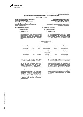 Laporan Tahunan %u2022 Annual Report 834HULU ENERGIThe original consolidated financial statement included hereinare in Indonesian language.PT PERTAMINA HULU ENERGI DAN ENTITAS ANAK/AND SUBSIDIARIESDaftar 5/170 ScheduleCATATAN ATAS LAPORAN KEUANGANKONSOLIDASIAN (lanjutan)Tanggal 31 Desember 2024 dan untukTahun yang Berakhir pada Tanggal Tersebut(Disajikan dalam Ribuan Dolar Amerika Serikat,Kecuali Dinyatakan Lain)NOTES TO THE CONSOLIDATEDFINANCIAL STATEMENT (continued)As of December 31, 2024 andfor the Year Then Ended(Expressed in Thousands of United States Dollars,Unless Otherwise Stated)43. PERPAJAKAN (lanjutan) 43. TAXATION (continued)g. Lain-lain (lanjutan) g. Others (continued)v. PHE Tengah K v. PHE Tengah KDirektorat Jenderal Pajak (DJP) menerbitkanSurat Ketetapan Pajak Kurang Bayar (SKPKB)kepada PHE Tengah K. Berikut status SKPKByang diterima PHE Tengah K per 31 Desember2023:The Directorate General of Taxes (DGT) issuedan underpayment tax assessment letters(SKPKB) to PHE Tengah K. The following is thestatus of the SKPKB received by PHE Tengah Kas of December 31, 2023:Kurang/lebih bayar atau rugi fiskalUnderpayment/Overpayment__________or fiscal loss__________Pada tanggal 16 Agustus 2021, DJPmenerbitkan SKPKB untuk PPh Pasal 26 (4)Tahun 2018 sebesar AS$317.056 (nilai penuh)dan SKPKB untuk PPh Badan Tahun 2018sebesar AS$900.473 (nilai penuh). Padatanggal 15 November 2021, PHE Tengah Kmengajukan Keberatan atas SKPKB tersebut.Pada tahun 2022, PHE Tengah K menerimahasil keputusan penolakan keberatan darikantor pajak untuk SKPKB tersebut. Padatanggal 8 Desember 2022, PHE Tengah telahmengajukan Banding ke Pengadilan Pajak.PHE Tengah K telah mengajukan Banding kePengadilan Pajak. PHE Tengah telahmenyelesaikan proses persidangan pada6 November 2023 dan saat ini menungguputusan banding.On August 16, 2021 DGT issued underpaymenttax assessment letters for fiscal year 2018 in theamount of US$317,056 (full amount) andUS$900,473 (full amount). On November 15,2021 PHE Tengah K filed an objection againstthe SKPKB. In 2022, PHE Tengah K received adecision from the tax office rejecting its objectionagainst the SKPKB. On December 8, 2022 PHETengah has submitted appeal letter for thedecision letter to the tax court. PHE Tengah Khad completed the hearing process on November6, 2023 and currently is awaiting the appealdecision.Nomor dan tanggalpenerbitan suratketetapan/ Numberand issue date ofAssesment letterTahunpajak/FiscalyearJenispajak/Type oftaxesMenurutDirektorat JenderalPajak/ According toIndonesian Tax OfficeMenurutPerusahaan/According to theCompanyStatus padatanggal laporankeuangan/Status as ofthe date offinancial statements00002/246/18/081/2116 Agustus/ August 16,20212018 PPh Pasal 26/Witholding TaxArt.26Kurang bayarsebesar/ Underpaymentof US$317,056 (nilaipenuh/full amount)Nihil/Nil Menunggu keputusanBanding/Waiting forAppeal Decision00002/216/18/081/2116 Agustus/ August 16,20212018 PPh Badan/CorporateIncome TaxKurang bayarsebesar/ Underpaymentof US$900,473 (nilaipenuh/full amount)Nihil/Nil Menunggu keputusanBanding/Waiting forAppeal Decision