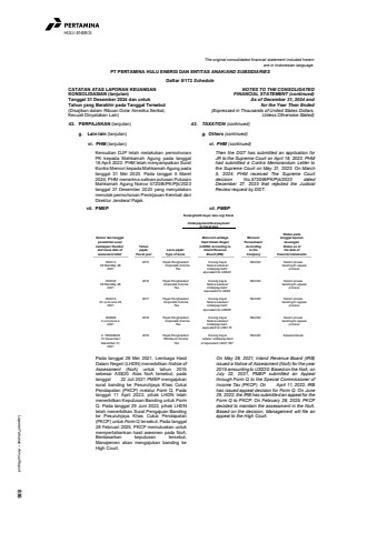 Laporan Tahunan %u2022 Annual Report 836HULU ENERGIThe original consolidated financial statement included hereinare in Indonesian language.PT PERTAMINA HULU ENERGI DAN ENTITAS ANAK/AND SUBSIDIARIESDaftar 5/172 ScheduleCATATAN ATAS LAPORAN KEUANGANKONSOLIDASIAN (lanjutan)Tanggal 31 Desember 2024 dan untukTahun yang Berakhir pada Tanggal Tersebut(Disajikan dalam Ribuan Dolar Amerika Serikat,Kecuali Dinyatakan Lain)NOTES TO THE CONSOLIDATEDFINANCIAL STATEMENT (continued)As of December 31, 2024 andfor the Year Then Ended(Expressed in Thousands of United States Dollars,Unless Otherwise Stated)43. PERPAJAKAN (lanjutan) 43. TAXATION (continued)g. Lain-lain (lanjutan) g. Others (continued)vi. PHM (lanjutan) vi. PHM (continued)Kemudian DJP telah melakukan permohonanPK kepada Mahkamah Agung pada tanggal18 April 2023. PHM telah menyampaikan SuratKontra Memori kepada Mahkamah Agung padatanggal 31 Mei 2023. Pada tanggal 5 Maret2024, PHM menerima salinan putusan PutusanMahkamah Agung Nomor 5720/B/PK/Pjk/2023tanggal 27 Desember 2023 yang menyatakanmenolak permohonan Peninjauan Kembali dariDirektur Jenderal Pajak.Then the DGT has submitted an application forJR to the Supreme Court on April 18, 2023. PHMhad submitted a Contra Memorandum Letter tothe Supreme Court on May 31, 2023. On March5, 2024, PHM received The Supreme Courtdecision No.5720/B/PK/Pjk/2023 datedDecember 27, 2023 that rejected the JudicialReview request by DGT.vii. PMEP vii. PMEPKurang/lebih bayar atau rugi fiscalUnderpayment/Overpayment__________or fiscal loss__________Pada tanggal 28 Mei 2021, Lembaga HasilDalam Negeri (LHDN) menerbitkan Notice ofAssessment (NoA) untuk tahun 2015sebesar AS$20. Atas NoA tersebut, padatanggal 22 Juli 2021 PMEP mengajukansurat banding ke Pesuruhjaya Khas CukaiPendapatan (PKCP) melalui Form Q. Padatanggal 11 April 2022, pihak LHDN telahmenerbitkan Keputusan Banding untuk FormQ. Pada tanggal 29 Juni 2022, pihak LHDNtelah menerbitkan Surat Pengajuan Bandingke Pesuruhjaya Khas Cukai Pendapatan(PKCP) untuk Form Q tersebut. Pada tanggal28 Februari 2025, PKCP memutuskan untukmempertahankan hasil asesmen pada NoA.Berdasarkan keputusan tersebut,Manajemen akan mengajukan banding keHigh Court.On May 28, 2021, Inland Revenue Board (IRB)issued a Notice of Assessment (NoA) for the year2015 amounting to US$20. Based on the NoA, onJuly 22, 2021, PMEP submitted an Appealthrough Form Q to the Special Commissioner ofIncome Tax (PKCP). On April 11, 2022, IRBhas issued appeal decision for Form Q. On June29, 2022, the IRB has submitted an appeal for theForm Q to PKCP. On February 28, 2025, PKCPdecided to maintain the assessment in the NoA.Based on the decision, Management will file anappeal to the High Court.Nomor dan tanggalpenerbitan suratketetapan/ Numberand issue date ofassesment letterTahunpajak/Fiscal yearJenis pajak/Type of taxesMenurut LembagaHasil Dalam Negeri(LHDN)/ According toInland RevenueBoard (IRB)MenurutPerusahaan/Accordingto theCompanyStatus padatanggal laporankeuangan/Status as ofthe date offinancial statements05241328 Mei/May 28,20212015 Pajak Penghasilan/Corporate IncomeTaxKurang bayarSetara sebesar/Underpaymentequivalent to US$20Nihil/Nil Dalam prosesbanding/In appealprocess05254828 Mei/May 28,20212016 Pajak Penghasilan/Corporate IncomeTaxKurang bayarSetara sebesar/Underpaymentequivalent to US$9Nihil/Nil Dalam prosesbanding/In appealprocess05247923 Juni/June 23,20212017 Pajak Penghasilan/Corporate IncomeTaxKurang bayarSetara sebesar/Underpaymentequivalent to US$66Nihil/Nil Dalam prosesbanding/In appealprocess0526984 Juni/June 4,20212018 Pajak Penghasilan/Corporate IncomeTaxKurang bayarSetara sebesar/Underpaymentequivalent to US$115Nihil/Nil Dalam prosesbanding/In appealprocessC 18529820831 Desember/December 31,20212016 Pajak Penghasilan/Petroleum IncomeTaxKurang bayarsetara/ Underpaymentof equivalent US$7,787Nihil/Nil Selesai/closed