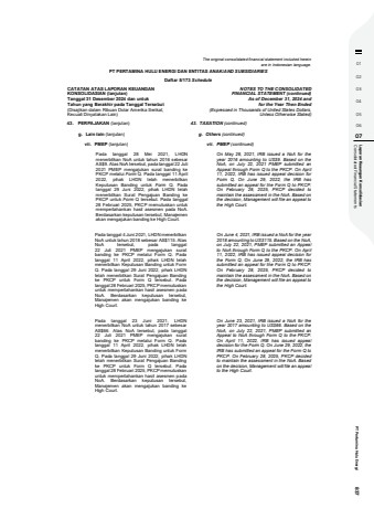 01020304050607 Consolidated Financial Statements Laporan Keaungan Konsolidasian PT Pertamina Hulu Energi 837The original consolidated financial statement included hereinare in Indonesian language.PT PERTAMINA HULU ENERGI DAN ENTITAS ANAK/AND SUBSIDIARIESDaftar 5/173 ScheduleCATATAN ATAS LAPORAN KEUANGANKONSOLIDASIAN (lanjutan)Tanggal 31 Desember 2024 dan untukTahun yang Berakhir pada Tanggal Tersebut(Disajikan dalam Ribuan Dolar Amerika Serikat,Kecuali Dinyatakan Lain)NOTES TO THE CONSOLIDATEDFINANCIAL STATEMENT (continued)As of December 31, 2024 andfor the Year Then Ended(Expressed in Thousands of United States Dollars,Unless Otherwise Stated)43. PERPAJAKAN (lanjutan) 43. TAXATION (continued)g. Lain-lain (lanjutan) g. Others (continued)vii. PMEP (lanjutan) vii. PMEP (continued)Pada tanggal 28 Mei 2021, LHDNmenerbitkan NoA untuk tahun 2016 sebesarAS$9. Atas NoA tersebut, pada tanggal 22 Juli2021 PMEP mengajukan surat banding kePKCP melalui Form Q. Pada tanggal 11 April2022, pihak LHDN telah menerbitkanKeputusan Banding untuk Form Q. Padatanggal 29 Juni 2022, pihak LHDN telahmenerbitkan Surat Pengajuan Banding kePKCP untuk Form Q tersebut. Pada tanggal28 Februari 2025, PKCP memutuskan untukmempertahankan hasil asesmen pada NoA.Berdasarkan keputusan tersebut, Manajemenakan mengajukan banding ke High Court.On May 28, 2021, IRB issued a NoA for theyear 2016 amounting to US$9. Based on theNoA, on July 22, 2021 PMEP submitted anAppeal through Form Q to the PKCP. On April11, 2022, IRB has issued appeal decision forForm Q. On June 29, 2022, the IRB hassubmitted an appeal for the Form Q to PKCP.On February 28, 2025, PKCP decided tomaintain the assessment in the NoA. Based onthe decision, Management will file an appeal tothe High Court.Pada tanggal 4 Juni 2021, LHDN menerbitkanNoA untuk tahun 2018 sebesar AS$115. AtasNoA tersebut, pada tanggal22 Juli 2021 PMEP mengajukan suratbanding ke PKCP melalui Form Q. Padatanggal 11 April 2022, pihak LHDN telahmenerbitkan Keputusan Banding untuk FormQ. Pada tanggal 29 Juni 2022, pihak LHDNtelah menerbitkan Surat Pengajuan Bandingke PKCP untuk Form Q tersebut. Padatanggal 28 Februari 2025, PKCP memutuskanuntuk mempertahankan hasil asesmen padaNoA. Berdasarkan keputusan tersebut,Manajemen akan mengajukan banding keHigh Court.On June 4, 2021, IRB issued a NoA for the year2018 amounting to US$115. Based on the NoA,on July 22, 2021, PMEP submitted an Appealto NoA through Form Q to the PKCP. On April11, 2022, IRB has issued appeal decision forthe Form Q. On June 29, 2022, the IRB hassubmitted an appeal for the Form Q to PKCP.On February 28, 2025, PKCP decided tomaintain the assessment in the NoA. Based onthe decision, Management will file an appeal tothe High Court.Pada tanggal 23 Juni 2021, LHDNmenerbitkan NoA untuk tahun 2017 sebesarAS$66. Atas NoA tersebut, pada tanggal22 Juli 2021 PMEP mengajukan suratbanding ke PKCP melalui Form Q. Padatanggal 11 April 2022, pihak LHDN telahmenerbitkan Keputusan Banding untuk FormQ. Pada tanggal 29 Juni 2022, pihak LHDNtelah menerbitkan Surat Pengajuan Bandingke PKCP untuk Form Q tersebut. Padatanggal 28 Februari 2025, PKCP memutuskanuntuk mempertahankan hasil asesmen padaNoA. Berdasarkan keputusan tersebut,Manajemen akan mengajukan banding keHigh Court.On June 23, 2021, IRB issued a NoA for theyear 2017 amounting to US$66. Based on theNoA, on July 22, 2021, PMEP submitted anAppeal to NoA through Form Q to the PKCP.On April 11, 2022, IRB has issued appealdecision for the Form Q. On June 29, 2022, theIRB has submitted an appeal for the Form Q toPKCP. On February 28, 2025, PKCP decidedto maintain the assessment in the NoA. Basedon the decision, Management will file an appealto the High Court.