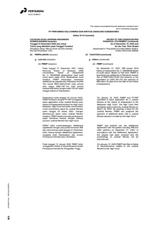 Laporan Tahunan %u2022 Annual Report 838HULU ENERGIThe original consolidated financial statement included hereinare in Indonesian language.PT PERTAMINA HULU ENERGI DAN ENTITAS ANAK/AND SUBSIDIARIESDaftar 5/174 ScheduleCATATAN ATAS LAPORAN KEUANGANKONSOLIDASIAN (lanjutan)Tanggal 31 Desember 2024 dan untukTahun yang Berakhir pada Tanggal Tersebut(Disajikan dalam Ribuan Dolar Amerika Serikat,Kecuali Dinyatakan Lain)NOTES TO THE CONSOLIDATEDFINANCIAL STATEMENT (continued)As of December 31, 2024 andfor the Year Then Ended(Expressed in Thousands of United States Dollars,Unless Otherwise Stated)43. PERPAJAKAN (lanjutan) 43. TAXATION (continued)g. Lain-lain (lanjutan) g. Others (continued)vii. PMEP (lanjutan) vii. PMEP (continued)Pada tanggal 31 Desember 2021, InlandRevenue Board of Malaysia (IRB)menerbitkan Notice of AssessmentNo. C 185298208 berdasarkan hasil audituntuk tahun pajak 2016. Berdasarkan surattersebut, PMEP diharuskan membayaradditional tax payable atas Petroleum IncomeTax senilai RM31,829,479.82 (nilai penuh)atau setara AS$7.787.143 (nilai penuh)kepada IRB dalam jangka waktu 30 hari sejaktanggal Notice of Assessment.On December 31, 2021, IRB issued 2016Notice of Assessment No. C 185298208 basedon audit report. Based on that NoA, PMEP isrequired to pay additional on Petroleum IncomeTax of RM31,829,479.82 (full amount) or theequivalent of US$7,787,143 (full amount) toIRB within 30 days from the date of the Noticeof Assessment.Selanjutnya pada tanggal 16 Januari 2022,PMEP bersama dengan PTTEP mengajukanleave application untuk Judicial Review atasNotice of Assessment tersebut ke High CourtMalaysia. High Court kemudian memutuskanuntuk memberikan leave for Judicial Reviewpada tanggal 29 Maret 2022. Dengandiberikannya leave untuk Judicial Reviewtersebut, PMEP dapat menunda pembayaranpajak tambahan sampai dengan adanyaputusan Judicial Review dari High Court.On January 16, 2022, PMEP and PTTEPsubmitted a leave application for a JudicialReview of the Notice of Assessment to theMalaysian High Court. The High Court thendecided to grant a leave for Judicial Review onMarch 29, 2022. By granting a leave for theJudicial Review, PMEP can postpone thepayment of additional taxes until a JudicialReview decision is made by the High Court.PMEP telah menandatangani SettlementAgreement dengan para pihak termasuk IRBdan mitra lainnya pada tanggal 31 Desember2023. Sesuai dengan Settlement Agreement,sengketa telah diselesaikan dan prosesPeninjauan Kembali akan dihentikan.PMEP had entered into the SettlementAgreement with the parties including IRB andother partners on December 31, 2023. Inaccordance with the Settlement Agreement,the dispute had been resolved and theproceedings of Judicial Review will bediscontinued.Pada tanggal 12 Januari 2024 PMEP telahmengajukan Notice of Discontinuance terkaitPeninjauan Kembali ke Pengadilan Tinggi.On January 12, 2024 PMEP had filed a Noticeof Discontinuance related to the JudicialReview to the High Court.