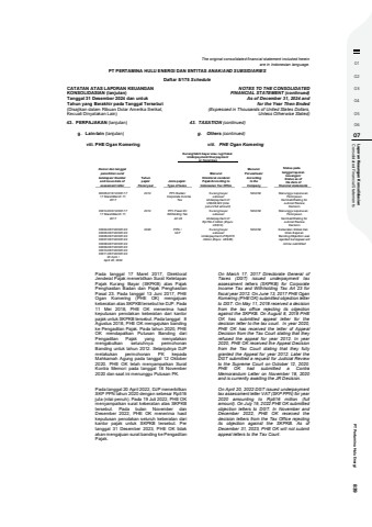 01020304050607 Consolidated Financial Statements Laporan Keaungan Konsolidasian PT Pertamina Hulu Energi 839The original consolidated financial statement included hereinare in Indonesian language.PT PERTAMINA HULU ENERGI DAN ENTITAS ANAK/AND SUBSIDIARIESDaftar 5/175 ScheduleCATATAN ATAS LAPORAN KEUANGANKONSOLIDASIAN (lanjutan)Tanggal 31 Desember 2024 dan untukTahun yang Berakhir pada Tanggal Tersebut(Disajikan dalam Ribuan Dolar Amerika Serikat,Kecuali Dinyatakan Lain)NOTES TO THE CONSOLIDATEDFINANCIAL STATEMENT (continued)As of December 31, 2024 andfor the Year Then Ended(Expressed in Thousands of United States Dollars,Unless Otherwise Stated)43. PERPAJAKAN (lanjutan) 43. TAXATION (continued)g. Lain-lain (lanjutan) g. Others (continued)viii. PHE Ogan Komering viii. PHE Ogan KomeringKurang/lebih bayar atau rugi fiskalUnderpayment/Overpayment or fiscal loss .Nomor dan tanggalpenerbitan suratketetapan/ Numberand issue date ofassesment letterTahunpajak/Fiscal yearJenis pajak/Type of taxesMenurutDirektorat JenderalPajak/According toIndonesian Tax OfficeMenurutPerusahaan/Accordingto theCompanyStatus padatanggal laporankeuangan/Status as ofthe date offinancial statements00005/216/12/081/1717 Maret/March 17,20172012 PPh Badan/Corporate IncomeTaxKurang bayarsebesar/Underpayment ofUS$38,023 (nilaipenuh/full amount)Nihil/Nil Menunggu keputusanPeninjauanKembali/Waiting forJudicial ReviewDecision00014/203/12/081/1717 Maret/March 17,20172012 PPh Pasal 23/Witholding TaxArt.23Kurang bayarsebesar/Underpayment ofRp159.2 million (Equiv.US$10)Nihil/Nil Menunggu keputusanPeninjauanKembali/Waiting forJudicial ReviewDecision00004/287/20/081/2200005/287/20/081/2200006/287/20/081/2200007/287/20/081/2200008/287/20/081/2200009/287/20/081/2200010/287/20/081/2200011/287/20/081/2220 April /April 20, 20222020 PPN /VATKurang bayarsebesar/Underpayment of Rp516million (Equiv. US$36)Nihil/Nil Keberatan ditolak dantidak diajukanBanding/Objection wasrejected but Appeal willnot be submittedPada tanggal 17 Maret 2017, DirektoratJenderal Pajak menerbitkan Surat KetetapanPajak Kurang Bayar (SKPKB) atas PajakPenghasilan Badan dan Pajak PenghasilanPasal 23. Pada tanggal 13 Juni 2017, PHEOgan Komering (PHE OK) mengajuankeberatan atas SKPKB tersebut ke DJP. Pada11 Mei 2018, PHE OK menerima hasilkeputusan penolakan keberatan dari kantorpajak untuk SKPKB tersebut. Pada tanggal 8Agustus 2018, PHE OK mengajukan bandingke Pengadilan Pajak. Pada tahun 2020, PHEOK mendapatkan Putusan Banding dariPengadilan Pajak yang menyatakanmengabulkan seluruhnya permohonanBanding untuk tahun 2012. Selanjutnya DJPmelakukan permohonan PK kepadaMahkamah Agung pada tanggal 12 Oktober2020. PHE OK telah menyampaikan SuratKontra Memori pada tanggal 18 November2020 dan saat ini menunggu Putusan PK.On March 17, 2017 Directorate General ofTaxes (DGT) issued underpayment taxassessment letters (SKPKB) for CorporateIncome Tax and Withholding Tax Art 23 forfiscal year 2012. On June 13, 2017 PHE OganKomering (PHE OK) submitted objection letterto DGT. On May 11, 2018 received a decisionfrom the tax office rejecting its objectionagainst the SKPKB. On August 8, 2018 PHEOK has submitted appeal letter for thedecision letter to the tax court. In year 2020,PHE OK has received the letter of AppealDecision from the Tax Court stating that theyrefused the appeal for year 2012. In year2020, PHE OK received the Appeal Decisionfrom the Tax Court stating that they fullygranted the Appeal for year 2012. Later theDGT submitted a request for Judicial Reviewto the Supreme Court on October 12, 2020.PHE OK had submitted a ContraMemorandum Letter on November 18, 2020and is currently awaiting the JR Decision.Pada tanggal 20 April 2022, DJP menerbitkanSKP PPN tahun 2020 dengan sebesar Rp516juta (nilai penuh). Pada 19 Juli 2022, PHE OKmenyampaikan surat keberatan atas SKPKBtersebut. Pada bulan November danDesember 2022, PHE OK menerima hasilkeputusan penolakan seluruh keberatan darikantor pajak untuk SKPKB tersebut. Pertanggal 31 Desember 2023, PHE OK tidakakan mengajuan surat banding ke PengadilanPajak.On April 20, 2022 DGT issued underpaymenttax assessment letter VAT (SKP PPN) for year2020 amounting to Rp516 million (fullamount). On July 19, 2022 PHE OK submittedobjection letters to DGT. In November andDecember 2022, PHE OK received thedecision letters from the Tax Office rejectingits objection against the SKPKB. As ofDecember 31, 2023, PHE OK will not submitappeal letters to the Tax Court.