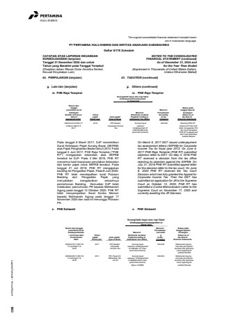 Laporan Tahunan %u2022 Annual Report 840HULU ENERGIThe original consolidated financial statement included hereinare in Indonesian language.PT PERTAMINA HULU ENERGI DAN ENTITAS ANAK/AND SUBSIDIARIESDaftar 5/176 ScheduleCATATAN ATAS LAPORAN KEUANGANKONSOLIDASIAN (lanjutan)Tanggal 31 Desember 2024 dan untukTahun yang Berakhir pada Tanggal Tersebut(Disajikan dalam Ribuan Dolar Amerika Serikat,Kecuali Dinyatakan Lain)NOTES TO THE CONSOLIDATEDFINANCIAL STATEMENT (continued)As of December 31, 2024 andfor the Year Then Ended(Expressed in Thousands of United States Dollars,Unless Otherwise Stated)43. PERPAJAKAN (lanjutan) 43. TAXATION (continued)g. Lain-lain (lanjutan) g. Others (continued)ix. PHE Raja Tempirai ix. PHE Raja TempiraiKurang/lebih bayar atau rugi fiskalUnderpayment/Overpayment or fiscal loss . Nomor dantanggalpenerbitan suratketetapan/Number and issuedate ofassesment letterTahunpajak/Fiscal yearJenis pajak/Type of taxesMenurutDirektorat JenderalPajak/According toIndonesian Tax OfficeMenurutPerusahaan/Accordingto theCompanyStatus padatanggal laporankeuangan/Status as ofthe date offinancial statements00004/216/12/081/176 Maret/ March 6,20172012 PPh Badan/Corporate IncomeTaxKurang bayarsebesar/Underpayment ofUS$246,388 (nilaipenuh/full amount)Nihil/Nil Banding PHE RTditerima PP dan DJPtelah mengajukan PK/Tax Court acceptedPHE RT%u2019s appeal andDGT had submittedJudicial ReviewPada tanggal 6 Maret 2017, DJP menerbitkanSurat Ketetapan Pajak Kurang Bayar (SKPKB)atas Pajak Penghasilan Badan tahun 2012. Padatanggal 5 Juni 2017, PHE Raja Tempirai (%u201cPHERT%u201d) mengajukan keberatan atas SKPKBtersebut ke DJP. Pada 3 Mei 2018, PHE RTmenerima hasil keputusan penolakan keberatandari kantor pajak untuk SKPKB tersebut. Padatanggal 31 Juli 2018, PHE RT mengajukanbanding ke Pengadilan Pajak. Pada 8 Juni 2020,PHE RT telah mendapatkan surat PutusanBanding dari Pengadilan Pajak yangmenyatakan mengabulkan seluruhnyapermohonan Banding. Kemudian DJP telahmelakukan permohonan PK kepada MahkamahAgung pada tanggal 12 Oktober 2020. PHE RTtelah menyampaikan Surat Kontra Memorikepada Mahkamah Agung pada tanggal 17November 2020 dan saat ini menunggu PutusanPK.On March 6, 2017 DGT issued underpaymenttax assessment letters (SKPKB) for CorporateIncome Tax for fiscal year 2012. On June 5,2017 PHE Raja Tempirai (PHE RT) submittedobjection letter to DGT. On May 3, 2018 PHERT received a decision from the tax officerejecting its objection against the SKPKB. OnJuly 31, 2018 PHE RT submitted appeal letterfor the decision letter to the tax court. On June8, 2020 PHE RT received the Tax CourtDecision which has fully granted the Appeal forCorporate Income Tax. Then the DGT hassubmitted an application for JR to the SupremeCourt on October 12, 2020. PHE RT hassubmitted a Contra Memorandum Letter to theSupreme Court on November 17, 2020 andcurrently awaiting the JR Decision.x. PHE Salawati x. PHE SalawatiKurang/lebih bayar atau rugi fiskal/Underpayment/overpayment orfiscal lossNomor dan tanggalpenerbitan suratketetapan/Number and issue dateof assesmentletterTahunpajak/Fiscal yearJenis pajak/Type of taxesMenurutDirektorat JenderalPajak/According toIndonesian Tax OfficeMenurutPerusahaan/Accordingto theCompanyStatus padatanggal laporankeuangan/Status as ofthe date offinancial statements00002/216/11/081/1613 April/April 13,20162011 PPh Badan/CorporateIncome TaxKurang bayarsebesar/ Underpaymentof US$283,127 (nilaipenuh/full amount)Nihil/Nil Mahkamah Agungmenolak peninjauankembali /the SupremeCourt rejecting itsJudicial Review00036/203/11/081/1613 April/April 13,20162011 PPh Pasal 23/Witholding TaxArt 23Kurang bayarsebesar/ Underpaymentof Rp899 million (nilaipenuh/full amount)(Equiv US$58)Nihil/Nil Mahkamah Agungmenolak peninjauankembali /the SupremeCourt rejecting itsJudicial Review