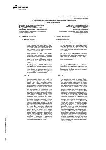 Laporan Tahunan %u2022 Annual Report 842HULU ENERGIThe original consolidated financial statement included hereinare in Indonesian language.PT PERTAMINA HULU ENERGI DAN ENTITAS ANAK/AND SUBSIDIARIESDaftar 5/178 ScheduleCATATAN ATAS LAPORAN KEUANGANKONSOLIDASIAN (lanjutan)Tanggal 31 Desember 2024 dan untukTahun yang Berakhir pada Tanggal Tersebut(Disajikan dalam Ribuan Dolar Amerika Serikat,Kecuali Dinyatakan Lain)NOTES TO THE CONSOLIDATEDFINANCIAL STATEMENT (continued)As of December 31, 2024 andfor the Year Then Ended(Expressed in Thousands of United States Dollars,Unless Otherwise Stated)43. PERPAJAKAN (lanjutan) 43. TAXATION (continued)g. Lain-lain (lanjutan) g. Others (continued)xi. PHKT (lanjutan) xi. PHKT (Continued)Pada tanggal 26 April 2022, DJPmenerbitkan SKP kurang bayar PBB untuktahun 2019-2020 sebesar AS$10.832. AtasSKP tersebut, PHKT telah mengajukansurat keberatan kepada DJP.Pada tanggal 22 Juni 2023, PHKTmenerima hasil keputusan penolakankeberatan dari kantor pajak untuk SKPPBBtahun 2020. Pada tanggal 14 September2023, PHKT telah mengajukan Bandingatas putusan tersebut kepada PengadilanPajak.On April 26, 2022, DGT issued 2019-2020Land and Building Tax Underpayment TaxAssessment Letter in the amount ofUS$10,832. PHKT has submitted an objectionletter to DGT.On June 22, 2023, PHKT received a decisionfrom the tax office rejecting its objection for theyear 2020. On September 14, 2023, PHKThad submitted appeal letter for the decisionletter to the tax court.Pada tanggal 13 Juli 2023, PHKT menerimahasil keputusan penolakan keberatan darikantor pajak untuk SKPPBB tahun 2019.Pada tanggal 14 September 2023, PHKTtelah mengajukan Banding atas putusantersebut kepada Pengadilan Pajak.On July 13, 2023, PHKT received a decisionfrom the tax office rejecting its objection for theyear 2019. On September 14, 2023, PHKThad submitted an appeal letter for the decisionletter to the tax court.xii. PHR xii. PHRPerusahaan menerima SKPD PAT (SuratKetetapan Pajak Daerah atas Pajak AirTanah) masa Agustus sampai denganOktober 2021 dari Pemerintah DaerahRokan Hilir (%u201cRohil%u201d) (tertanggal 12November 2021) dan Siak (tertanggal 19November 2021) total SKPD senilaiRp103,8 miliar. SKPD PAT ini diterbitkanatas pemanfaatan air terproduksi yangmenurut Perusahaan seharusnya tidakdikenakan PAT karena bukan merupakanobjek menurut Peraturan Menteri ESDMNomor 20 Tahun 2017 tentang PedomanPenetapan Nilai Perolehan Air Tanah.Perusahaan kemudian mendapatkanpenegasan tertulis dari Sekretaris JenderalKementrian ESDM melalui Surat Nomor T150/HK.01/SJN.H/2022 tanggal 2 Februari2022 yang menyatakan bahwa pengenaanPAT pada kegiatan usaha hulu migas untukair yang ikut terproduksi hendaknyamenunggu perubahan Peraturan MenteriESDM Nomor 20 Tahun 2017 selesaidiundangkan. Perusahaan menempuh jalurdispute (proses keberatan) sebagaimanadiminta oleh Pemerintah Daerah Rohil,sedangkan Pemerintah Daerah Siak dapatmemahami penjelasan perusahaansehingga memutuskan untuk tidakmenindaklanjuti penagihan SKPD.The Company received SKPD PAT (RegionalTax Assessment Letter on Ground WaterTax) for the period August to October 2021from the Municipal Governments of RokanHilir (%u201cRohil%u201d) (dated November 12, 2021) andSiak (dated November 19, 2021) with a totalSKPD worth IDR103.8 billion. This SKPDPAT was issued for the use of associatedwater / produced water which according tothe Company should not be subject to PATbecause it is not an object according to theRegulation of the Minister of Energy andMineral Resources Number 20 of 2017concerning Guidelines for Determining theAcquisition Value of Groundwater. TheCompany then received confirmation letterfrom Secretary General of the Ministry ofEnergy and Mineral Resources throughLetter No. T-150/HK.01/SJN.H/2022 datedFebruary 2, 2022 which stated that theimposition of PAT for water by-producedduring upstream Oil and gas businessactivities should wait for changes on Ministerof Energy and Mineral Resources RegulationNo. 20 of 2017, which still on process of to bepromulgated. The company took the dispute(objection process) as requested byMunicipal Governments of Rokan Hilir, whileMunicipal Governments of Siak the canaccept the explanation of Company so decidenot to issue SKPD.