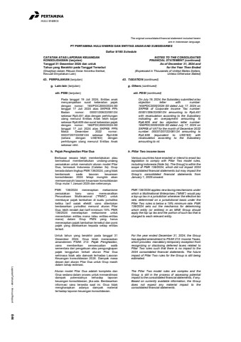Laporan Tahunan %u2022 Annual Report 844HULU ENERGIThe original consolidated financial statement included hereinare in Indonesian language.PT PERTAMINA HULU ENERGI DAN ENTITAS ANAK/AND SUBSIDIARIESDaftar 5/180 ScheduleCATATAN ATAS LAPORAN KEUANGANKONSOLIDASIAN (lanjutan)Tanggal 31 Desember 2024 dan untukTahun yang Berakhir pada Tanggal Tersebut(Disajikan dalam Ribuan Dolar Amerika Serikat,Kecuali Dinyatakan Lain)NOTES TO THE CONSOLIDATEDFINANCIAL STATEMENT (continued)As of December 31, 2024 andfor the Year Then Ended(Expressed in Thousands of United States Dollars,Unless Otherwise Stated)43. PERPAJAKAN (lanjutan) 43. TAXATION (continued)g. Lain-lain (lanjutan) g. Others (continued)xiii. PDSI (lanjutan) xiii. PDSI (continued)Pada tanggal 19 Juli 2024, Entitas anakmenyampaikan surat keberatan pajakdengan nomor: 165/PDC2000/2024-S0tanggal 17 Juli 2024 atas SKPKB PPhBadan nomor: 00001/206/22/081/24sebesar Rp5.451 atas dengan perhitunganulang menurut Entitas Anak lebih bayarsebesar Rp6.609 dan surat keberatan pajakdengan nomor: 166/PDC2000/2024-S0tanggal 17 Juli 2024 atas SKPKB PPNMasa Desember 2022 nomor:00037/207/22/081/24 sebesar Rp2.636(setara dengan US$163) denganperhitungan ulang menurut Entitas Anaksebesar nihil.On July 19, 2024, the Subsidiary submitted a taxobjection letter with number:165/PDC2000/2024-S0 dated July 17, 2024 onSKPKB of Corporate Income Tax number:00001/206/22/081/24 amounting to Rp5,451with recalculation according to the Subsidiaryindicating an overpayment amounting toRp6,609 and tax objection letter number:166/PDC2000/2024-S0 dated July 17, 2024 onSKPKB of VAT for the month of December 2022number: 00037/207/22/081/24 amounting toRp2,636 (equivalent to US$163) withrecalculation according to the Subsidiaryamounting to nil.h. Pajak Penghasilan Pilar Dua h. Pillar Two income taxesBerbagai negara telah memberlakukan ataubermaksud memberlakukan undang-undangperpajakan untuk mematuhi aturan model PilarDua, termasuk Indonesia (Catatan 3s). Grupberada dalam lingkup PMK 136/2024, yang tidakberdampak pada laporan keuangankonsolidasian 2024 tetapi mungkin akanmempengaruhi laporan keuangan konsolidasianGrup mulai 1 Januari 2025 dan seterusnya.Various countries have enacted or intend to enact taxlegislation to comply with Pillar Two model rules,including Indonesia (Note 3s). The Group] is within thescope of PMK 136/2024, which did not impact 2024consolidated financial statements but may impact theGroup%u2019s consolidated financial statements fromJanuary 1, 2025 onward.PMK 136/2024 menerapkan mekanismeperpajakan baru yang mensyaratkanPerusahaan Multinasional (%untukmembayar pajak tambahan di suatu yurisdiksiketika tarif pajak efektif, yang ditentukanberdasarkan yurisdiksi menurut aturan PilarDua, lebih rendah dari tarif minimum 15%. PMK136/2024 menetapkan mekanisme untukmenentukan entitas mana (atau entitas-entitasmana) dalam Grup PMN yang harusmenerapkan pajak tambahan tersebut dan porsipajak yang dibebankan kepada setiap entitasterkait.PMK 136/2024 applies new taxing mechanisms underwhich a Multinational Enterprises (%u201cMNE%u201d) would paya top-up tax in a jurisdiction whenever the efective taxrate, determined on a jurisdictional basis under thePillar Two rules is below a 15% minimum rate. PMK136/2024 sets out the mechanics for determiningwhich entity (or entities) in an MNE Group shouldapply the top-up tax and the portion of such tax that ischarged to each relevant entity.Untuk tahun yang berakhir pada tanggal 31Desember 2024, Grup telah menerapkanamandemen PSAK 212: Pajak Penghasilan,yang memberikan pengecualian wajibsementara dari pengakuan atau pengungkapanpajak tangguhan terkait aturan Pilar Duasehingga tidak ada dampak terhadap LaporanKeuangan konsolidasian 2024. Dampak masadepan dari aturan Pilar Dua untuk Grup masihdalam tahap estimasi.For the year ended December 31, 2024, the Grouphas applied amendment to PSAK 212: Income Taxes,which provides mandatory temporary exception fromrecognizing or disclosing deferred taxes related toPillar Two rules such that there is no impact to the2024 consolidated financial statements. The futureimpact of Pillar Two rules for the Group is still beingestimated.Aturan model Pilar Dua adalah kompleks danGrup sedang dalam proses untuk mengestimasidampak potensialnya terhadap laporankeuangan konsolidasian, jika ada. Berdasarkaninformasi yang tersedia saat ini, Grup tidakmengharapkan adanya dampak materialterhadap laporan keuangan konsolidasian.The Pillar Two model rules are complex and theGroup is still in the process of assessing potentialimpact to the consolidated financial statements, if any.Based on currently available information, the Groupdoes not expect any material impact to theconsolidated financial statements.