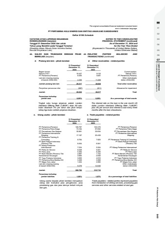 01020304050607 Consolidated Financial Statements Laporan Keaungan Konsolidasian PT Pertamina Hulu Energi 849The original consolidated financial statement included hereinare in Indonesian language.PT PERTAMINA HULU ENERGI DAN ENTITAS ANAK/AND SUBSIDIARIESDaftar 5/185 ScheduleCATATAN ATAS LAPORAN KEUANGANKONSOLIDASIAN (lanjutan)Tanggal 31 Desember 2024 dan untukTahun yang Berakhir pada Tanggal Tersebut(Disajikan dalam Ribuan Dolar Amerika Serikat,Kecuali Dinyatakan Lain)NOTES TO THE CONSOLIDATEDFINANCIAL STATEMENT (continued)As of December 31, 2024 andfor the Year Then Ended(Expressed in Thousands of United States Dollars,Unless Otherwise Stated)44. SALDO DAN TRANSAKSI DENGAN PIHAKBERELASI (lanjutan)44. RELATED PARTIES BALANCES ANDTRANSACTIONS (continued)d. Piutang lain-lain - pihak berelasi d. Other receivables - related parties 31 Desember/ 31 Desember/December 31, December 31,2024 2023Bagian lancar: Current portion:Natuna 2 B.V. 16.427 8.132 Natuna 2 B.V.PT Pertamina (Persero) 8.455 9.491 PT Pertamina (Persero)Lain-lain (masing-masing Other (individually di bawah AS$4.000) 4.335 11.205 below US$4,000)Jumlah piutang lain-lain 29.217 28.828 Total other receivablesPenyisihan penurunan nilai (587) (611) Allowance for impairmentJumlah 28.630 28.217 TotalPersentase terhadap jumlah aset 0,09% 0,09% As a percentage of total assetsTingkat suku bunga pinjaman adalah LondonInterbank Offering Rate (%u201cLIBOR%u201d) dolar AS satubulan ditambah 3% per tahun dan jatuh temposetiap tiga bulan setelah pinjaman dicairkan.The interest rate on the loan is the one month USdollar London Interbank Offering Rate (%u201cLIBOR%u201d)plus 3% per annum and interest is due every threemonths after the loan drawdowns.e. Utang usaha - pihak berelasi e. Trade payables - related parties 31 Desember/ 31 Desember/December 31, December 31,2024 2023PT Pertamina (Persero) 105.797 103.376 PT Pertamina (Persero)PT Pertamina Patra Niaga 73.164 97.892 PT Pertamina Patra NiagaPT Perusahaan Gas Negara 30.891 30.604 PT Perusahaan Gas NegaraPT Pertamina International PT Pertamina International Shipping 17.197 20.459 ShippingPT Pertamina Training & Consulting 8.764 7.825 PT Pertamina Training & ConsultingPT Bank Rakyat Indonesia PT Bank Rakyat Indonesia (Persero) Tbk 8.454 6.941 (Persero) TbkPT Kilang Pertamina Internasional 7.224 5.004 PT Kilang Pertamina InternasionalPT Pelita Air Service 6.048 5.001 PT Pelita Air ServicePT Patra Jasa 5.393 6.256 PT Patra JasaPT Bank Mandiri (Persero) Tbk 4.897 1.744 PT Bank Mandiri (Persero) TbkKementerian Keuangan 3.665 3.906 Kementerian KeuanganPT Tugu Pratama Indonesia 3.655 4.616 PT Tugu Pratama IndonesiaPT Pertamina Bina Medika IHC 3.309 3.568 PT Pertamina Bina Medika IHCPT Migas Hulu Jabar 1.024 2.690 PT Migas Hulu JabarLain-lain (masing-masing Other (individually di bawah AS$4.000) 9.278 12.836 below US$4,000)Jumlah 288.760 312.718 TotalPersentase terhadap jumlah liabilitas 1,88% 1,87% As a percentage of total liabilitiesUtang usaha kepada pihak berelasi merupakanutang dari transaksi jasa pengeboran, jasaprocessing gas dan jasa lainnya terkait minyakdan gas.Trade payables - related parties represent payablesfrom transaction of drilling services, processing gasservices and other services related oil and gas.
