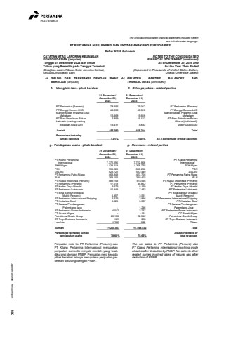 Laporan Tahunan %u2022 Annual Report 850HULU ENERGIThe original consolidated financial statement included hereinare in Indonesian language.PT PERTAMINA HULU ENERGI DAN ENTITAS ANAK/AND SUBSIDIARIESDaftar 5/186 ScheduleCATATAN ATAS LAPORAN KEUANGANKONSOLIDASIAN (lanjutan)Tanggal 31 Desember 2024 dan untukTahun yang Berakhir pada Tanggal Tersebut(Disajikan dalam Ribuan Dolar Amerika Serikat,Kecuali Dinyatakan Lain)NOTES TO THE CONSOLIDATEDFINANCIAL STATEMENT (continued)As of December 31, 2024 andfor the Year Then Ended(Expressed in Thousands of United States Dollars,Unless Otherwise Stated)44. SALDO DAN TRANSAKSI DENGAN PIHAKBERELASI (lanjutan)44. RELATED PARTIES BALANCES ANDTRANSACTIONS (continued)f. Utang lain-lain - pihak berelasi f. Other payables - related parties 31 Desember/ 31 Desember/December 31, December 31,2024 2023PT Pertamina (Persero) 78.496 79.062 PT Pertamina (Persero)PT Donggi Senoro LNG 43.850 49.528 PT Donggi Senoro LNGMandiri Migas Pratama Kutai Mandiri Migas Pratama Kutai Mahakam 13.468 15.608 MahakamPT Riau Petroleum Rokan 5.859 15.123 PT Riau Petroleum RokanLain-lain (masing-masing Others ((individually di bawah AS$4.000) 13.417 8.883 under US$4,000)Jumlah 155.090 168.204 TotalPersentase terhadap jumlah liabilitas 1,01% 1,01% As a percentage of total liabilitiesg. Pendapatan usaha - pihak berelasi g. Revenues - related parties 31 Desember/ 31 Desember/December 31, December 31,2024 2023PT Kilang Pertamina PT Kilang Pertamina Internasional 7.372.295 7.722.808 InternasionalSKK Migas 1.133.213 1.308.765 SKK MigasPGN 733.220 566.206 PGNDSLNG 523.722 512.449 DSLNGPT Pertamina Patra Niaga 463.843 423.756 PT Pertamina Patra NiagaPLN 368.102 319.403 PLNPT Pupuk Indonesia (Persero) 589.759 514.565 PT Pupuk Indonesia (Persero)PT Pertamina (Persero) 17.518 35.862 PT Pertamina (Persero)PT Kaltim Daya Mandiri 9.673 8.169 PT Kaltim Daya MandiriPT Pertamina Lubricants 10.349 7.462 PT Pertamina LubricantsPT Bina Bangun Wibawa PT Bina Bangun WibawaMukti (Persero) 4.357 3.531 Mukti (Persero)PT Pertamina Internasional Shipping 3.375 2.846 PT Pertamina Internasional ShippingPT Krakatau Steel 3.023 3.587 PT Krakatau SteelPT Sarana Pembangunan PT Sarana Pembangunan Palembang Jaya - 1.246 Palembang JayaPT Pertamina Power Indonesia 4.012 2.257 PT Pertamina Power IndonesiaPT Gresik Migas - 1.151 PT Gresik MigasPetrokimia Gresik Group 26.180 22.942 Petrokimia Gresik GroupPT Tugu Pratama Indonesia 160 839 PT Tugu Pratama IndonesiaLain-lain 1.266 988 OthersJumlah 11.264.067 11.458.832 TotalPersentase terhadap jumlah As a percentage of pendapatan usaha 78,60% 78,66% total revenuesPenjualan neto ke PT Pertamina (Persero) danPT Kilang Pertamina Internasional merupakanpenjualan domestik minyak mentah yang telahdikurangi dengan PNBP. Penjualan neto kepadapihak berelasi lainnya merupakan penjualan gassetelah dikurangi dengan PNBP.The net sales to PT Pertamina (Persero) danPT Kilang Pertamina Internasional involving crudeoil sales after deduction by PNBP. Net sales to otherrelated parties involved sales of natural gas afterdeduction of PNBP.