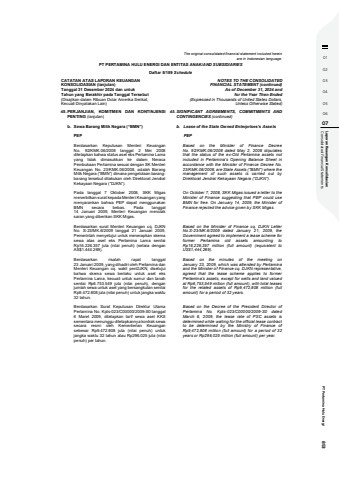 01020304050607 Consolidated Financial Statements Laporan Keaungan Konsolidasian PT Pertamina Hulu Energi 853The original consolidated financial statement included hereinare in Indonesian language.PT PERTAMINA HULU ENERGI DAN ENTITAS ANAK/AND SUBSIDIARIESDaftar 5/189 ScheduleCATATAN ATAS LAPORAN KEUANGANKONSOLIDASIAN (lanjutan)Tanggal 31 Desember 2024 dan untukTahun yang Berakhir pada Tanggal Tersebut(Disajikan dalam Ribuan Dolar Amerika Serikat,Kecuali Dinyatakan Lain)NOTES TO THE CONSOLIDATEDFINANCIAL STATEMENT (continued)As of December 31, 2024 andfor the Year Then Ended(Expressed in Thousands of United States Dollars,Unless Otherwise Stated)45.PERJANJIAN, KOMITMEN DAN KONTINJENSIPENTING (lanjutan)45. SIGNIFICANT AGREEMENTS, COMMITMENTS ANDCONTINGENCIES (continued)b. Sewa Barang Milik Negara (%u201cBMN%u201d) b. Lease of the State Owned Enterprises%u2019s AssetsPEP PEPBerdasarkan Keputusan Menteri KeuanganNo. 92/KMK.06/2008 tanggal 2 Mei 2008ditetapkan bahwa status aset eks Pertamina Lamayang tidak dimasukkan ke dalam NeracaPembukaan Pertamina sesuai dengan SK MenteriKeuangan No. 23/KMK.06/2008, adalah BarangMilik Negara (%u201cBMN%u201d) dimana pengelolaan barangbarang tersebut dilakukan oleh Direktorat JendralKekayaan Negara (%u201cDJKN%u201d).Based on the Minister of Finance DecreeNo. 92/KMK.06/2008 dated May 2, 2008 stipulatesthat the status of the ex-Old Pertamina assets notincluded in Pertamina's Opening Balance Sheet inaccordance with the Minister of Finance Decree No.23/KMK.06/2008, are State Assets (\management of such assets is carried out byDirektorat Jendral Kekayaan Negara (%u201cDJKN%u201d).Pada tanggal 7 Oktober 2008, SKK Migasmenerbitkan surat kepada Menteri Keuangan yangmenyarankan bahwa PEP dapat menggunakanBMN secara bebas. Pada tanggal14 Januari 2009, Menteri Keuangan menolaksaran yang diberikan SKK Migas.On October 7, 2008, SKK Migas issued a letter to theMinister of Finance suggesting that PEP could useBMN for free. On January 14, 2009, the Minister ofFinance rejected the advice given by SKK Migas.Berdasarkan surat Menteri Keuangan cq. DJKNNo. S-23/MK.6/2009 tanggal 21 Januari 2009,Pemerintah menyetujui untuk menerapkan skemasewa atas aset eks Pertamina Lama senilaiRp16.226.357 juta (nilai penuh) (setara denganAS$1.444.269).Based on the Minister of Finance cq. DJKN LetterNo.S-23/MK.6/2009 dated January 21, 2009, theGovernment agreed to implement a lease scheme forformer Pertamina old assets amounting toRp16,226,357 million (full amount) (equivalent toUS$1,444,269).Berdasarkan risalah rapat tanggal23 Januari 2009, yang dihadiri oleh Pertamina danMenteri Keuangan cq. wakil penDJKN, disetujuibahwa skema sewa berlaku untuk aset eksPertamina Lama, kecuali untuk sumur dan tanahsenilai Rp6.753.549 juta (nilai penuh), denganjumlah sewa untuk aset yang bersangkutan senilaiRp9.472.808 juta (nilai penuh) untuk jangka waktu32 tahun.Based on the minutes of the meeting onJanuary 23, 2009, which was attended by Pertaminaand the Minister of Finance cq. DJKN representative,agreed that the lease scheme applies to formerPertamina%u2019s assets, except for wells and land valuedat Rp6,753,549 million (full amount), with total leasesfor the related assets of Rp9,472,808 million (fullamount) for a period of 32 years.Berdasarkan Surat Keputusan Direktur UtamaPertamina No. Kpts-023/C00000/2009-S0 tanggal6 Maret 2009, ditetapkan tarif sewa aset KKSsementara menunggu ditetapkannya kontrak sewasecara resmi oleh Kementerian Keuangansebesar Rp9.472.808 juta (nilai penuh) untukjangka waktu 32 tahun atau Rp296.025 juta (nilaipenuh) per tahun.Based on the Decree of the President Director ofPertamina No. Kpts-023/C00000/2009-S0 datedMarch 6, 2009, the lease rate of PSC assets isdetermined while waiting for the official lease contractto be determined by the Ministry of Finance ofRp9,472,808 million (full amount) for a period of 32years or Rp296,025 million (full amount) per year.