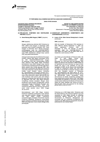 Laporan Tahunan %u2022 Annual Report 854HULU ENERGIThe original consolidated financial statement included hereinare in Indonesian language.PT PERTAMINA HULU ENERGI DAN ENTITAS ANAK/AND SUBSIDIARIESDaftar 5/190 ScheduleCATATAN ATAS LAPORAN KEUANGANKONSOLIDASIAN (lanjutan)Tanggal 31 Desember 2024 dan untukTahun yang Berakhir pada Tanggal Tersebut(Disajikan dalam Ribuan Dolar Amerika Serikat,Kecuali Dinyatakan Lain)NOTES TO THE CONSOLIDATEDFINANCIAL STATEMENT (continued)As of December 31, 2024 andfor the Year Then Ended(Expressed in Thousands of United States Dollars,Unless Otherwise Stated)45.PERJANJIAN, KOMITMEN DAN KONTINJENSIPENTING (lanjutan)45. SIGNIFICANT AGREEMENTS, COMMITMENTS ANDCONTINGENCIES (continued)b. Sewa Barang Milik Negara (%u201cBMN%u201d) (lanjutan) b. Lease of the State Owned Enterprises%u2019s Assets(continued)PEP (lanjutan) PEP (continued)Dengan dialihkannya aktivitas KKS Pertamina kePEP, efektif mulai tanggal 17 September 2005perjanjian sewa tersebut melibatkan PEP. Padatanggal 12 Desember 2014, Menteri Keuanganmenyampaikan surat No. S-837/MK.06/2014kepada SKK Migas dan menyatakan bahwa biayasewa BMN diperlakukan sebagai biaya operasiPEP yang dapat dikembalikan.With the transfer of Pertamina%u2019s PSC activities toPEP, effective starting September 17, 2005, thelease agreement involved PEP. OnDecember 12, 2014, the Minister of Financesubmitted letter No. S-837/MK.06/2014 toSKK Migas and states that the BMN lease fee istreated as a cost recovery of PEP.Sebagai tindak lanjut atas Surat Menteri Keuangantersebut, Kepala SKK Migas menerbitkan SuratNo. SRT 1294/SKKO0000/2014/S4 tanggal30 Desember 2014 dan menyampaikan bahwapada dasarnya SKK Migas dapat menyetujuipembebanan sewa BMN sebagai biaya operasi(cost recovery) sepanjang aset tersebut digunakandalam operasi hulu minyak dan gas PEP. Atasdasar hasil inventarisasi aset BMN eks Pertaminayang telah dilaporkan kepada Menteri Keuanganmelalui Surat Direktur Utama PertaminaNo. 194/C00000/2011-S0 tanggal 29 Maret 2011,SKK Migas berpendapat bahwa dasar pengenaansewa yang seharusnya adalah Rp6.630.929 juta(nilai revaluasi) (nilai penuh) yaitu aset kategoriequipment, bangunan dan aset lainnya yang saatini digunakan oleh PEP. SKK Migas kemudianmenghitung kembali kewajiban dengan dasarpengenaan sewa tersebut menggunakan metodeyang sama dengan Kementerian Keuangan danmenyatakan bahwa kewajiban sewa yangseharusnya adalah Rp2.227.578 juta (nilai penuh)untuk mulai periode tahun 2003 hingga30 Juni 2014.As a follow up to the Minister of Finance%u2019s letter, theHead of SKK Migas issued letterNo. SRT-1294/SKKO0000/2014/S4 datedDecember 30, 2014 and said that basically SKKMigas can approve the imposition of BMN leases asan operating cost (cost recovery) as long as theseassets are used in the upstream oil and gasoperations of PEP. As the result of the stocktakingof BMN ex Pertamina%u2019s assets that have beenreported to the Minister of Finance through a letterfrom the President Director of PertaminaNo. 194/C00000/2011-S0 dated March 29, 2011,SKK Migas stated that the basis for leasing shouldbe Rp6,630,929 million (revaluation value)(full amount), for assets, equipment, buildings andother assets that currently uses by PEP. SKK Migasrecalculated the liabilities on the basis of the leaseuse the same method as the Ministry of Finance andstated the lease liabilities that should be paid isRp2,227,578 million (full amount) for the startingperiod 2003 to June 30, 2014.Menindaklanjuti surat SKK Migas tersebut,Pertamina melakukan pembayaran sewa sebesarnilai yang telah disetujui sebagai cost recoveryoleh SKK Migas melalui mekanismememperhitungkan kewajiban Pemerintah kepadaPertamina (offsetting). Manajemen berpendapatbahwa perjanjian kontraktual sehubungan denganBMN yang digunakan harus dicatat sebagai sewapembiayaan.Following up on SKK Migas letter, Pertamina paidthe lease based on the amounts agreed to be costrecovered by SKK Migas through an offsettingmechanism against amounts due from theGovernment to Pertamina. Management hasconcluded that the contractual arrangement withrespect to the BMN leasing arrangement should beaccounted for as a finance lease.