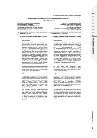 01020304050607 Consolidated Financial Statements Laporan Keaungan Konsolidasian PT Pertamina Hulu Energi 855The original consolidated financial statement included hereinare in Indonesian language.PT PERTAMINA HULU ENERGI DAN ENTITAS ANAK/AND SUBSIDIARIESDaftar 5/191 ScheduleCATATAN ATAS LAPORAN KEUANGANKONSOLIDASIAN (lanjutan)Tanggal 31 Desember 2024 dan untukTahun yang Berakhir pada Tanggal Tersebut(Disajikan dalam Ribuan Dolar Amerika Serikat,Kecuali Dinyatakan Lain)NOTES TO THE CONSOLIDATEDFINANCIAL STATEMENT (continued)As of December 31, 2024 andfor the Year Then Ended(Expressed in Thousands of United States Dollars,Unless Otherwise Stated)45. PERJANJIAN, KOMITMEN DAN KONTINJENSIPENTING (lanjutan)45. SIGNIFICANT AGREEMENTS, COMMITMENTS ANDCONTINGENCIES (continued)b. Sewa Barang Milik Negara (%u201cBMN%u201d) (lanjutan) b. Lease of the State Owned Enterprises%u2019s Assets(continued)PEP (lanjutan) PEP (continued)Pada tanggal 20 September 2016, telahditandatangani Perjanjian Sewa Barang MilikNegara antara Kementerian Keuangan RepublikIndonesia dengan PEP No. PRJ-3-MK.6/2016dan No. 1307/EP0000/2016-S0 (%u201cPerjanjian%u201d)dengan dasar pengenaan sewa BMN sebesarRp6.630.929 juta (nilai penuh) (setara denganAS$504.560). Berdasarkan Perjanjian tersebut,Kementerian Keuangan Republik Indonesiatidak akan menagih biaya sewa atas BMN yangtidak digunakan oleh PEP karena BMN tersebuttidak termasuk dalam lingkup Perjanjian. Olehkarena itu, pada tahun 2016, PEP melakukankoreksi atas utang sewa BMN yang tidakdigunakan oleh PEP senilai Rp1.527.330 juta(nilai penuh) (setara dengan AS$112.610).On September 20, 2016, a State Property RentalAgreement was signed between the Ministry ofFinance of the Republic of Indonesia and PEPNo. PRJ-3-MK.6/2016 andNo. 1307/EP0000/2016-S0 (\basis of imposition of BMN rental ofRp6,630,929 million (full amount) (equivalent toUS$504,560). Based on the agreement, theMinistry of Finance of the Republic of Indonesia willnot collect lease fees for BMN not used by PEPbecause the BMN is not included in the scope ofthe Agreement. Therefore, in 2016, PEP madecorrections on BMN lease payable which was notused by PEP in the amount of Rp1,527,330 million(full amount) (equivalent to US$112,610).Pada Juli 2024 dan Desember 2023 perusahaantelah melakukan pembayaran atas utang sewaBMN senilai Rp207.216 juta (setara dengan2024: 12.791, 2023: AS$13.789)In July 2024 and December 2023,the company made a payment for lease BMNamounted of Rp207,216 million (equivalent to 2024:12.791, 2023: US$13,789)PHI PHIPada tanggal 18 Juni 2019, Menteri Keuanganmengeluarkan Peraturan No. 89/PMK.06/2019tentang Pengelolaan Aset Milik Negara dariImplementasi Perjanjian Kontrak Kerja SamaHulu Minyak dan Gas Bumi(%u201cPMK No. 89/PMK.06/2019%u201d). Untuk periodesewa masa depan, metode perhitungan sewaaset akan mengacu pada PMKNo. 89/PMK.06/2019.On June 18, 2019, the Minister of Finance issuedRegulation No. 89/PMK.06/2019 regardingManagement of State-Owned Assets from theImplementation of the UpstreamOil and Gas Cooperation Contract(\periods, the method of calculating asset leases willrefer to PMK No.89/PMK.06/2019.PHI mengukur nilai wajar biaya pemanfaatanaset kepada Pemerintah dengan menggunakannilai wajar aset yang digunakan dikurangidengan faktor penyesuai dan insentif:a) pemetaan aset; b) penghapusan aset;c) biaya pengamanan; d) pelaporan aset;e) sertifikasi tanah; dan f) realisasi targetproduksi.PHI measures the fair value of the cost of utilizingassets to the Government using the fair value ofthe assets used deducted by adjustment factorsand incentives: a) asset mapping; b) write-offassets; c) security costs; d) asset reporting;e) land certification; and f) realization of productiontargets.