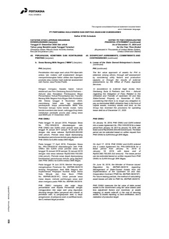 Laporan Tahunan %u2022 Annual Report 856HULU ENERGIThe original consolidated financial statement included hereinare in Indonesian language.PT PERTAMINA HULU ENERGI DAN ENTITAS ANAK/AND SUBSIDIARIESDaftar 5/192 ScheduleCATATAN ATAS LAPORAN KEUANGANKONSOLIDASIAN (lanjutan)Tanggal 31 Desember 2024 dan untukTahun yang Berakhir pada Tanggal Tersebut(Disajikan dalam Ribuan Dolar Amerika Serikat,Kecuali Dinyatakan Lain)NOTES TO THE CONSOLIDATEDFINANCIAL STATEMENT (continued)As of December 31, 2024 andfor the Year Then Ended(Expressed in Thousands of United States Dollars,Unless Otherwise Stated)45. PERJANJIAN, KOMITMEN DAN KONTINJENSIPENTING (lanjutan)45. SIGNIFICANT AGREEMENTS, COMMITMENTS ANDCONTINGENCIES (continued)b. Sewa Barang Milik Negara (%u201cBMN%u201d) (lanjutan) b. Lease of the State Owned Enterprises%u2019s Assets(continued)PHI (lanjutan) PHI (continued)Pendekatan nilai wajar aset untuk PHI diperolehantara lain melalui self assessment denganmempertimbangkan faktor utilitas dan kapasitasproduksi atau melalui hasil external assessmentoleh Kantor Jasa Penilai Publik.The fair value approach of assets for PHI isobtained, among others, through self assessmentby considering utility factors and productioncapacity or through the results of externalassessments by the Office of Public AppraisalServices.Dengan mengacu kepada kajian hukumeksternal Law Firm Oentoeng Suria & Partners %u2013Ashurst atas Kewajiban Pembayaran BiayaPemanfaatan Terkait Pemanfaatan dan TransferBarang Milik Negara Hulu Migas Oleh KontraktorAlih Kelola tanggal 6 November 2023,menimbang tidak ada lagi kewajibanpembayaran biaya pemanfaatan BMN EksTerminasi berupa harta benda modal, hartabenda inventaris dan tanah, sehingga Grup telahmelakukan pembalik provisi atas utang sewaaset BMN per 31 Desember 2023.In accordance to external legal review fromOentoeng Suria & Partners Law Firm %u2013 Ashurstregarding the Obligation of Fees Related to theUtilization and Transfer of Upstream Oil and GasState-Owned Property on November 6 2023,considering that there is no longer any obligation topay ex-terminated BMN utilization fees in the form ofcapital assets, inventory assets and land, so theGroup has reversed the provisions for operatinglease debt as of December 31, 2023PHE ONWJ PHE ONWJPada tanggal 16 Januari 2018, Perjanjian SewaNo. PRJ-1/KN/2018 ditandatangani olehPHE ONWJ dan DJKN untuk periode sewa daritanggal 19 Januari 2017 sampai 19 Januari 2018dengan nilai sewa sebesar Rp225.603.000.000(nilai penuh). Periode sewa dapat diperpanjangberdasarkan permohonan tertulis yang diajukan olehPHE ONWJ ke DJKN melalui SKK Migas.On January 16, 2018, PHE ONWJ and DJKN enteredinto a Lease Agreement No. PRJ-1/KN/2018 for a leaseperiod from January 19, 2017 to January 19, 2018, withlease cost of Rp225,603,000,000 (full amount). The leaseperiod can be extended based on written request fromPHE ONWJ to DJKN through SKK Migas.Pada tanggal 17 April 2018, Perjanjian SewaNo. PRJ-2/KN/2018 ditandatangani oleh PHEONWJ dan DJKN untuk periode sewa daritanggal 19 Januari 2018 sampai 18 Januari 2019dengan nilai sewa sebesar Rp202.650.750.000(nilai penuh). Periode sewa dapat diperpanjangberdasarkan permohonan tertulis yang diajukanoleh PHE ONWJ ke DJKN melalui SKK Migas.On April 17, 2018, PHE ONWJ and DJKN enteredinto a Lease Agreement No. PRJ-2/KN/2018 for alease period from January 19, 2018 toJanuary 18, 2019, with lease cost ofRp202,650,750,000 (full amount). The lease periodcan be extended based on written request from PHEONWJ to DJKN through SKK Migas.Pada tanggal 18 Juni 2019, Menteri Keuanganmengeluarkan Peraturan No. 89/PMK.06/2019tentang Pengelolaan Aset Milik Negara dariImplementasi Perjanjian Kontrak Kerja SamaHulu Minyak dan Gas Bumi (%u201cPMKNo. 89/PMK.06/2019%u201d). Untuk periode sewamasa depan, metode perhitungan sewa asetakan mengacu pada PMK No. 89/PMK.06/2019.On June 18, 2019, the Minister of Finance issuedRegulation No. 89/PMK.06/2019 regardingManagement of State-Owned Assets from theImplementation of the Upstream Oil and GasCooperation Contract (\For future leasing periods, the method of calculatingasset leases will refer to PMK No. 89/PMK.06/2019.PHE ONWJ mengukur nilai wajar biayapemanfaatan aset kepada Pemerintah denganmenggunakan nilai wajar aset yang digunakandikurangi dengan faktor penyesuai dan insentif: a)pemetaan aset; b) penghapusan aset; c) biayapengamanan; d) pelaporan aset; e) sertifikasi tanah;dan f) realisasi target produksi.PHE ONWJ measures the fair value of state ownedassets to the Government using fair value assets usedless adjustment factors and incentives: a) assetsmapping; b) assets write-off; c) the cost of securringassets; d) assets reporting; e) land certification; and f)realization of production target.