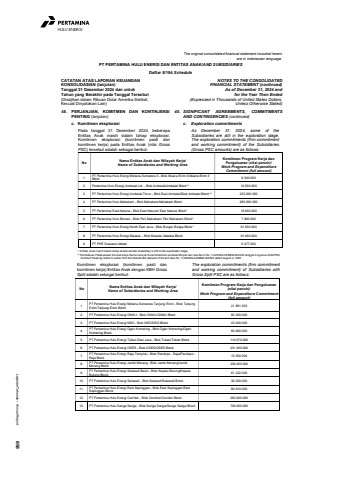 Laporan Tahunan %u2022 Annual Report 858HULU ENERGIThe original consolidated financial statement included hereinare in Indonesian language.PT PERTAMINA HULU ENERGI DAN ENTITAS ANAK/AND SUBSIDIARIESDaftar 5/194 ScheduleCATATAN ATAS LAPORAN KEUANGANKONSOLIDASIAN (lanjutan)Tanggal 31 Desember 2024 dan untukTahun yang Berakhir pada Tanggal Tersebut(Disajikan dalam Ribuan Dolar Amerika Serikat,Kecuali Dinyatakan Lain)NOTES TO THE CONSOLIDATEDFINANCIAL STATEMENT (continued)As of December 31, 2024 andfor the Year Then Ended(Expressed in Thousands of United States Dollars,Unless Otherwise Stated)45. PERJANJIAN, KOMITMEN DAN KONTINJENSIPENTING (lanjutan)45. SIGNIFICANT AGREEMENTS, COMMITMENTSAND CONTINGENCIES (continued)c. Komitmen eksplorasi c. Exploration commitmentsPada tanggal 31 Desember 2024, beberapaEntitas Anak masih dalam tahap eksplorasi.Komitmen eksplorasi (komitmen pasti dankomitmen kerja) pada Entitas Anak (nilai GrossPSC) tersebut adalah sebagai berikut:As December 31, 2024, some of theSubsidiaries are still in the exploration stage.The exploration commitments (firm commitmentand working commitment) of the Subsidiaries(Gross PSC amounts) are as follows:No Nama Entitas Anak dan Wilayah Kerja/Name of Subsidiaries and Working AreaKomitmen Program Kerja danPengeluaran (nilai penuh)/Work Program and ExpenditureCommitment (full amount)1. PT Pertamina Hulu Energi Metana Sumatera 5 - Blok Muara Enim II/Muara Enim IIBlock 9.540.0002. Pertamina Hulu Energi Ambalat Ltd. - Blok Ambalat/Ambalat Block** 16.500.0003. PT Pertamina Hulu Energi Ambalat Timur - Blok East Ambalat/East Ambalat Block** 225.000.0004. PT Pertamina Hulu Mahakam - Blok Mahakam/Mahakam Block 280.300.0005. PT Pertamina East Natuna - Blok East Natuna/ East Natuna Block* 18.000.0006. PT Pertamina Hulu Borneo - Blok Peri Mahakam/ Peri Mahakam Block* 7.800.0007. PT Pertamina Hulu Energi North East Java - Blok Bunga/ Bunga Block* 61.500.0008. PT Pertamina Hulu Energi Masela %u2013 Blok Masela/ Masela Block 91.000.0009. PT PHE Sulawesi Melati 6.477.000* Entitas Anak masih dalam tahap eksplorasi/the Subsidiary is still in the exploration stage.** Pembekuan Pelaksanaan Kontrak Kerja Sama merujuk Surat Direktorat Jenderal Minyak dan Gas Bumi No. T-226/MG.04/MEM.M/2022 tanggal 4 Agustus 2022/PSCContract Freezing refers to Letter from the Directorate General of Oil and Gas No. T-226/MG.04/MEM.M/2022 dated August 4, 2022Komitmen eksplorasi (komitmen pasti dankomitmen kerja) Entitas Anak dengan KBH GrossSplit adalah sebagai berikut:The exploration commitments (firm commitmentand working commitment) of Subsidiaries withGross Split PSC are as follows:No Nama Entitas Anak dan Wilayah Kerja/Name of Subsidiaries and Working AreaKomitmen Program Kerja dan Pengeluaran(nilai penuh)/Work Program and Expenditure Commitment(full amount)1. PT Pertamina Hulu Energi Metana Sumatera Tanjung Enim - Blok TanjungEnim/Tanjung Enim Block 21.861.3032. PT Pertamina Hulu Energi ONWJ - Blok ONWJ/ONWJ Block 82.300.0003. PT Pertamina Hulu Energi NSO - Blok NSO/NSO Block 43.000.0004. PT Pertamina Hulu Energi Ogan Komering - Blok Ogan Komering/OganKomering Block 60.600.0005. PT Pertamina Hulu Energi Tuban East Java - Blok Tuban/Tuban Block 114.070.0006. PT Pertamina Hulu Energi OSES - Blok OSES/OSES Block 231.000.0007. PT Pertamina Hulu Energi Raja Tempirai - Blok Pendopo - Raja/Pendopo -Raja Block 15.550.0008. PT Pertamina Hulu Energi Jambi Merang - Blok Jambi Merang/JambiMerang Block 239.300.0009. PT Pertamina Hulu Energi Salawati Basin - Blok Kepala Burung/KepalaBurung Block 61.222.00010. PT Pertamina Hulu Energi Salawati - Blok Salawati/Salawati Block 36.250.00011. PT Pertamina Hulu Energi East Sepinggan - Blok East Sepinggan/EastSepinggan Block 80.610.00012. PT Pertamina Hulu Energi Corridor - Blok Corridor/Corridor Block 250.000.00013. PT Pertamina Hulu Sanga Sanga - Blok Sanga Sanga/Sanga Sanga Block 703.000.000