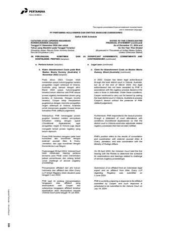 Laporan Tahunan %u2022 Annual Report 864HULU ENERGIThe original consolidated financial statement included hereinare in Indonesian language.PT PERTAMINA HULU ENERGI DAN ENTITAS ANAK/AND SUBSIDIARIESDaftar 5/200 ScheduleCATATAN ATAS LAPORAN KEUANGANKONSOLIDASIAN (lanjutan)Tanggal 31 Desember 2024 dan untukTahun yang Berakhir pada Tanggal Tersebut(Disajikan dalam Ribuan Dolar Amerika Serikat,Kecuali Dinyatakan Lain)NOTES TO THE CONSOLIDATEDFINANCIAL STATEMENT (continued)As of December 31, 2024 andfor the Year Then Ended(Expressed in Thousands of United States Dollars,Unless Otherwise Stated)45. PERJANJIAN, KOMITMEN DANKONTINJENSI PENTING (lanjutan)45. SIGNIFICANT AGREEMENTS, COMMITMENTS ANDCONTINGENCIES (continued)e. Perkara hukum (lanjutan) e. Legal case (continued)ii. Klaim Abandonment Costs pada BlokBasker Manta Gummy (Australia) 2November 2022 (lanjutan)ii. Claim for Abandonment Costs on Basker MantaGummy Block (Australia) (continued)Pada tahun 2022, Cooper telahmelakukan upaya hukum/gugatan melaluipengadilan negeri setempat di Victoria,Australia yang sampai dengan akhirMaret 2024 upaya hukum/gugatantersebut belum diterima oleh PHE sesuaiproses rogatory berdasarkan aturan yangberlaku di Indonesia. Dengan kondisitersebut, Cooper tetap menjalankangugatannya dengan meminta pengadilannegeri setempat di Victoria, Australiauntuk memproses gugatan Cooper tanpakehadiran PHE (default judgement).In 2022, Cooper has taken legal action/lawsuitthrough the local district court in Victoria, Australia,but as of the end of March 2024, this legalaction/lawsuit has not been accepted by PHE inaccordance with the rogatory process based on therules in force in Indonesia. Under these conditions,Cooper continued to carry out his lawsuit by askingthe local district court in Victoria, Australia to processCooper's lawsuit without the presence of PHE(default judgement).Selanjutnya, PHE menanggapi prosesgugatan tersebut melalui pernyataankehadiran sidang dengan syarat(Conditional Appearance) agarpengadilan negeri di Victoria juga dapatmengadili terkait proses rogatory yangbelum dipenuhi.Furthermore, PHE responded to the lawsuit processthrough a statement of court attendance withconditions (Conditional Appearance) so that thedistrict court in Victoria could also adjudicate relatedrogatory processes that had not been fulfilled.Posisi PHE tersebut mengacu pada hasilkonsultasi dan koordinasi denganexternal counsel Allen & Overy,Jamdatun, dan juga koordinasi denganKementerian Luar Negeri.PHE's position refers to the results of consultationand coordination with external counsel Allen &Overy, Jamdatun, and also coordination with theMinistry of Foreign Affairs.Pada tanggal 29 April 2024, Victoria Courttelah melakukan hearing pertamabersama para Pihak untuk menentukanjadwal pemeriksaan dan sidang terkaituntuk challenge of service (rogatoryproceeding).On 29 April 2024, the Victorian Court held the firsthearing with the Parties to determine the schedulefor examinations and hearings related to challengeof service (rogatory proceedings).Penyampaian affiidavit dari ahli hukumIndonesia dan affidavit dari Allen OveryLLP terkait Rogatory telah disubmit padatanggal 3 Juni 2024.Submission of an affidavit from an Indonesian legalexpert and an affidavit from Allen Overy LLPregarding Rogatory was submitted on3 June 2024.PHE saat ini sedang mempersiapkantanggapan atas affidavit yangdisampaikan oleh Cooper danselanjutnya tanggapan affidavit tersebutdijadwalkan akan disampaikan kepadaVictoria Court pada tanggal 19 Juli 2024.PHE is currently preparing a response to the affidavitsubmitted by Cooper, and such response isscheduled to be submitted to the Victoria Court onJuly 19, 2024.