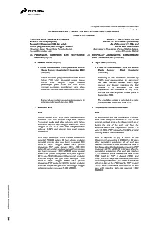 Laporan Tahunan %u2022 Annual Report 866HULU ENERGIThe original consolidated financial statement included hereinare in Indonesian language.PT PERTAMINA HULU ENERGI DAN ENTITAS ANAK/AND SUBSIDIARIESDaftar 5/202 ScheduleCATATAN ATAS LAPORAN KEUANGANKONSOLIDASIAN (lanjutan)Tanggal 31 Desember 2024 dan untukTahun yang Berakhir pada Tanggal Tersebut(Disajikan dalam Ribuan Dolar Amerika Serikat,Kecuali Dinyatakan Lain)NOTES TO THE CONSOLIDATEDFINANCIAL STATEMENT (continued)As of December 31, 2024 andfor the Year Then Ended(Expressed in Thousands of United States Dollars,Unless Otherwise Stated)45. PERJANJIAN, KOMITMEN DAN KONTINJENSIPENTING (lanjutan)45. SIGNIFICANT AGREEMENTS, COMMITMENTSAND CONTINGENCIES (continued)e. Perkara hukum (lanjutan) e. Legal case (continued)ii. Klaim Abandonment Costs pada Blok BaskerManta Gummy (Australia) 2 November 2022(lanjutan)ii. Claim for Abandonment Costs on BaskerManta Gummy Block (Australia)(continued)Sesuai informasi yang disampaikan oleh kuasahukum PHE telah disepakati antara kuasahukum PHE dengan Cooper timelinepersidangan yakni bulan Juli 2025 sudahmemulai persiapan persidangan yang akandijalankan estimasi pada bulan September 2025.According to the information provided byPHE's legal representative, an agreementhas been reached between PHE's legalcounsel and Cooper regarding the trialtimeline. It is anticipated that trialpreparations will commence in July 2025,with the trial itself expected to take place inSeptember 2025.Bahwa tahap mediasi yang akan berlangsung diantara periode Maret dan Juni 2025.The mediation phase is scheduled to takeplace between March and June 2025.f. Komitmen KKS f. Cooperation contract commitmentPEP PEPSesuai dengan KKS, PEP wajib mengembalikanminimum 10% dari wilayah kerja awal kepadaPemerintah pada saat atau sebelum akhir tahunkontrak ke sepuluh sejak tanggal efektif KKS. Padatanggal 18 Juli 2013, PEP telah mengembalikansebesar 18,02% dari wilayah kerja awal kepadaPemerintah.In accordance with the Cooperation Contract,PEP shall relinquish minimum of 10% of theoriginal contract area to the Government on orbefore the end of the tenth year from theeffective date of the Cooperation Contract. OnJuly 18, 2013, PEP relinquished 18.02% of initialworking area to the Government.PEP wajib membayar bonus kepada Pemerintahsejumlah AS$500 dalam 30 hari setelah produksikumulatif minyak dan gas bumi mencapai 500MMBOE sejak tanggal efektif KKS (sudahdibayarkan PEP pada Januari 2011), AS$1.000dalam 30 hari setelah produksi kumulatif minyak dangas bumi mencapai 1.000 MMBOE sejak tanggalefektif KKS (sudah dibayarkan PEP pada Agustus2015), dan AS$1.500 dalam 30 hari setelah produksikumulatif minyak dan gas bumi mencapai 1.500MMBOE sejak tanggal efektif KKS (sudahdibayarkan PEP pada April 2021). Jumlah produksikumulatif minyak dan gas bumi PEP hingga tanggalpelaporan sudah mencapai 1.500 MMBOE.PEP is required to pay a bonus to theGovernment amounting to US$500 in 30 daysafter cumulative production of oil and gasreaches 500MMBOE from the effective date ofthe Cooperation Contract (has been paid by PEPin January 2011), US$1,000 in 30 days after thecumulative production of oil and gas reaches1,000 MMBOE since the effective date of thePSC (paid by PEP in August 2015), andUS$1,500 in 30 days after cumulative productionof oil and gas reaches 1,500 MMBOE since theeffective date of the PSC (paid by PEP in April2021). PEP%u2019s cumulative production of oil andgas until reporting date has reached 1,500MMBOE.