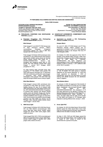 Laporan Tahunan %u2022 Annual Report 870HULU ENERGIThe original consolidated financial statement included hereinare in Indonesian language.PT PERTAMINA HULU ENERGI DAN ENTITAS ANAK/AND SUBSIDIARIESDaftar 5/206 ScheduleCATATAN ATAS LAPORAN KEUANGANKONSOLIDASIAN (lanjutan)Tanggal 31 Desember 2024 dan untukTahun yang Berakhir pada Tanggal Tersebut(Disajikan dalam Ribuan Dolar Amerika Serikat,Kecuali Dinyatakan Lain)NOTES TO THE CONSOLIDATEDFINANCIAL STATEMENT (continued)As of December 31, 2024 andfor the Year Then Ended(Expressed in Thousands of United States Dollars,Unless Otherwise Stated)45. PERJANJIAN, KOMITMEN DAN KONTINJENSIPENTING (lanjutan)45. SIGNIFICANT AGREEMENTS, COMMITMENTS ANDCONTINGENCIES (continued)g. Perjanjian Pengalihan 10% ParticipatingInterest kepada BUMD (lanjutan)g. Agreement to transfer a 10% ParticipatingInterest to BUMD (continued)Blok Kampar Kampar BlockPada tanggal 27 Juni 2023 PT PHE Kampar danPT Riau Petroleum Kampar (%u201cRPK%u201d)menandatangi Perjanjian PengalihanParticipating Interest (PI) 10% di KBH BlokKampar dari PHE Kampar ke RPK.On June 27, 2023, PT PHE Kampar and PT RiauPetroleum Kampar (%u201cRPK%u201d) entered into anagreement to transfer a 10% of PT PHE Kampar%u2019sParticipating Interest in the Kampar PSC from PTPHE Kampar to RPK.Pada tanggal 19 Oktober 2023 persetujuan ataspengalihan PI 10% di Blok Kampar telah disetujuioleh menteri ESDM melalui Surat dari MenteriESDM kepada Kepala SKK Migas No. T852/MG-04/MEM.M/2023. Dimana hak,kewajiban dan tanggung jawab atas PI 10%beralih dari PHE Kampar kepada RPK sejaktanggal 1 Januari 2017 (tanggal efektifpengalihan PI 10%).On October 19, 2023, the approval of the 10% PItransfer at the Kampar Block through a letter fromthe Minister of Energy and Mineral Resources to theHead of SKK Migas No. T-852/MG04/MEM.M/2023. The rights, obligations andresponsibilities of 10% PI were transferred from PHEKampar to RPK on January 1, 2017 (effective dateof the 10% PI transfer).PT PHE Kampar telah mencatat biaya ataspengalihan PI 10% BUMD untuk periode ITD2022 pada laporan keuangan per 31 Desember2023 dan melakukan pembayaran pada tanggal7 Desember 2023 senilai AS$348.504.Sedangkan untuk periode YTD 2023 tidak adabagi hasil dengan BUMD karena nilainya negatif.PHE Kampar has recorded the cost for the transferof 10% PI BUMD ITD 2022 period in financialstatement for the period December 31, 2023 andmade payments on December 7, 2023 ofUS$348,504. As for the YTD 2023 there is no profitsharing with BUMD because the net distributionvalue is negative.Blok West Madura West Madura BlockPada tanggal 5 Januari 2024, persetujuan ataspengalihan PI PHE WMO dan Kodeco masingmasing sebesar 8% dan 1% di wilayah kerjaWMO disampaikan oleh SKK Migas melalui suratNo. SRT-0003/SKKIC0000/2024/S9. PengalihanPI tersebut telah disetujui oleh Menteri ESDMmelalui surat dari Menteri Energi dan SumberDaya Mineral kepada Kepala SKK Migas No. T975/MG.04/MEM.M.2023 tanggal 22 Desember2023. Surat tersebut menyatakan bahwa tanggalperalihan dari PHE WMO dan Kodeco ke PTPetrogas Jatim Adipodai adalah berlaku efektifsejak tanggal 1 Januari 2023On January 5, 2024, the approval of the transfer ofPHE WMO and Kodeco%u2019s PI of 8% and 1% in WMOBlock, respectively, was conveyed through a letterfrom SKK Migas No. SRT0003/SKKIC0000/2024/S9. The sharedown of PIhas been approved by the Minister of Energy andMineral Resources to the Head of SKK Migas No. T975/MG.04/MEM.M.2023 dated Desember 22,2023. The letter states that the date of the transferof PHE WMO and Kodeco to PT Petrogas JatimAdipodai is starting effective from January 1, 2023.h. KBH Gross Split h. Gross Split PSCPada tanggal 18 Oktober 2019, ENI West Ganal,PHI dan SKK MIGAS menandatangani KBHGross Split Blok West Ganal, berlaku efektiftanggal 26 Januari 2020 untuk jangka waktuselama 30 tahun.On October 18, 2019, Eni West Ganal, PHI and SKKMIGAS signed the West Ganal Block Gross SplitPSC for a contract period of 30 years, which becameeffective from the date of January 26, 2020.Pada tanggal 9 Mei 2019, PHR menandatanganiKBH Gross Split Blok Rokan dengan SKK Migas,berlaku efektif tanggal 9 Agustus 2021 untukjangka waktu selama 20 tahun.On May 9, 2019, PHR and SKK Migas signed thePSC Gross Split Rokan Block, with an effective dateof August 9, 2021 acting on behalf of theGovernment for a period of 20 years.