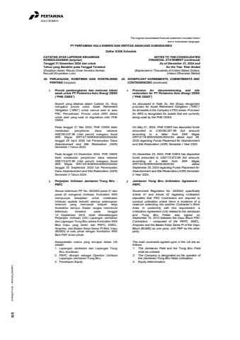 Laporan Tahunan %u2022 Annual Report 872HULU ENERGIThe original consolidated financial statement included hereinare in Indonesian language.PT PERTAMINA HULU ENERGI DAN ENTITAS ANAK/AND SUBSIDIARIESDaftar 5/208 ScheduleCATATAN ATAS LAPORAN KEUANGANKONSOLIDASIAN (lanjutan)Tanggal 31 Desember 2024 dan untukTahun yang Berakhir pada Tanggal Tersebut(Disajikan dalam Ribuan Dolar Amerika Serikat,Kecuali Dinyatakan Lain)NOTES TO THE CONSOLIDATEDFINANCIAL STATEMENT (continued)As of December 31, 2024 andfor the Year Then Ended(Expressed in Thousands of United States Dollars,Unless Otherwise Stated)45. PERJANJIAN, KOMITMEN DAN KONTINJENSIPENTING (lanjutan)45. SIGNIFICANT AGREEMENTS, COMMITMENTS ANDCONTINGENCIES (continued)i. Provisi pembongkaran dan restorasi lokasiasset untuk PT Pertamina Hulu Energi OSES(%u201cPHE OSES%u201d)i. Provision for decommisioning and siterestoration for PT Pertamina Hulu Energi OSES(%u201dPHE OSES%u201d)Seperti yang dibahas dalam Catatan 3o, Grupmengakui provisi untuk Asset RetirementObligation (%u201cARO%u201d) untuk semua aset di areaPSC Perusahaan. Provisi untuk ARO diakuiuntuk aset yang saat ini digunakan oleh PHEOSES.As discussed in Note 3o, the Group recognizesprovision for Asset Retirement Obligation (%u201cARO%u201d)for all assets in the Company%u2019s PSC areas. Provisionfor ARO is recognized for assets that are currentlybeing used by the PHE OSES.Pada tanggal 21 Mei 2024, PHE OSES telahmelakukan penyetoran dana sebesarAS$180.027,96 (nilai penuh) mengacu SuratSKK Migas SRT-0119/SKKIG3000/2024/S4tanggal 29 April 2024 hal Penempatan DanaAbandonment and Site Restoration (ASR)Semester I Tahun 2024.On May 21, 2024, PHE OSES has deposited fundsamounted to US$180,027.96 (full amount)according to a letter from SKK MigasSRT-0119/SKKIG3000/2024/S4 dated April 29,2024 regarding Funds Placement for Abandonmentand Site Restoration (ASR) Semester I Year 2024.Pada tanggal 23 Desember 2024, PHE OSEStelah melakukan penyetoran dana sebesarAS$172.672,89 (nilai penuh) mengacu SuratSKK Migas SRT-0318/SKKIG3000/2024/S4tanggal 20 September 2024 hal PenempatanDana Abandonment and Site Restoration (ASR)Semester II Tahun 2024.On December 23, 2024, PHE OSES has depositedfunds amounted to US$172,672.89 (full amount)according to a letter from SKK MigasSRT-0318/SKKIG3000/2024/S4 datedSeptember 20, 2024 regarding Funds Placement forAbandonment and Site Restoration (ASR) SemesterII Year 2024.j. Perjanjian Unitisasi Jambaran Tiung Biru -PEPCj. Jambaran Tiung Biru Unitization Agreement -PEPCSesuai ketentuan PP No. 35/2004 pasal 41 danpasal 42 mengenai Unitisasi, Kontraktor KKSmempunyai kewajiban untuk melakukanUnitisasi apabila terbukti adanya pelamparanreservoir yang memasuki wilayah kerjaKontraktor lainnya. Dalam rangka memenuhiketentuan tersebut, pada tanggal14 September 2012, telah ditandatanganiPerjanjian Unitisasi (UA) Lapangan Jambarandan Lapangan Tiung Biru antara Kontraktor KKSBlok Cepu yang terdiri dari PEPC, EMCL,Ampolex, dan Badan Kerja Sama PI Blok Cepu(BUMD) di satu pihak dengan Kontraktor KKSBlok PEP di lain pihak.Government Regulation No. 35/2004, specificallyArticle 41 and Article 42 regarding Unitisationstipulates that PSC Contractors are required toconduct unitisation where there is evidence of areservoir extending into another Contractor%u2019s WorkArea. In conformity with this requirement, aUnitisation Agreement (UA) related to the Jambaranand Tiung Biru Fields was signed onSeptember 14, 2012 between the Cepu Block PSCContractors - composed of the PEPC, EMCL,Ampolex and the Badan Kerja Sama PI of the CepuBlock (BUMD) as one party, with PEP as the otherparty.Kesepakatan utama yang tercapai dalam UAadalah:The main covenants agreed upon in the UA are asfollows:1. Lapangan Jambaran dan Lapangan TiungBiru diunitisasi.2. PEPC ditunjuk sebagai Operator UnitisasiLapangan Jambaran-Tiung Biru.3. Penetapan Equity.1. The Jambaran Field and the Tiung Biru Fieldshall be unitized.2. The Company is designated as the operator ofthe Jambaran-Tiung Biru fields Unitisation.3. Equity determination.
