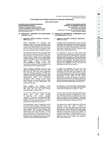 01020304050607 Consolidated Financial Statements Laporan Keaungan Konsolidasian PT Pertamina Hulu Energi 873The original consolidated financial statement included hereinare in Indonesian language.PT PERTAMINA HULU ENERGI DAN ENTITAS ANAK/AND SUBSIDIARIESDaftar 5/209 ScheduleCATATAN ATAS LAPORAN KEUANGANKONSOLIDASIAN (lanjutan)Tanggal 31 Desember 2024 dan untukTahun yang Berakhir pada Tanggal Tersebut(Disajikan dalam Ribuan Dolar Amerika Serikat,Kecuali Dinyatakan Lain)NOTES TO THE CONSOLIDATEDFINANCIAL STATEMENT (continued)As of December 31, 2024 andfor the Year Then Ended(Expressed in Thousands of United States Dollars,Unless Otherwise Stated)45. PERJANJIAN, KOMITMEN DAN KONTINJENSIPENTING (lanjutan)45. SIGNIFICANT AGREEMENTS, COMMITMENTS ANDCONTINGENCIES (continued)j. Perjanjian Unitisasi Jambaran Tiung Biru %u2013PEPC (lanjutan)j. Jambaran Tiung Biru Unitization Agreement %u2013PEPC (continued)Selain kesepakatan UA Lapangan JTB,Kontraktor KKS WK Cepu dan Kontraktor KKSWK PEP masing masing telah menunjuk PEPCsebagai Seller Representative untuk seluruh gasbumi WK Cepu dan gas bumi lapangan TiungBiru yang dituangkan dalam perjanjian terpisah.In addition to the covenants set out in the UA of theJTB Fields, the Cepu Block PSC Contractors and thePEP Block PSC Contractor have each designatedthe PEPC as the Seller%u2019s Representative for all of theCepu Block natural gas and the Tiung Biru fieldnatural gas in separate agreements.Pada tanggal 9 November 2012, Kontraktor KKSBlok Cepu dan Kontraktor KBH Blok PEP telahmenyampaikan surat permohonan persetujuankepada Menteri ESDM untuk melaksanakanUnitisasi Lapangan JTB dan Penentuan PEPCsebagai Operator Unitisasi melalui SKK Migas.SKK Migas melalui surat No.151/13/MEM/M/2013 tanggal 31 Maret 2013menyetujui pelaksanaan unitisasi lapangan JTBdan penentuan PEPC sebagai Operator.On November 9, 2012, the Cepu Block PSCContractors and the PEP Block Contractor submitteda letter of request through SKK Migas to secure theESDM Minister%u2019s approval to conduct the JTB FieldsUnitisation and the designation of the PEPC as theOperator of the Unitisation. SKK Migas through itsletter No.151/13/MEM/M/2013 dated June 30, 2013approved the unitisation of the JTB field andappointed the PEPC as the Operator.Selain Unitization Agreement (UA) dan UnitOperating Agreement (UOA), Kontraktor KKSBlok Cepu dan KKS Blok PEP menyepakatiCepu Gas Marketing Agreement (CGMA) yangmengatur pemasaran bersama atas gas bumiCepu dan akan menunjuk PEPC sebagai sellerrepresentative. EMCL akan mendukungpenunjukan PEPC sebagai penjual bagianPemerintah dari hasil produksi gas bumi BlokCepu. CGMA ini akan dilaksanakan olehKontraktor KKS Cepu.In addition to Unitization Unit (UA) and UnitOperation Agreement (UOA), Block Cepu KKSContractors and PEP Block PSC agreed to CepuGas Marketing Agreement (CGMA) which regulatesfor the joint marketing of Cepu natural gas and theappointment of the PEPC as the Seller%u2019sRepresentative. EMCL also agreed to support theappointment of the PEPC as the Seller of the State%u2019sshare of Cepu Block natural gas. The CGMA will beexecuted by the Contractor under the Cepu PSC.Pada tanggal 13 Februari 2013,Plan of Development (POD) sudah disetujui olehSKK Migas dan revisi atas POD tersebutdisetujui tanggal 17 Agustus 2015.On February 13, 2013, the Plan of Development(POD) was approved by SKK Migas and the revisionof the POD was approved on August 17, 2015.UA, UOA dan CGMA telah disetujui oleh parapartner Blok Cepu pada tanggal14 September 2012. Unitisasi LapanganJambaran - Tiung Biru dan penetapan PEPCsebagai Operator Unit Lapangan JTB telahdisetujui oleh Kementerian Energi dan SumberDaya Mineral tanggal 28 Februari 2013.The UA, UOA and CGMA have been approved bythe Cepu Block partners on September 14, 2012.The JTB Fields Unitisation and determination of thePEPC as operator of the Jambaran - Tiung BiruFields have been approved by the Ministry of Energyand Mineral Resources on February 28, 2013.Penandatanganan Head Of Agreement (HOA)gas JTB di Jakarta tanggal 18 Desember 2015,yaitu persetujuan penjualan gas yang diproduksidari Lapangan Unitisasi JTB (proyek gas JTB)antara PEPC dan pemegang ParticipatingInterest Blok Cepu antara lain EMCL, PT AsriDharma Sejahtera, PT Blora Patragas Hulu, PTPetrogas Jatim Utama Cendana dan PT SaranaPatra Hulu Cepu sebagai pihak penjual denganPertamina yang bertindak sebagai pembeli.The signing of the Head Of Agreement (HOA) gasJambaran Tiung Biru (JTB) in Jakarta onDecember 18, 2015, which approved the sale of gasproduced from JTB Untization Fields (gas projectJTB) between PEPC and holders of participatinginterests of Cepu Block amoung other EMCL, PTAsri Dharma Sejahtera, PT Blora Patragas Hulu, PTPetrogas Jatim Utama Cendana and PT SaranaPatra Hulu Cepu as the sellers with Pertamina,which acts as the buyer.