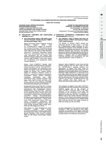 01020304050607 Consolidated Financial Statements Laporan Keaungan Konsolidasian PT Pertamina Hulu Energi 875The original consolidated financial statement included hereinare in Indonesian language.PT PERTAMINA HULU ENERGI DAN ENTITAS ANAK/AND SUBSIDIARIESDaftar 5/211 ScheduleCATATAN ATAS LAPORAN KEUANGANKONSOLIDASIAN (lanjutan)Tanggal 31 Desember 2024 dan untukTahun yang Berakhir pada Tanggal Tersebut(Disajikan dalam Ribuan Dolar Amerika Serikat,Kecuali Dinyatakan Lain)NOTES TO THE CONSOLIDATEDFINANCIAL STATEMENT (continued)As of December 31, 2024 andfor the Year Then Ended(Expressed in Thousands of United States Dollars,Unless Otherwise Stated)45. PERJANJIAN, KOMITMEN DAN KONTINJENSIPENTING (lanjutan)45. SIGNIFICANT AGREEMENTS, COMMITMENTS ANDCONTINGENCIES (continued)k. Tarif Pemanfaatan Kilang LNG Badak untukKontrak Penjualan Western Buyers (%u201cWBX%u201d)dan Nusantara Regas (%u201cNR%u201d)k. The Utilization Tariff of Badak LNG Plant forWestern Buyers (%u201cWBX%u201d) and Nusantara Regas(%u201cNR%u201d) Sales ContractsMenteri Keuangan melalui Direktorat JenderalKekayaan Negara, dalam suratNo. S-355/MK.6/2017 tanggal 29 Desember2017 tentang Persetujuan Pemanfaatan BarangMilik Negara Berupa Aktiva Kilang LNG Badakuntuk Gas Bumi dari Wilayah Kerja MahakamPasca-2017, memberikan persetujuan kepadaPHM untuk memanfaatkan kilang LNG Badakuntuk pemrosesan gas dari wilayah kerjaMahakam dengan membayar tarif pemanfaatansebesar AS$0,22/MMBTU, diluar biaya operasidan pemeliharaan serta pengeluaran kapital(%u201cSurat S-355/2017%u201d).The Minister of Finance (%u201cMoF%u201d) through theDirectorate General of State Assets, in its letterNo. S-355/MK.6/2017 dated December 29, 2017regarding the Approval of the Utilization of Stateowned Assets of Badak LNG Plant for the Gas fromMahakam Working Area Post-2017, has grantedapproval to PHM for utilizing the Badak LNG plant toprocess the gas from the Mahakam working area bypaying a utilization tariff of US$0.22/MMBTU,excluding operating and maintenance cost andcapital expenditures (%u201cLetter S-355/2017%u201d).Namun, Surat S-355/2017 tersebut tidaksejalan dengan persetujuan Menteri Keuangansebelumnya dalam surat No. S-651/MK.6/2011tentang Pemanfaatan dan Optimalisasi AsetKilang LNG Badak untuk Gas WK Mahakamtanggal 20 Oktober 2011 kepada DirekturUtama PT Pertamina (Persero) (%u201cSurat S651/2011%u201d), yang butir 3.a dalam surat tersebutmenyatakan bahwa Menteri Keuanganmenyetujui pemanfaatan aset tanpapembebanan sewa terhadap kontraktor KBHyang masih terikat kontrak penjualan LNG(VICO, Total EP, dan Chevron), mengingatkontrak penjualan gas telah ditandatangani olehPemerintah dan produsen gas di masa lalu.However, Letter S-355/2017 is not in-line with theprevious approval from the MoF under its letterNo. S-651/MK.6/2011 regarding Utilization andOptimization of Badak LNG Plant Asset forMahakam working area gas dated October 20, 2011addressed to the President Director of PT Pertamina(Persero) (\such letter stated that the MoF agrees that rentalcharges shall not be applied to the PSC contractors,who are still bound by LNG sales contracts (VICO,Total EP, and Chevron), considering that the LNGsales contracts have been signed by theGovernment and the gas producers in the past.Pengecualian dalam Surat S-651/2011 tersebutdiberikan kepada kontraktor KBH yang kontrakpenjualannya telah ditandatangani sebelumdikeluarkannya Surat S-651/2011 (termasukkontrak penjualan WBX dan NR). Pada saatsurat tersebut dikeluarkan, Pemerintah belummenetapkan kontraktor wilayah kerja Mahakampasca-2017. Dengan mempertimbangkanpenetapan kontrak wilayah kerja Mahakam saatini yang berlaku efektif sejak 1 Januari 2018,maka PHM berpendapat bahwa PHM jugaberhak mendapatkan pembebasan tarifpemanfaatan karena melanjutkan suplai LNGuntuk kontrak penjualan WBX (hingga tahun2020) dan NR (hingga tahun 2022).The exemption as stated in the Letter S-651/2011was granted to the PSC contractors who have salescontracts signed prior to the issuance ofLetter S-651/2011 (including WBX & NR salescontracts). At the issuance of such letter, theGovernment had not decided the contractor ofMahakam working area post-2017. Considering theeffective date of the current Mahakam PSC fromJanuary 1, 2018, PHM is of the opinion that PHM isalso entitled to the exemption of the utilization tariffsPHM continues with the LNG supply contracts forWBX (until 2020) and NR (until 2022).Oleh karena itu, sejak dikeluarkannya SuratS-355/2017 tersebut, PHM, denganpersetujuan SKK Migas, meminta pengecualiantarif pemanfaatan kilang LNG Badak kepadaMenteri Keuangan untuk kontrak penjualanWBX dan NR dengan pertimbangan sebagaiberikut:As such, subsequent to the issuance of the LetterS-355/2017, PHM, with approval of SKK Migas,requested an exemption of the Badak LNG plantutilization tariff from the MoF for WBX and NR salescontracts based on the following considerations: