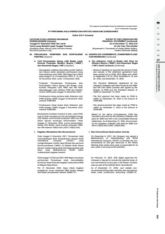 01020304050607 Consolidated Financial Statements Laporan Keaungan Konsolidasian PT Pertamina Hulu Energi 881The original consolidated financial statement included hereinare in Indonesian language.PT PERTAMINA HULU ENERGI DAN ENTITAS ANAK/AND SUBSIDIARIESDaftar 5/217 ScheduleCATATAN ATAS LAPORAN KEUANGANKONSOLIDASIAN (lanjutan)Tanggal 31 Desember 2024 dan untukTahun yang Berakhir pada Tanggal Tersebut(Disajikan dalam Ribuan Dolar Amerika Serikat,Kecuali Dinyatakan Lain)NOTES TO THE CONSOLIDATEDFINANCIAL STATEMENT (continued)As of December 31, 2024 andfor the Year Then Ended(Expressed in Thousands of United States Dollars,Unless Otherwise Stated)45. PERJANJIAN, KOMITMEN DAN KONTINJENSIPENTING (lanjutan)45. SIGNIFICANT AGREEMENTS, COMMITMENTS ANDCONTINGENCIES (continued)k. Tarif Pemanfaatan Kilang LNG Badak untukKontrak Penjualan Western Buyers (%u201cWBX%u201d)dan Nusantara Regas (%u201cNR%u201d) (lanjutan)k. The Utilization Tariff of Badak LNG Plant forWestern Buyers (%u201cWBX%u201d) and Nusantara Regas(%u201cNR%u201d) Sales Contracts (continued)- Serangkaian meeting rekonsiliasi jumlah tagihandan klausul dalam perjanjian pembayaran yangtelah dilakukan oleh PHM, SKK Migas dan LMANpada tanggal 7-8, 23 September 2022, 8, 15, dan30 November 2022, serta 13 Desember 2022.- Perjanjian Penyelesaian Pembayaran atasPemanfaatan Aktiva Kilang LNG Badak untukKontrak Penjualan LNG WBX dan NR telahditandatangani oleh Direktur PHM dan DirekturUtama LMAN pada tanggal 15 Desember 2022.- Pembayaran tahap pertama telah dilakukan olehPHM kepada LMAN tanggal 23 Desember 2022sebesar AS$9.869.- Pembayaran tahap kedua telah dilakukan olehPHM kepada LMAN tanggal 2 November 2023sebesar AS$9.869.- Series of meetings to reconcile the amount of billsand clauses in the setlement agreement havebeen carried out by PHM, SKK Migas and LMANon September 7-8, 23, 2022, November 8, 15, and30, 2022, and December 13, 2022.- The Payment Settlement Agreement for theUtilization of Badak LNG Plant Assets for the WBXand NR LNG Sales Contract was signed by theDirector of PHM and the President Director ofLMAN on December 15, 2022.- The first payment has been made by PHM toLMAN on December 23, 2022 in the amount ofUS$9,869,- The second payment has been made by PHM toLMAN on November 2, 2023 in the amount ofUS$9,869.Berdasarkan keadaan tersebut di atas, maka PHMsaat ini telah mengakui provisi pemanfaatan kilangLNG Badak untuk kontrak penjualan WBX dan NRdalam laporan keuangan terkonsolidasi. Padatanggal 31 Desember 2024, provisi pemanfaatankilang LNG Badak untuk kontrak penjualan WBXdan NR sebesar AS$22.503 (2023: AS$22.503)Based on the above circumstances, PHM hasrecorded a provision for the utilization of Badak LNGplant for WBX and NR in the consolidated financialstatements. As of December 31, 2024, the provisionfor the utilization of Badak LNG plant for WBX andNR is US$22,503 (2023: US$22,503)l. Kegiatan Hidrokarbon Non-Konvensional l. Non-Conventional Hydrocarbon ActivityPada tanggal 6 Desember 2021, Perusahaan telahmenandatangani Nota Kesepahaman dengan EOGIInternational Company (%u201cEOGI%u201d) untukmengembangkan sumber daya Minyak dan gas bumiNon-Konvensional (%u201cMNK%u201d) di Wilayah Kerja Rokandimana masing-masing pihak bertanggung jawab atasbiaya yang dikeluarkannya sendiri dalammelaksanakan kegiatan tersebut.On December 6, 2021, the Company has signed aMemorandum of Understanding with EOGIInternational Company (%u201cEOGI%u201d) to develop the nonconventional oil and gas resources in the RokanWorking Area where each party is responsible for itsown costs in carrying out the activities.Pada tanggal 14 Februari 2022, SKK Migas menyetujuipermohonan Perusahaan untuk memanfaatkanKomitmen Kerja Pasti atas kegiatan studi potensi MNKdi Wilayah Kerja Rokan.On February 14, 2022, SKK Migas approved theCompany%u2019s request to include the potential study ofnon-conventional oil and gas in the Rokan ContractArea as part of the Definite Work Commitment.Per 31 Desember 2024, biaya terkait kegiatanpengeboran sumur eksplorasi MNK dicatat sebagaiaset dalam penyelesaian sebesar AS$69.731.As of December 31, 2024, cost related nonconventional drilling wells%u2019 activities was recorded asasset under construction amounting US$69,731.