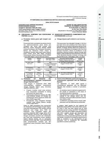 01020304050607 Consolidated Financial Statements Laporan Keaungan Konsolidasian PT Pertamina Hulu Energi 883The original consolidated financial statement included hereinare in Indonesian language.PT PERTAMINA HULU ENERGI DAN ENTITAS ANAK/AND SUBSIDIARIESDaftar 5/219 ScheduleCATATAN ATAS LAPORAN KEUANGANKONSOLIDASIAN (lanjutan)Tanggal 31 Desember 2024 dan untukTahun yang Berakhir pada Tanggal Tersebut(Disajikan dalam Ribuan Dolar Amerika Serikat,Kecuali Dinyatakan Lain)NOTES TO THE CONSOLIDATEDFINANCIAL STATEMENT (continued)As of December 31, 2024 andfor the Year Then Ended(Expressed in Thousands of United States Dollars,Unless Otherwise Stated)45. PERJANJIAN, KOMITMEN DAN KONTINJENSIPENTING (lanjutan)45. SIGNIFICANT AGREEMENTS, COMMITMENTS ANDCONTINGENCIES (continued)p. Perubahan skema gross split menjadi costrecoveryp. Change of gross split scheme to cost recoveryPemerintah telah menetapkan perubahan bentukdan ketentuan-ketentuan pokok (terms andcondition) dari Gross Split menjadi CostRecovery melalui Keputusan Menteri ESDMtentang Persetujuan dan Penetapan PerubahanBentuk dan Ketentuan Pokok (Terms &Conditions) Kontrak Kerja Sama pada WilayahKerja melalui Surat SKK Migas mengenaiPenyampaian Salinan Keputusan Menteri ESDM(%u201cSurat SKK Migas%u201d) sesuai informasi berikut:The government has stipulated changes in the formand main terms and conditions from Gross Split toCost Recovery according to Ministerial Decree of theMinister of Energy Mineral Resources pertaining toApproval and Stipulation of Changes to the Form andPrincipal Provisions (Terms & Conditions) of theProduction Sharing Contract in Blocks through SKKMigas%u2019s Letter pertaining to the Submission of a Copyof the Minsiterial Decree of Minister of Energy andMineral Resources (%u201cSKK Migas Letter%u201d) as beloEntitas/EntitiesWilayahKerja/BlockSurat SKK Migas/SKK Migas%u2019 LetterKeputusan Menteri ESDM/Ministerial Decree of the Ministerof Energy Mineral ResourcesTanggalEfektif/Effective DatePT PHE TubanEast JavaTuban SRT0417/SKKIA0000/2024/S1 tanggal 17 Oktober2024No: 250.K/MG.01/MEM.M/2024tanggal 4 Oktober 20241 Januari/January 1,2025PT PertaminaHulu KalimantanTimurEastKalimantan &AttakaSRT0416/SKKIA0000/2024/S1 tanggal 17 Oktober2024No: 251.K/MG.01/MEM.M/2024tanggal 4 Oktober 20241 Januari/January 1,2025PT PertaminaHulu EnergiOffshore NorthWest JavaOffshoreNorth WestJavaSRT0415/SKKIA0000/2024/S1 tanggal 17 Oktober2024No: 253.K/MG.01/MEM.M/2024tanggal 4 Oktober 20241 Januari/January 1,2025q. Pemberian izin Etekamba danpenandatanganan perjanjian komprehensifdengan Republik Gabonq. Award of the Etekamba permit and signing of acomprehensive agreement with the GaboneseRepublicPada tanggal 17 September 2024, M&Pmenandatangani perjanjian komprehensifdengan Republik Gabon yang mencakupsejumlah ketentuan, yaitu:On September 17, 2024, M&P signed acomprehensive agreement with the GaboneseRepublic that includes a number of provisions,namely: Program investasi sosial yang ambisiusbagi masyarakat Lambar%u00e9n%u00e9 di bidangperumahan dan akses listrik. Penyesuaian ketentuan tertentu dari KBHyang berkaitan dengan izin Ezanga danperpanjangan lisensi eksplorasi terkait daritahun 2026 hingga 2029. Penyelesaian yang mengakhiri berbagaimasalah yang sedang dibahas denganotoritas pajak Gabon.An ambitious social investment programme forthe people of Lambar%u00e9n%u00e9 in the areas ofhousing and access to electricity.The adjustment of certain terms of the PSCrelating to the Ezanga permit and theextension of the associated exploration licencefrom 2026 to 2029.A settlement concluding various issues underdiscussion with the Gabonese tax authorities.Selain itu, M&P mengajukan dan memperolehizin Etekamba (EF-9) di bagian tengah negara,yang telah ditandatangani PSC dengan periodeeksplorasi awal hingga tahun 2029. IzinEtekamba, yang merupakan bagian dariportofolio eksplorasi M&P hingga tahun 2013,berisi beberapa penemuan dan prospek gas.Dengan permintaan domestik dan infrastrukturgas yang telah berkembang secara signifikanselama dekade terakhir, izin ini merupakanpeluang menarik bagi M&P untuk berkontribusipada pengembangan produksi gas danmemperluas akses penduduk Gabon terhadaplistrik.In addition, M&P applied for and obtained theEtekamba permit (EF-9) in the centre of the country,for which a PSC has been signed with an initialexploration period running until 2029. The Etekambapermit, which was part of M&P's exploration portfoliountil 2013, contains several gas discoveries andprospects. With domestic demand and gasinfrastructure having expanded significantly over thelast decade, this permit is an attractive opportunity forM&P to contribute to the development of gasproduction and to broadening the Gabonesepopulation%u2019s access to electricity.