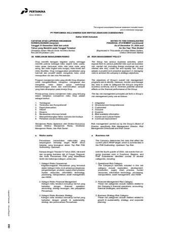 Laporan Tahunan %u2022 Annual Report 890HULU ENERGIThe original consolidated financial statement included hereinare in Indonesian language.PT PERTAMINA HULU ENERGI DAN ENTITAS ANAK/AND SUBSIDIARIESDaftar 5/226 ScheduleCATATAN ATAS LAPORAN KEUANGANKONSOLIDASIAN (lanjutan)Tanggal 31 Desember 2024 dan untukTahun yang Berakhir pada Tanggal Tersebut(Disajikan dalam Ribuan Dolar Amerika Serikat,Kecuali Dinyatakan Lain)NOTES TO THE CONSOLIDATEDFINANCIAL STATEMENT (continued)As of December 31, 2024 andfor the Year Then Ended(Expressed in Thousands of United States Dollars,Unless Otherwise Stated)49. KEBIJAKAN MANAJEMEN RISIKO 49. RISK MANAGEMENT POLICYGrup memiliki beragam kegiatan usaha, sehinggamemiliki potensi berbagai risiko seperti risiko usaha,risiko pasar (termasuk risiko nilai tukar mata uangasing, dan risiko tingkat suku bunga), risiko kredit danrisiko likuiditas. Grup menggunakan pendekatan yanghati-hati dan proaktif dalam mengelola risiko untukmewujudkan visi dan misi Perusahaan.Program manajemen risiko yang dimiliki Grup ditujukanuntuk mengidentifikasi, mengukur, mengawasi danmengelola risiko dalam upaya melindungikesinambungan bisnis dan meminimalkan dampakyang tidak diharapkan pada kinerja Grup.Prinsip-prinsip utama manajemen risiko yang tertuangdalam kebijakan manajemen risiko Grup adalahsebagai berikut:1. Terintegrasi2. Terstruktur dan Komprehensif3. Dapat disesuaikan4. Inklusif5. Dinamis6. Berdasarkan informasi terbaik7. Mempertimbangkan faktor manusia dan budaya8. Perbaikan secara berkelanjutanManajemen Risiko dijalankan oleh Direksi khususnyamelalui Direktur Manajemen Risiko, DirektoratManajemen Risiko, dan Risk Owner.The Group has various business activities, whichexpose them to various potential risks such as businessrisk, market risk (including foreign exchange risk andinterest rate risk), credit risk and liquidity risk. Groupadopts a prudent and proactive approach in managingrisks to achieve the company%u2019s strategic objectives.The objectives of Group%u2019s overall risk managementprograms are to identify, measure, monitor and managekey risks in order to safeguard the Group's long-termbusiness continuity and to minimise potential adverseeffects on the financial performance of the Group.The key risk management principles set forth in Group%u2019srisk management policy are as follows:1. Integrated2. Structured and Comprehensive3. Customized4. Inclusive5. Dynamic6. Best available information7. Human and Cultural Factor8. Continual ImprovementRisk management carried out by the Group%u2019s Board ofDirector, specifically Risk Management Director, RiskManagement Directorate and Risk Owner.a. Risiko usaha a. Business riskPerusahaan menentukan risiko-risiko yangberpengaruh terhadap target RKAP tahunberjalan, yang terangkum dalam Top Risk PHESubholding- Upstream.Sampai dengan Triwulan IV Tahun 2024, risk eventdari on-going business risk di Fungsi, Regional,dan Anak Perusahaan PHE yang diidentifikasiterdiri dari beberapa kategori, antara lain:1. Kategori Risiko OperasionalKegiatan-kegiatan Perusahaan yang termasukdalam kategori risiko ini di antaranya eksplorasi,pengembangan, produksi, supply chain process,human resources, information technology,processing, transportation, asset management,dan HSSE.2. Kategori Risiko Financial ManagementKategori risiko tersebut mencakup hal-hal yangberkaitan dengan financial operation,accounting, strategi keuangan, dan perpajakanPerusahaan.3. Kategori Risiko Business StrategyKategori risiko tersebut mencakup hal-hal yangberkaitan dengan growth & sustainability,strategi, dan perencanaan Perusahaan.The Company determines the risks that affect thecurrent year's RKAP target, which is summarized inthe PHE Subholding- Upstream Top Risk.Until the fourth quarter of 2024, risk events from ongoing business risks in Functions, Regions, andPHE Subsidiaries identified consist of severalcategories, including:1. Operational Risk CategoryThe Company's activities included in this riskcategory include exploration, development,production, supply chain process, humanresources, information technology, processing,transportation, asset management, and HSSE.2. Financial Management Risk CategoryThese risk categories include matters related tothe Company's financial operations, accounting,financial strategies, and taxation.3. Business Strategy Risk CategoryThese risk categories include matters related togrowth & sustainability, strategy, and corporateplanning.