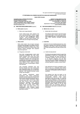 01020304050607 Consolidated Financial Statements Laporan Keaungan Konsolidasian PT Pertamina Hulu Energi 893The original consolidated financial statement included hereinare in Indonesian language.PT PERTAMINA HULU ENERGI DAN ENTITAS ANAK/AND SUBSIDIARIESDaftar 5/229 ScheduleCATATAN ATAS LAPORAN KEUANGANKONSOLIDASIAN (lanjutan)Tanggal 31 Desember 2024 dan untukTahun yang Berakhir pada Tanggal Tersebut(Disajikan dalam Ribuan Dolar Amerika Serikat,Kecuali Dinyatakan Lain)NOTES TO THE CONSOLIDATEDFINANCIAL STATEMENT (continued)As of December 31, 2024 andfor the Year Then Ended(Expressed in Thousands of United States Dollars,Unless Otherwise Stated)49. KEBIJAKAN MANAJEMEN RISIKO (lanjutan) 49. RISK MANAGEMENT POLICY (continued)b. Risiko pasar (lanjutan) b. Market risk (continued)ii. Risiko suku bunga (lanjutan) ii. Interest rate risk (continued)Acuan tingkat bunga untuk pinjaman daribank yang ditandatangani sebelum tanggal31 Mei 2022 masih menggunakan LIBOR.Pinjaman yang ditandatangani setelahtanggal 31 Mei 2022 sudah memakai TermSOFR (Secured Overnight Financing Rate).The reference interest rate for loans from bankssigned before May 31, 2022 is still using LIBOR.Loans signed after May 31, 2022 already use theTerm SOFR (Secured Overnight FinancingRate).c. Risiko kredit c. Credit RiskRisiko kredit adalah risiko kerugian keuanganyang timbul jika pelanggan Grup gagal memenuhikewajiban kontraktualnya kepada Grup. Risikokredit terutama berasal dari piutang usaha yangdiberikan kepada pelanggan atas penjualanminyak dan gas bumi.Credit risk is the risk of suffering financial loss, whenthe Group%u2019s customers fail to fulfil their contractualobligations to the Group. Credit risk arises mainlyfrom trade receivables from the sale of crude oil andgas.(ii) Pengukuran risiko kredit (i) Credit risk measurementGrup telah mengembangkan model untukmendukung kuantifikasi dari risiko kredit.Dalam mengukur risiko kredit untuk kredityang diberikan, Grup mempertimbangkan%u201cProbability of Default%u201d (%u201cPD%u2019%u2019) pelanggan ataskewajiban dan kemungkinan rasio pemulihanatas kewajiban yang telah wanprestasi (%u201cLossGiven Default%u201d) (%u201cLGD%u2019%u2019). Model ini ditelaahsecara rutin untuk membandingkan denganhasil aktualnya.The Group has developed models to support thequantification of credit risk. In measuring creditrisk of a receivable, the Group considers the%u201cProbability of Default%u201d (%u201cPD%u201d) by the customerson its payment obligations and the likelyrecovery ratio on the defaulted obligations (the%u201cLoss Given Default%u201d) (%u201cLGD%u201d). The models arereviewed regularly to compare to actual results.LGD merupakan ekspektasi Grup atasbesarnya kerugian dari suatu piutang padasaat wanprestasi terjadi. Hal ini dinyatakandalam persentase kerugian per unit dari suatueksposur. LGD biasanya bervariasi sesuaidengan tipe pelanggan.LGD represents the Group%u2019s expectation of theextent of loss on a receivable should defaultoccur. It is expressed as percentage loss per unitof exposure. LGD typically varies by the type ofcustomers.Tarif kerugian ekspektasian adalahberdasarkan profil historis pembayaranpenjualan masing-masing dan kerugian kredithistoris terkait yang dialami dalam periode ini.Tarif historis kerugian disesuaikan denganinformasi pada saat ini dan di masa depanatas faktor ekonomi yang mempengaruhikemampuan pelanggan untuk melunasipiutangnya. Grup telah mengidentifikasitingkat Produk Domestik Bruto (%u201cPDB%u201d)sebagai faktor yang paling relevan danmenyesuaikan tarif kerugian historisberdasarkan perubahan yang diekspektasipada faktor tersebut.The expected loss rates are based on thehistorical payment profiles of sales and thecorresponding historical credit lossesexperienced within this period. The historicalloss rates are adjusted to reflect current andforward-looking information on economic factorsaffecting the ability of the customers to settle thereceivables. The Group has identified the GrossDomestic Product (%u201cGDP%u201d) to be the mostrelevant factor and accordingly adjusts thehistorical loss rates based on expected changesin this factor.