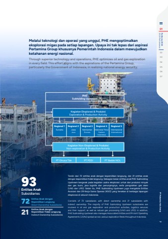 PHE Subholding UpstreamKegiatan Eksplorasi & ProduksiExploration & Production ActivityRegional 1 Regional 2 Regional 3 Regional 4 Regional 5Sumatra JawaJavaKalimantanBorneoIndonesia TimurEastern IndonesiaInternasionalInternationalKegiatan Non-Eksplorasi & ProduksiNon-exploration & Production ActivityPT Elnusa Tbk PT PDSI PT Badak NGLTerdiri dari 72 entitas anak dengan kepemilikan langsung, dan 21 entitas anak dengan kepemilikan tidak langsung. Sebagian besar entitas anak PHE Subholding Upstream bergerak pada kegiatan usaha eksplorasi untuk dan produksi minyak dan gas bumi, jasa logistik dan penunjangnya, serta pengolahan gas alam (LNG dan LPG). Selain itu, PHE Subholding Upstream juga mengelola Entitas Asosiasi dan 29 Kerja Sama Operasi (KSO) yang tersebar di berbagai lapangan eksplorasi di seluruh Indonesia.Consists of 72 subsidiaries with direct ownership and 21 subsidiaries with indirect ownership. The majority of PHE Subholding Upstream subsidiaries are involved in oil and gas exploration and production activities, logistics services and their support, as well as natural gas processing (LNG and LPG). In addition, PHE Subholding Upstream also manages Associated Entities and 29 Joint Operating Agreements (JOAs) spread across various exploration fields throughout Indonesia.93Entitas AnakSubsidiaries72 Entitas Anak dengan Kepemilikan LangsungDirect Ownership Subsidiaries21 Entitas Anak dengan Kepemilikan Tidak LangsungIndirect Ownership SubsidiariesMelalui teknologi dan operasi yang unggul, PHE mengoptimalkan eksplorasi migas pada setiap lapangan. Upaya ini tak lepas dari aspirasi Pertamina Group khususnya Pemerintah Indonesia dalam mewujudkan ketahanan energi nasional.Through superior technology and operations, PHE optimizes oil and gas exploration in every field. This effort aligns with the aspirations of the Pertamina Group, particularly the Government of Indonesia, in realizing national energy security.01020304050607Laporan Tahunan %u2022 Annual Report 6PT Pertamina Hulu Energi 7 01 2024 Performance Performa 2024020304050607 PT Pertamina Hulu Energi 7