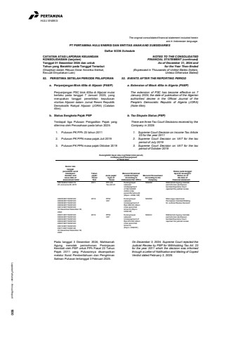 Laporan Tahunan %u2022 Annual Report 900HULU ENERGIThe original consolidated financial statement included hereinare in Indonesian language.PT PERTAMINA HULU ENERGI DAN ENTITAS ANAK/AND SUBSIDIARIESDaftar 5/236 ScheduleCATATAN ATAS LAPORAN KEUANGANKONSOLIDASIAN (lanjutan)Tanggal 31 Desember 2024 dan untukTahun yang Berakhir pada Tanggal Tersebut(Disajikan dalam Ribuan Dolar Amerika Serikat,Kecuali Dinyatakan Lain)NOTES TO THE CONSOLIDATEDFINANCIAL STATEMENT (continued)As of December 31, 2024 andfor the Year Then Ended(Expressed in Thousands of United States Dollars,Unless Otherwise Stated)52. PERISTIWA SETELAH PERIODE PELAPORAN 52. EVENTS AFTER THE REPORTING PERIODa. Perpanjangan Blok 405a di Aljazair (PAEP) a. Extension of Block 405a in Algeria (PAEP)Perpanjangan PSC blok 405a di Aljazair mulaiberlaku pada tanggal 7 Januari 2025, yangmerupakan tanggal penerbitan keputusanotoritas Aljazair dalam Jurnal Resmi RepublikDemokratik Rakyat Aljazair (JORA) (Catatan45m).The extension of PSC has become effective on 7January 2025, the date of publication of the Algerianauthorities' decree in the Official Journal of thePeople's Democratic Republic of Algeria (JORA)(Note 45m).b. Status Sengketa Pajak PEP b. Tax Dispute Status (PEP)Terdapat tiga Putusan Pengadilan Pajak yangditerima oleh Perusahaan pada tahun 2025:1. Putusan PK PPh 23 tahun 20112. Putusan PK PPN masa pajak Juli 20193. Putusan PK PPN masa pajak Oktober 2019There are three Tax Court Decisions received by theCompany in 2025:1. Supreme Court Decision on Income Tax Article23 for the year 20112. Supreme Court Decision on VAT for the taxperiod of July 20193. Supreme Court Decision on VAT for the taxperiod of October 2019Kurang/lebih bayar atau rugi fiskal (nilai penuh) Underpayment/Overpayment or fiscal loss ______Nomor dantanggalpenerbitan suratketetapan/Number andissue date ofassessment letterTahunpajak/FiscalYearJenis pajak/Type ofTaxesMenurut DirektoratJenderal Pajak/According toIndonesianTax OfficeMenurut Perusahaan/According to theCompanyStatus pada tanggallaporan keuangan/Status as ofthe date offinancial statement00018/203/11/081/1526 Juni/June 26, 20152011 PPh 23/Tax Art.23Kurang bayarsebesar/Underpaymentof Rp140,606million (nilaipenuh/full amount)(Equiv. US$9,136)Nihil/Nil Mahkamah Agung menolakpermohonan peninjauankembali/Supreme Courtrejected the judicial review00005/287/19/081/2000006/287/19/081/2000008/287/19/081/2000009/287/19/081/2000012/287/19/081/2030 Desember/December 30,20202019 PPN/VATKurang bayarsebesar/Underpayment ofRp2,308.36 million(nilai penuh/fullamount) (Equiv.US$148)Nihil/Nil Menunggu keputusanPeninjauan Kembali/Waitingfor Judicial Review Decision00001/287/19/081/2000002/287/19/081/2000003/287/19/081/2000004/287/19/081/2000007/287/19/081/2000010/287/19/081/2000011/287/19/081/2030 Desember/December 30,20202019 PPN/VATKurang bayarsebesar/Underpayment ofRp2,610,68 million(nilai penuh/fullamount)(Equiv. US$167)Nihil/nil Mahkamah Agung menolakpermohonan peninjauankembali/Supreme Courtrejected the judicial reviewPada tanggal 3 Desember 2024, MahkamahAgung menolak permohonan PeninjauanKembali oleh PEP untuk PPh Pasal 23 TahunPajak 2011 yang Putusannya disampaikanmelalui Surat Pemberitahuan dan PengirimanSalinan Putusan tertanggal 3 Februari 2025.On December 3, 2024, Supreme Court rejected theJudicial Review by PEP for Withholding Tax Art. 23for the year 2011 which the decision was informedthrough a Letter of Notification and Mailing of CopiedVerdict dated February 3, 2025.
