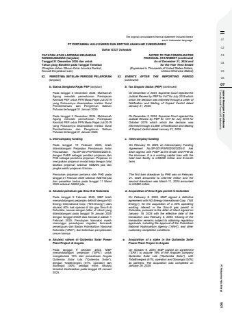 01020304050607 Consolidated Financial Statements Laporan Keaungan Konsolidasian PT Pertamina Hulu Energi 901The original consolidated financial statement included hereinare in Indonesian language.PT PERTAMINA HULU ENERGI DAN ENTITAS ANAK/AND SUBSIDIARIESDaftar 5/237 ScheduleCATATAN ATAS LAPORAN KEUANGANKONSOLIDASIAN (lanjutan)Tanggal 31 Desember 2024 dan untukTahun yang Berakhir pada Tanggal Tersebut(Disajikan dalam Ribuan Dolar Amerika Serikat,Kecuali Dinyatakan Lain)NOTES TO THE CONSOLIDATEDFINANCIAL STATEMENT (continued)As of December 31, 2024 andfor the Year Then Ended(Expressed in Thousands of United States Dollars,Unless Otherwise Stated)52. PERISTIWA SETELAH PERIODE PELAPORAN(lanjutan)52. EVENTS AFTER THE REPORTING PERIOD(continued)b. Status Sengketa Pajak PEP (lanjutan) b. Tax Dispute Status (PEP) (continued)Pada tanggal 3 Desember 2024, MahkamahAgung menolak permohonan PeninjauanKembali PEP untuk PPN Masa Pajak Juli 2019yang Putusannya disampaikan melalui SuratPemberitahuan dan Pengiriman SalinanPutusan tertanggal 31 Januari 2025.On December 3, 2024, Supreme Court rejected theJudicial Review by PEP for VAT for July 2019 whichwhich the decision was informed through a Letter ofNotification and Mailing of Copied Verdict datedJanuary 31, 2025.Pada tanggal 3 Desember 2024, MahkamahAgung menolak permohonan PeninjauanKembali PEP untuk PPN Masa Pajak Juli 2019yang Putusannya disampaikan melalui SuratPemberitahuan dan Pengiriman SalinanPutusan tertanggal 31 Januari 2025On December 3, 2024, Supreme Court rejected theJudicial Review by PEP for VAT for July 2019 forOctober 2019 which which the decision wasinformed through a Letter of Notification and Mailingof Copied Verdict dated January 31, 2025c. Intercompany funding c. Intercompany fundingPada tanggal 19 Februari 2025, telahditandatangani Perjanjian Pendanaan AntarPerusahaan No.SP-001/PAP00000/2025-S,dengan PAEP sebagai pemberi pinjaman danPHE sebagai penerima pinjaman. Pinjaman inimerupakan pinjaman modal kerja dengan totalfasilitas pinjaman sebesar AS$200 juta danjangka waktu pinjaman 6 bulan.On February 19, 2025, an Intercompany FundingAgreement No.SP-001/PAP00000/2025-S hasbeen signed, with PAEP as the lender and PHE asthe borrower. It is a working capital loan with thetotal loan facility is US$200 million and 6-monthterm.Pencairan pinjaman pertama oleh PHE padatanggal 21 Februari 2025 sebesar AS$150 jutadan penarikan kedua pada tanggal 11 Maret2025 sebesar AS$50 juta.The first loan drawdown by PHE was on February21, 2025 amounted to US$150 million and thesecond drawdown was March 11, 2025 amountedto US$50 million.d. Akuisisi perizinan gas Sinu-9 di Kolombia d. Acquisition of Sinu-9 gas permit in ColombiaPada tanggal 9 Februari 2025, M&P telahmenandatangani perjanjian definitif dengan NGEnergy International Corp. (%u201cNG Energy%u201d) atasakuisisi 40% hak operasi di izin gas Sinu-9 diKolombia, sesuai dengan letter of intent yangditandatangani pada tanggal 19 Januari 2025dengan tanggal efektif atas transaksi adalah 1Februari 2025. Penutupan transaksi masihmenunggu persetujuan regulasi, termasukpersetujuan dari Badan Hidrokarbon NasionalKolombia (%u201cANH%u201d), dan ketentuan penyelesaianumum lainnyaOn February 9, 2025, M&P signed a definitiveagreement with NG Energy International Corp. (%u201cNGEnergy%u201d), for the acquisition of a 40% operatingworking interest in the Sinu-9 gas permit inColombia, pursuant to the letter of intent signed onJanuary 19, 2025 with the effective date of thetransaction was February 2, 2025. Closing of thetransaction remains subject to obtaining regulatoryapprovals, including the approval of the ColombianNational Hydrocarbon Agency (%u201cANH%u201d), and othercustomary completion conditions.e. Akuisisi saham di Quilemba Solar PowerPlant Project di Angolae. Acquisition of a stake in the Quilemba SolarPower Plant Project in AngolaPada tanggal 9 Oktober 2024, M&Pmenandatangani perjanjian (%u201cSPA%u201d) untukmengakuisisi 19% dari perusahaan AngolaQuilemba Solar Lda (%u201cQuilemba Solar%u201d),dengan TotalEnergies (51%, operator) danSonangol (30%) sebagai mitra. Akuisisitersebut diselesaikan pada tanggal 29 Januari2025.On October 9, 2024, M&P signed an agreement(%u201cSPA%u201d) to acquire 19% of the Angolan companyQuilemba Solar Lda (%u201cQuilemba Solar%u201d), withTotalEnergies (51%, operator) and Sonangol (30%)as partners. The acquisition was completed onJanuary 29, 2025.