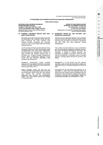 01020304050607 Consolidated Financial Statements Laporan Keaungan Konsolidasian PT Pertamina Hulu Energi 903The original consolidated financial statement included hereinare in Indonesian language.PT PERTAMINA HULU ENERGI DAN ENTITAS ANAK/AND SUBSIDIARIESDaftar 5/239 ScheduleCATATAN ATAS LAPORAN KEUANGANKONSOLIDASIAN (lanjutan)Tanggal 31 Desember 2024 dan untukTahun yang Berakhir pada Tanggal Tersebut(Disajikan dalam Ribuan Dolar Amerika Serikat,Kecuali Dinyatakan Lain)NOTES TO THE CONSOLIDATEDFINANCIAL STATEMENT (continued)As of December 31, 2024 andfor the Year Then Ended(Expressed in Thousands of United States Dollars,Unless Otherwise Stated)53. ESTIMASI CADANGAN MINYAK DAN GASBUMI (TIDAK DIAUDIT)53. ESTIMATED CRUDE OIL AND NATURAL GASRESERVES (UNAUDITED)Perusahan dan Anak Perusahaan tidak mempunyaihak kepemilikan atas cadangan minyak dan gas,tetapi mempunyai hak untuk menerima hasilproduksi dan/atau pendapatan dari penjualanminyak dan gas sesuai dengan KBH dan kontrakkerjasama lainnya.The Group has no ownership interests in the oil and gasreserves, but have the right to receive production and/orrevenues from the sales of oil and gas in accordancewith their PSCs and other production sharingarrangements.Jumlah cadangan terbukti (proved reserves) hanyamerupakan estimasi dan tidak dimaksudkan untukmenggambarkan nilai yang dapat direalisasikanatau nilai wajar dari cadangan Grup. Estimasi inidapat berubah bila tersedia informasi baru dikemudian hari. Terdapat berbagai ketidakpastianinheren dalam mengestimasi cadangan minyakmentah dan gas, termasuk faktor-faktor yangberada di luar kendali Grup.The quantity of proved reserves is only an estimationand is not intended to illustrate the realizable values orfair values of reserves attributable to the Group. Thisestimation is subject to change whenever newinformation is available in the future. There are manyinherent uncertainties in estimating crude oil and gasreserves, including factors beyond the control of theGroup.Manajemen berkeyakinan bahwa kuantitascadangan termasuk bagian Pemerintah merupakanestimasi yang wajar berdasarkan data geologi danteknik yang tersedia saat ini.Management is of the opinion that the reservesquantities, which include the Government%u2019s shares arereasonable based on available geological and technicaldata.Angka cadangan minyak dan gas bumi per31 Desember 2024 yang disajikan berikut ini berasaldari perhitungan internal Grup dan hasil estimasiyang dihitung oleh konsultan perminyakanindependen yaitu DeGolyer and MacNaughton(D&M) untuk posisi proved reserves per tanggal31 Desember 2024.The figures for oil and natural gas reserves as ofDecember 31, 2024 which are presented below arederived from the Group's internal calculations and theestimation results calculated by independent petroleumconsultants, DeGolyer and MacNaughton (D&M), forproved reserves position as of December 31, 2024.