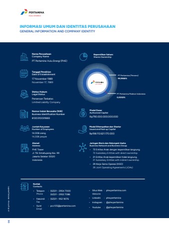 INFORMASI UMUM DAN IDENTITAS PERUSAHAANGENERAL INFORMATION AND COMPANY IDENTITYNama PerusahaanCompany NamePT Pertamina Hulu Energi (PHE)Modal DasarAuthorized CapitalRp790.000.000.000.000Modal Ditempatkan dan DisetorIssued and Paid-up CapitalRp198.112.621.170.000Tanggal PendirianDate of Establishment17 November 1989November 17, 1989Status HukumLegal StatusPerseroan TerbatasLimited Liability CompanyNomor Induk Berusaha (NIB)Business Identification Number8120310031883AlamatAddressPHE TowerJl. TB. Simatupang Kav. 99 Jakarta Selatan 12520IndonesiaJumlah KaryawanNumber of Employees14.008 orang14,008 peopleJaringan Bisnis dan Kelompok UsahaBusiness Network and Business Group%u2022 72 Entitas Anak dengan kepemilikan langsung.72 Subsidiary Entities with direct ownership.%u2022 21 Entitas Anak kepemilikan tidak langsung.21 Subsidiary Entities with indirect ownership.%u2022 29 Kerja Sama Operasi (KSO)29 Joint Operating Agreements (JOAs)Kepemilikan SahamShares OwnershipPT Pertamina (Persero)99,9968%PT Pertamina Pedeve Indonesia0,0032%KontakContacts%u2022 TeleponPhone: (62)21 - 2954 7000(62)21 - 2952 7086%u2022 FaksimiliFax: (62)21 - 952 9076%u2022 SurelEmail: pcc135@pertamina.com%u2022 Situs WebWebsite: phe.pertamina.com%u2022 LinkedIn : phe.pertamina%u2022 Instagram : @phe.pertamina%u2022 Youtube : @phe.pertaminaHULU ENERGILaporan Tahunan %u2022 Annual Report 90HULU ENERGI